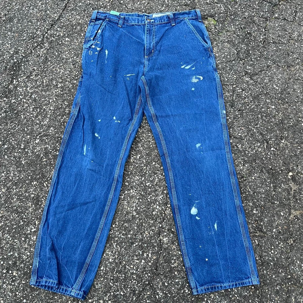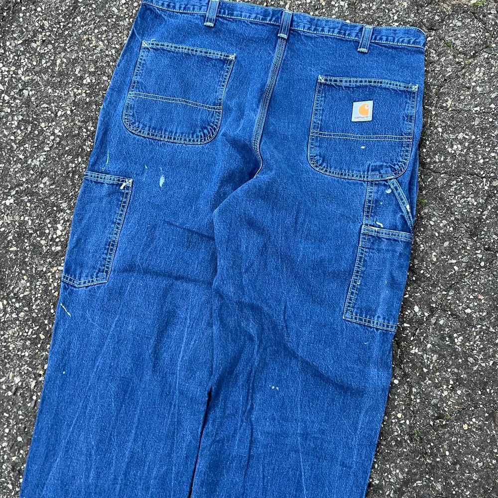 Vintage Y2K Carhartt blue denim jeans work wear carpenter pants. Great pair. Measure 38x34 and a 9.25 leg opening. Please check measurements before purchasing. I do my best to show any flaws in pictures. Quick shipping! Bundles encouraged! @ants_haul on Instagram. 418!!!