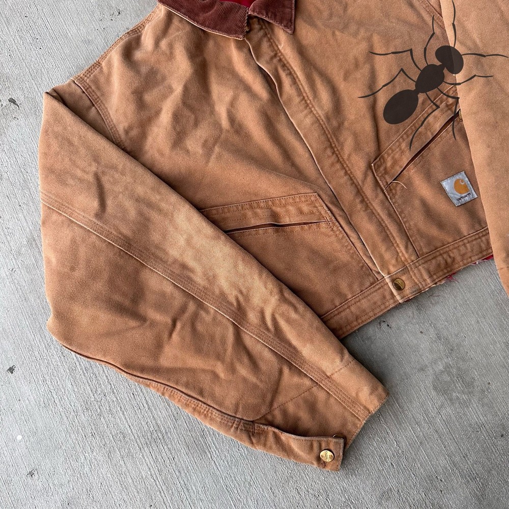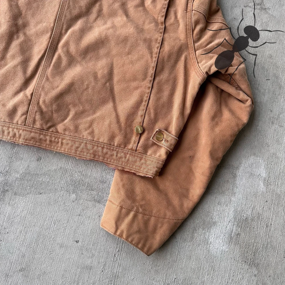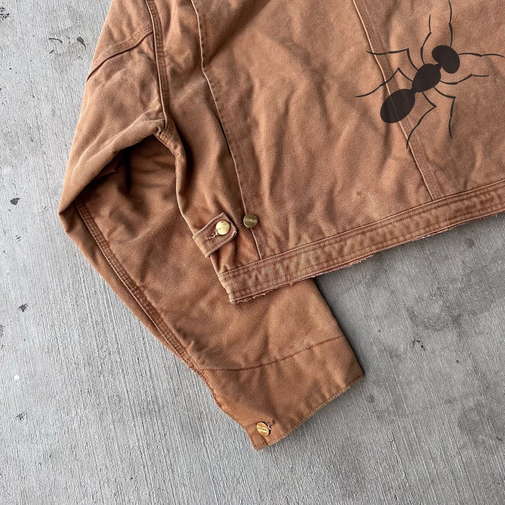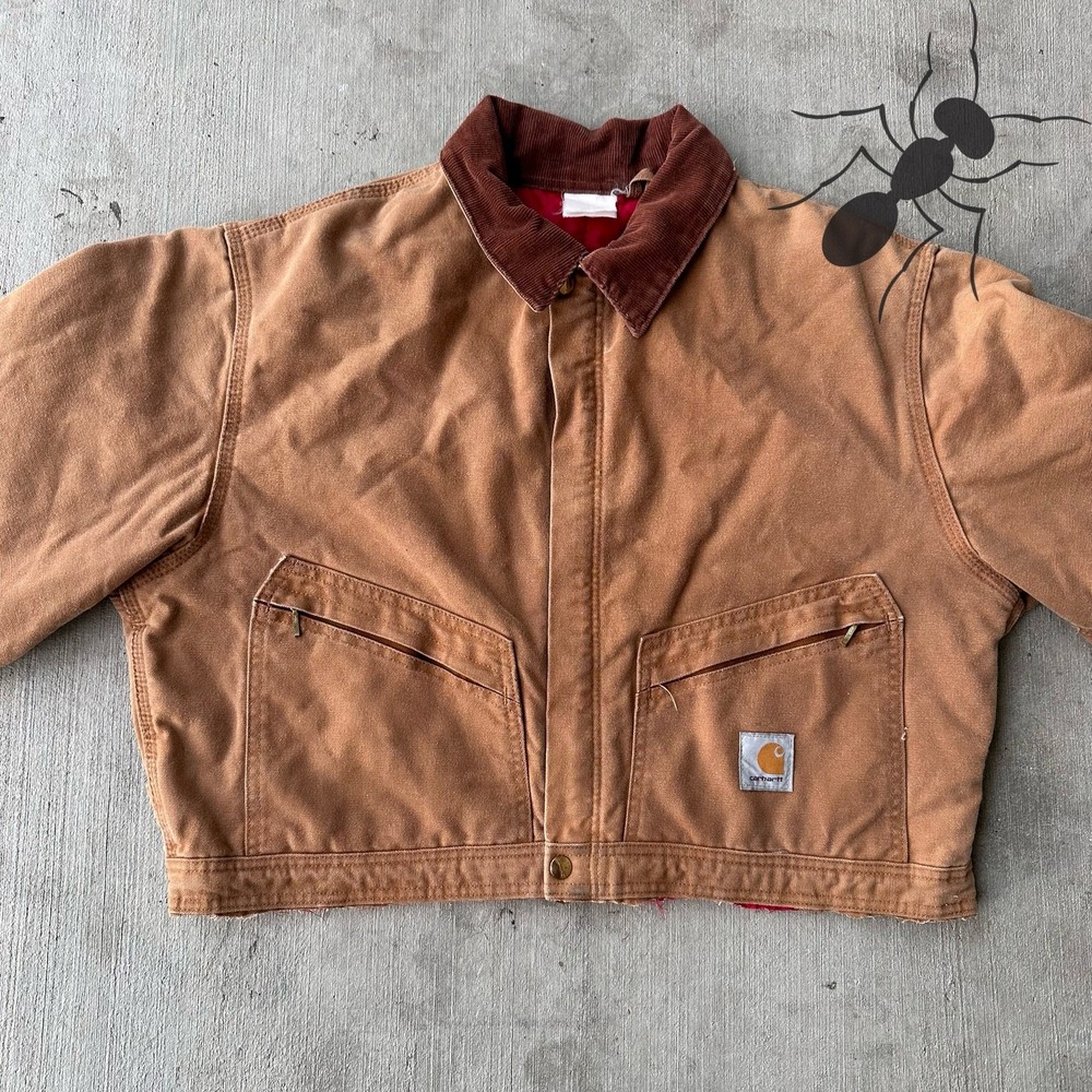 Vintage Y2K Carhartt brown cropped Detroit style work wear jacket. CUT FROM COVERALLS SO THE ZIPPER DOES NOT WORK!!! Measures 25.5x21. Please check measurements before purchasing. I do my best to show any flaws in pictures. Quick shipping! Bundles encouraged! @ants_haul on Instagram. J0162!!!
