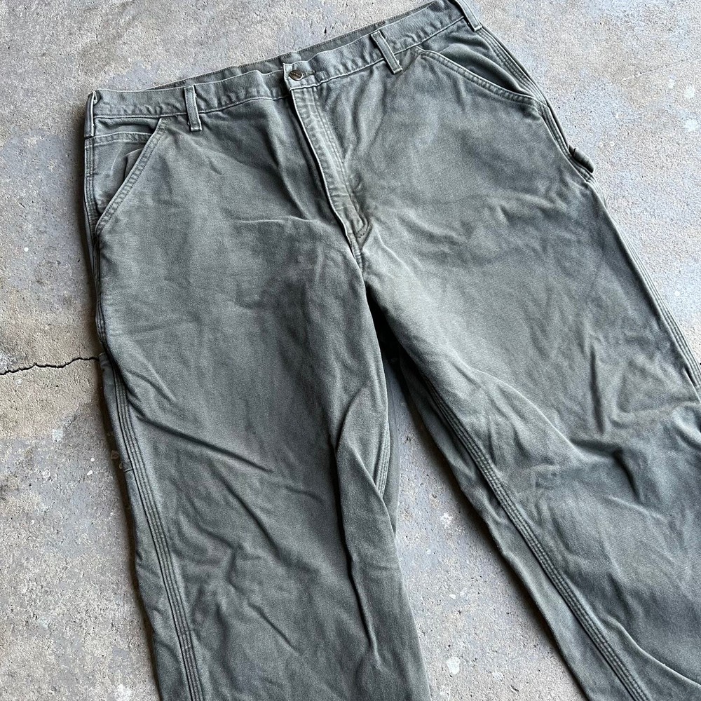 Vintage Y2K Carhartt flannel lined green work wear carpenter pants. Great pair! Nice and warm. Measure 38x33 and a 9.75 leg opening. Please check measurements before purchasing. I do my best to show any flaws in pictures. Quick shipping! Bundles encouraged! @ants_haul on Instagram. 443!!!