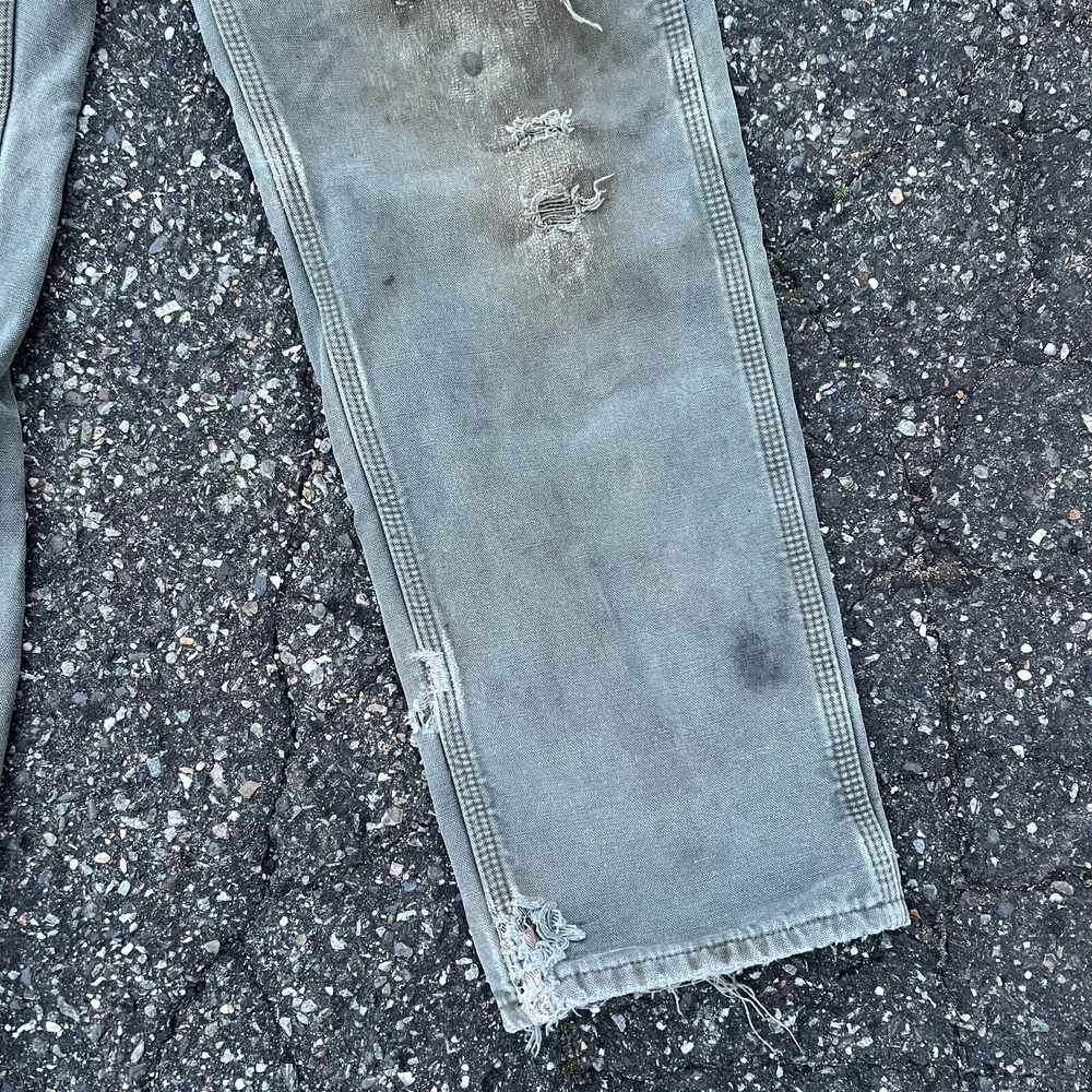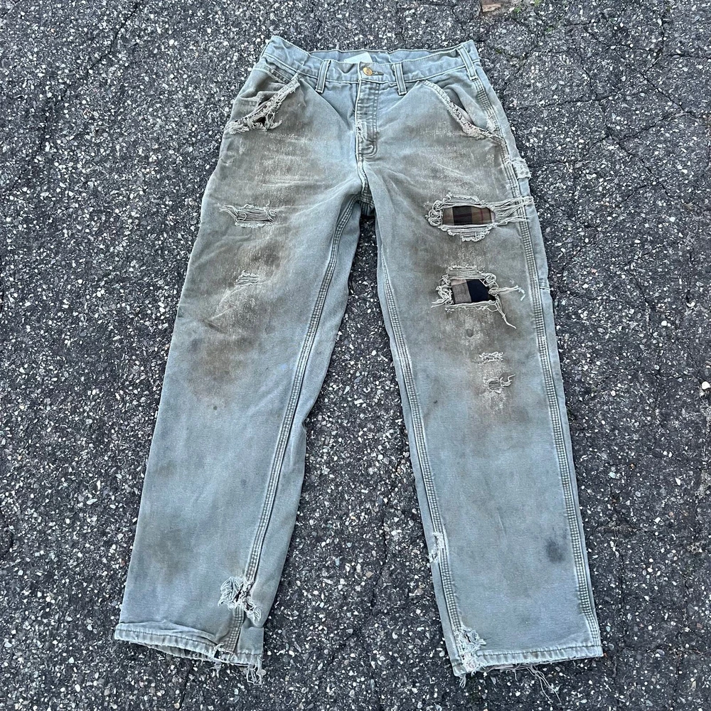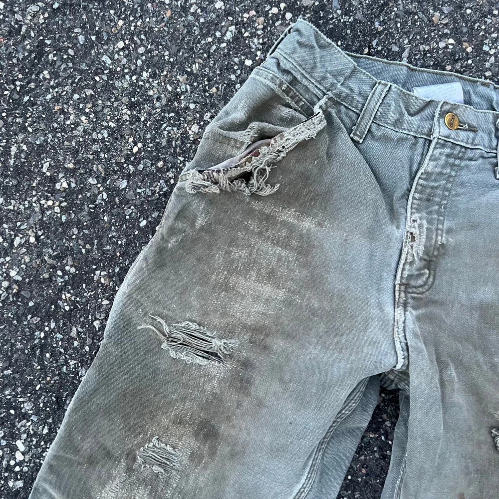 Vintage Y2K Carhartt mos flannel lined dirty green work wear carpenter pants. Clearly have stains hahahah please just be ready to wash these ones. Kinda smell too. Measure 30x30 and a 8.75 leg opening. Please check measurements before purchasing. I do my best to show any flaws in pictures. Quick shipping! Bundles encouraged! @ants_haul on Instagram. 408!!!