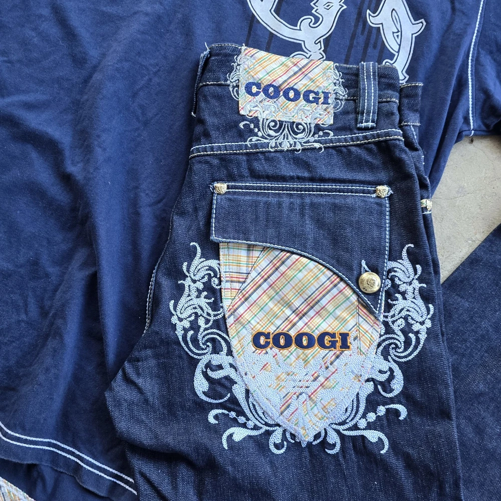 Vintage Y2K Coogi 90’s Baggy Hip Hop Skate Embroidered Flap Jeans Shirt Set In good vintage condition! Shirt; Size 3x A little cracking in graphic, please check out the photos Chest: 27 Length: 33 Pants: Size 34 x 34 Waist; 17 Length: 42 Inseam: 33