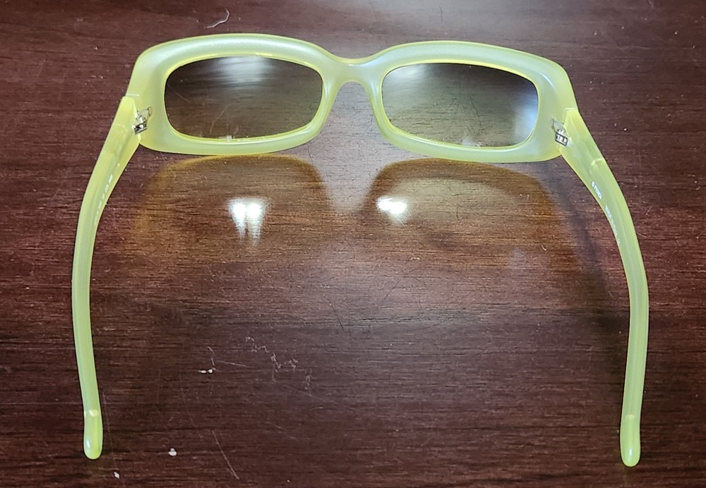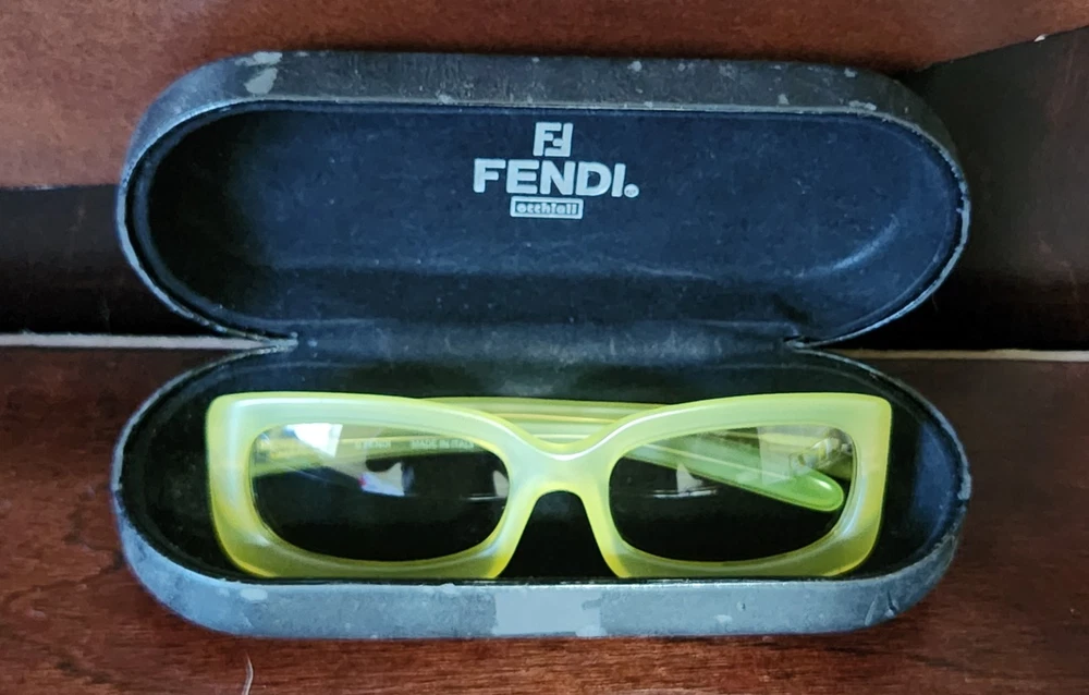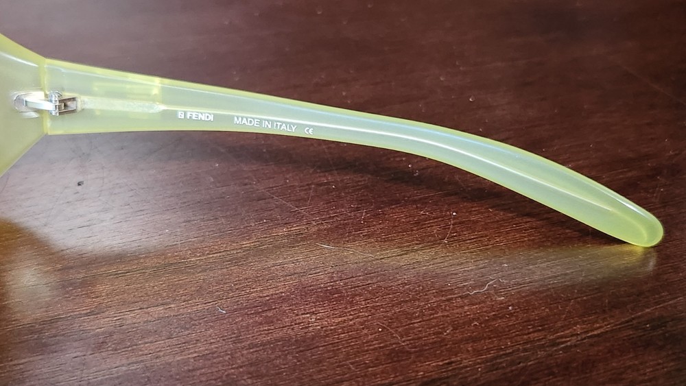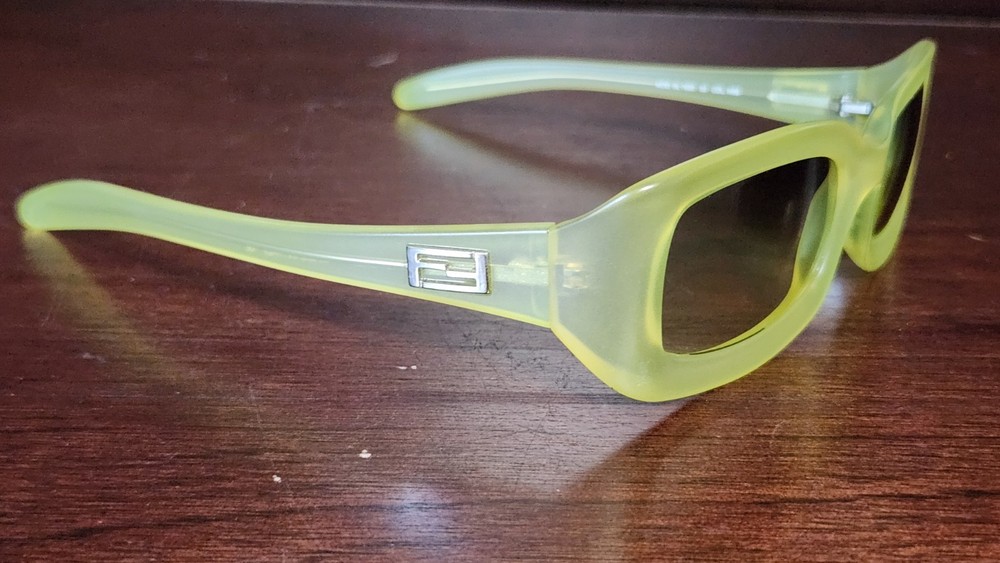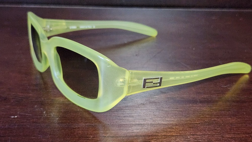These Vintage Y2K Women's Green Fendi Sunglasses are a luxurious designer accessory that exudes style and sophistication. Made in Italy, these sunglasses feature tinted and polarized black lenses set within a geometric frame of green plastic. The Fendi brand adds a touch of glam, while the vintage design adds a timeless appeal. Perfect for ladies looking to make a fashion statement with a classic piece that is both chic and functional. Complete with a case for safekeeping, these sunglasses are a must-have for any fashion-forward individual.