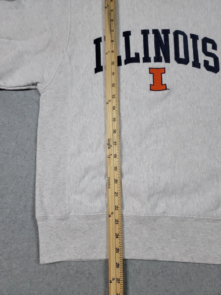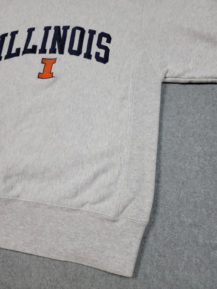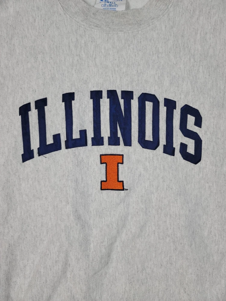 Collar has a very light stain. The product is a vintage gray Champion reverse weave sweatshirt in size S, officially licensed by the NCAA for the Illinois Fighting Illini football team. It is a Y2K era item made in El Salvador and is suitable for both male and female adults.