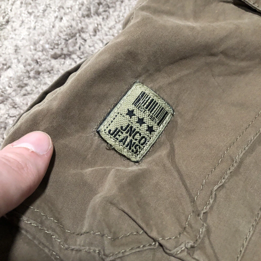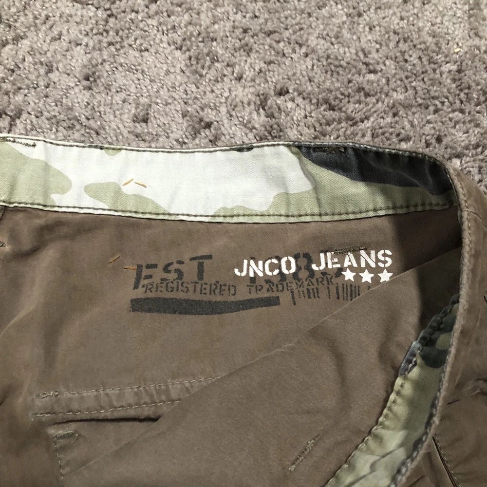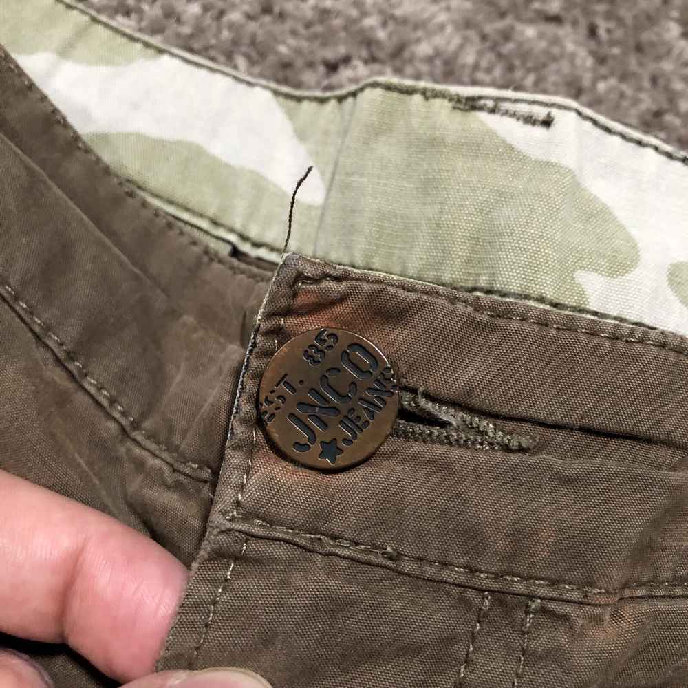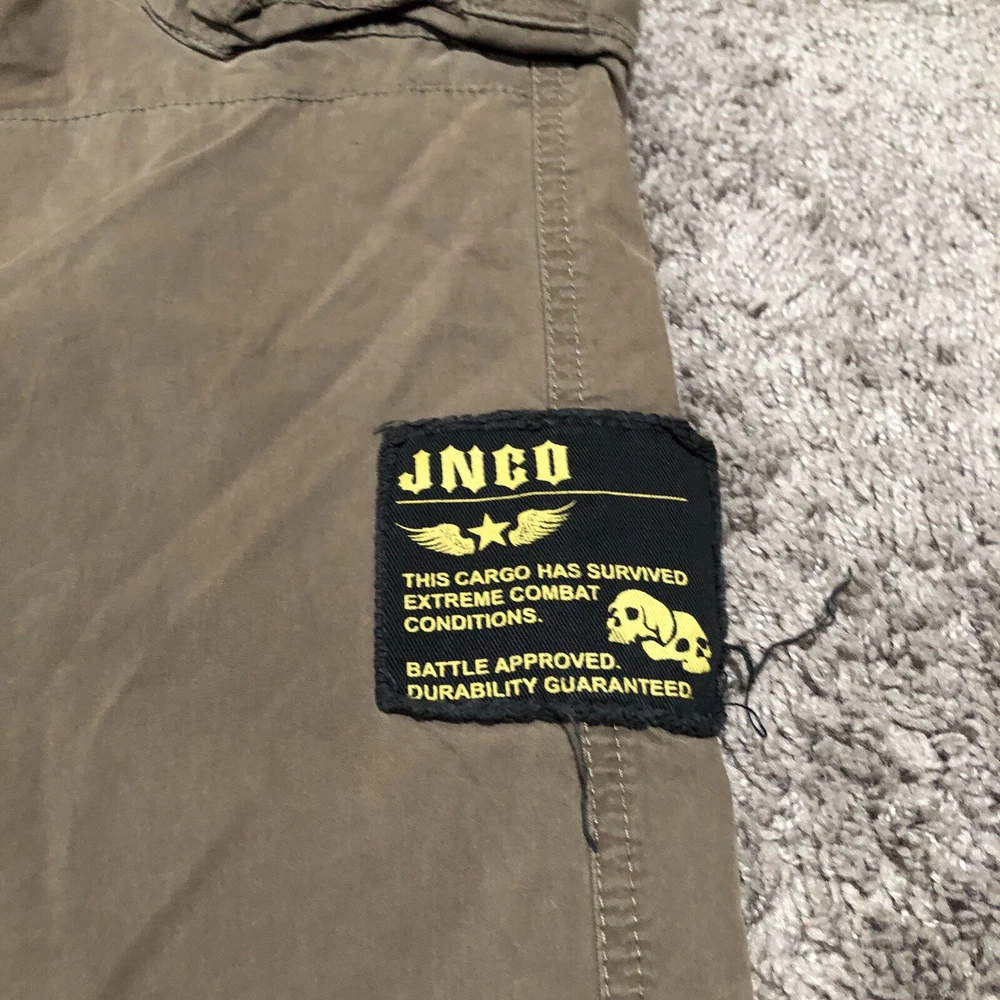 Vintage Y2K JNCO Jeans Baggy Army Cargo Pants Men’s 38x32 Brown LA Unit Skull Preowned Small grease spot on leg, and bottoms at ankle are cut some on the back. Hole starting at crotch bottom, could use patching up. A couple bleach spots on back and front waist. See pictures for overall condition Have some nice army style designs and patches Please see pics and ask questions before purchasing Thanks!