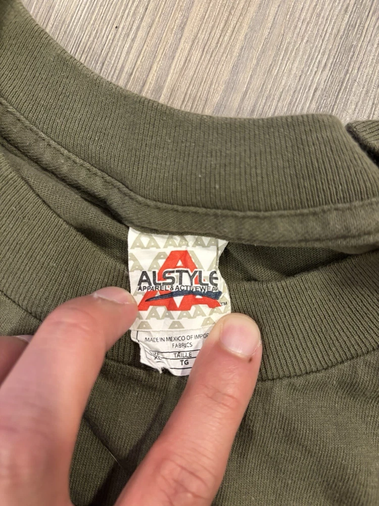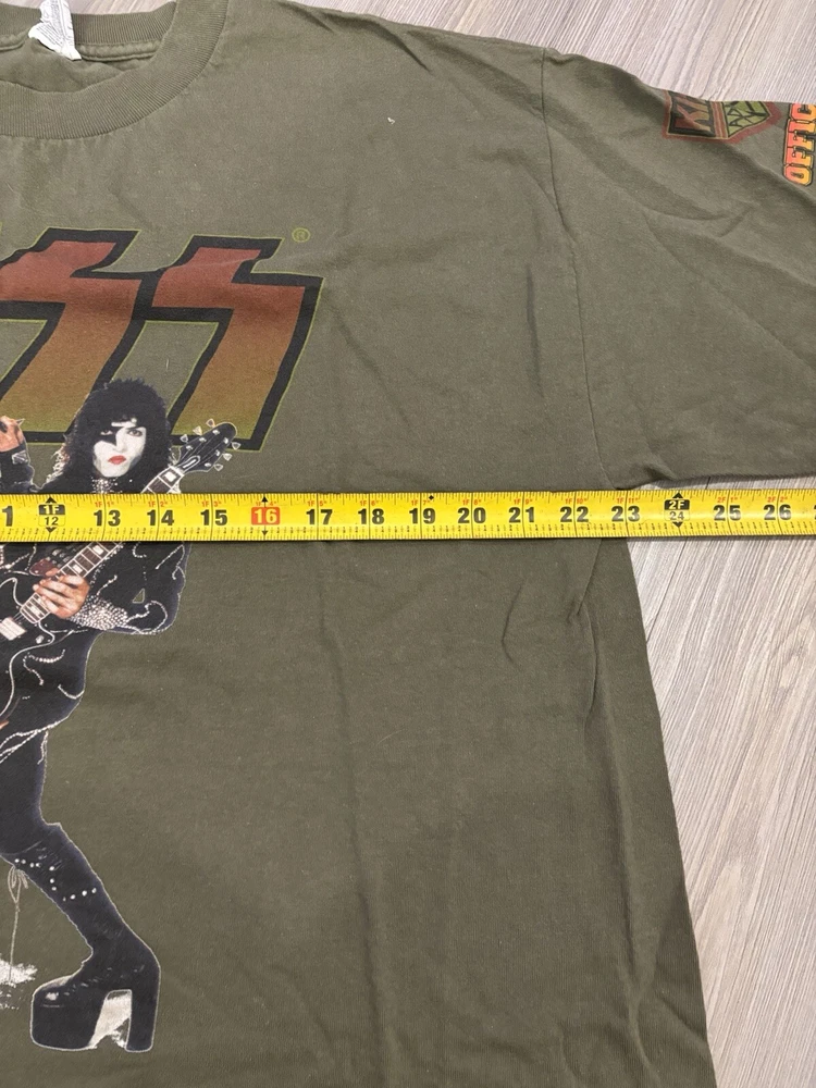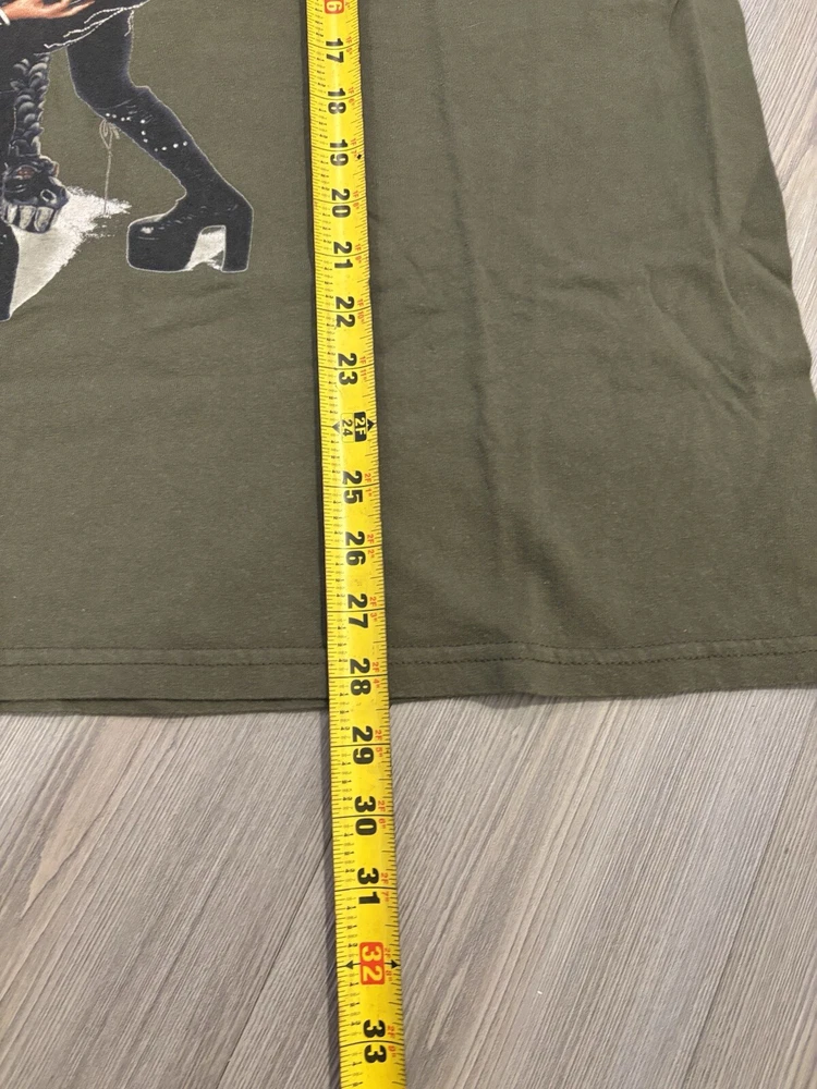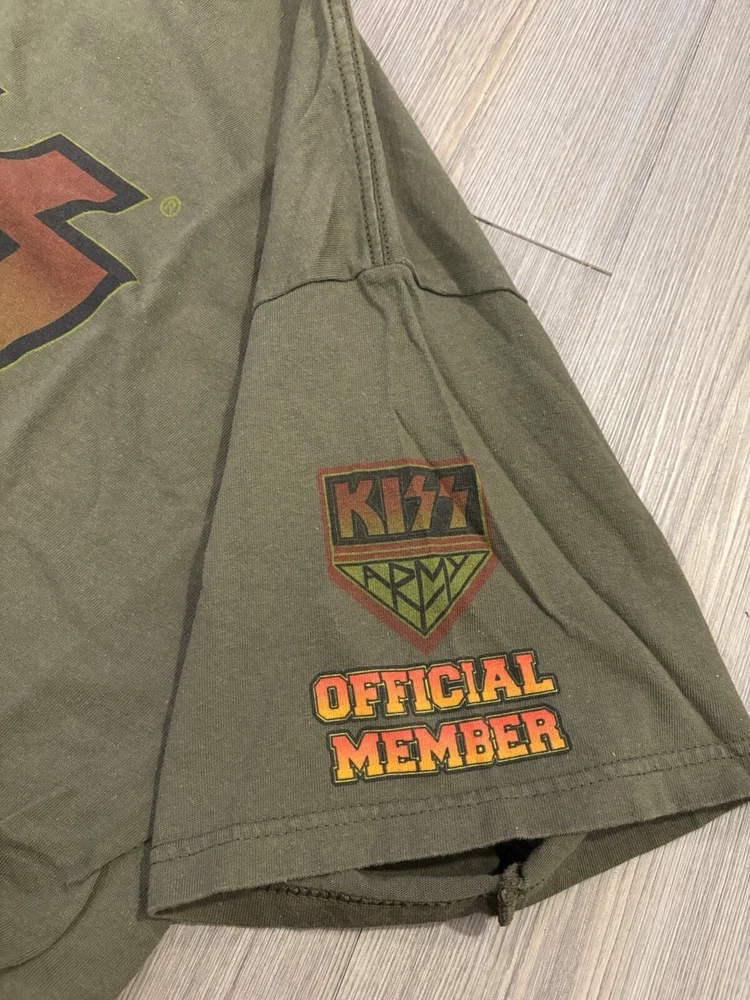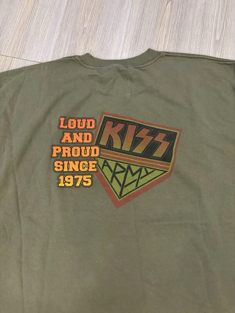 Embrace the classic vibes with our Vintage Y2K Kiss Army Double Sided Graphic Tee. Crafted from comfortable cotton knit, this men's size large t-shirt features a timeless crew neck design and short sleeves perfect for any season. Whether you're reminiscing the rock anthems of the early 2000s or just love a good band-inspired apparel, this shirt is a versatile addition to your wardrobe. Sporting a vivid green hue, the tee showcases a distinctive KISS Army logo that commands attention while celebrating your music taste. It's a regular fit for a relaxed feel, and being machine washable, it ensures easy care for its limited edition status. Whether you're out for a casual meet-up or enjoying a concert revival at home, this t-shirt is your go-to for making a statement with a nod to the iconic era of Y2K music and style.