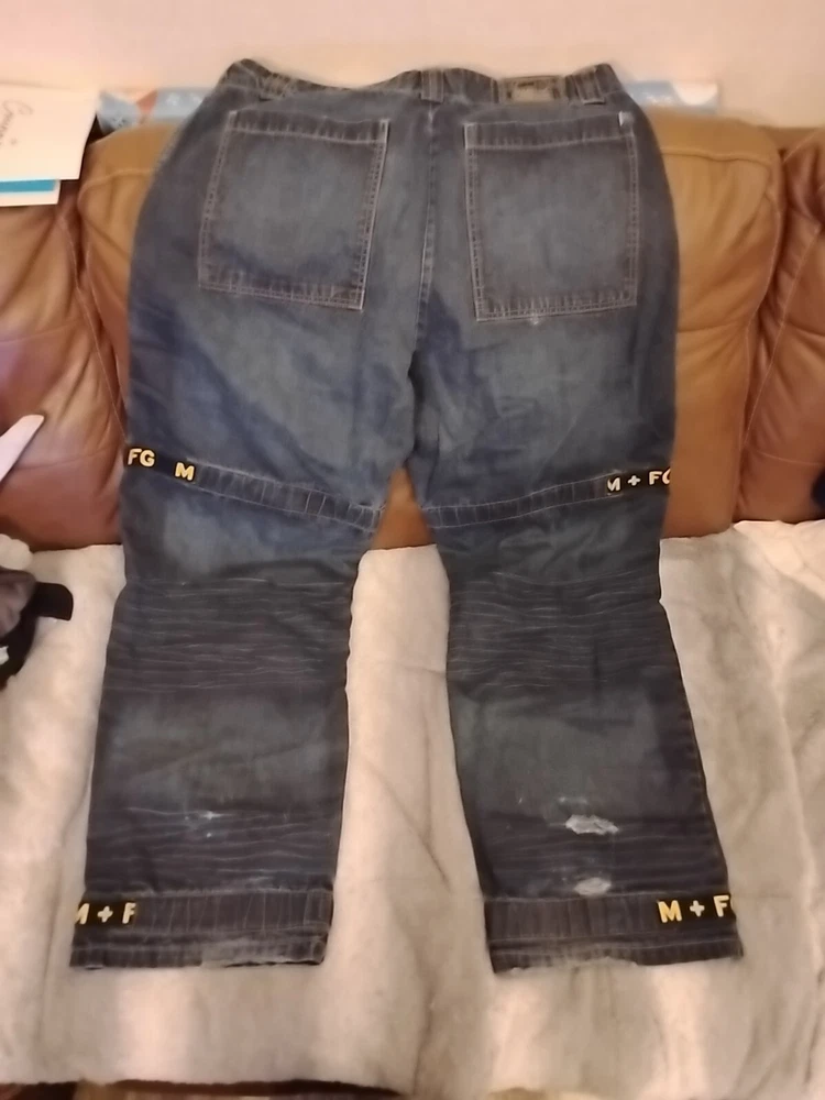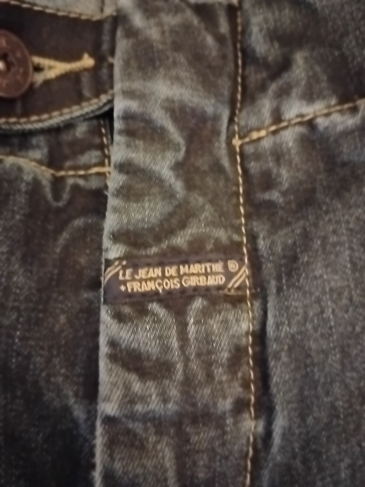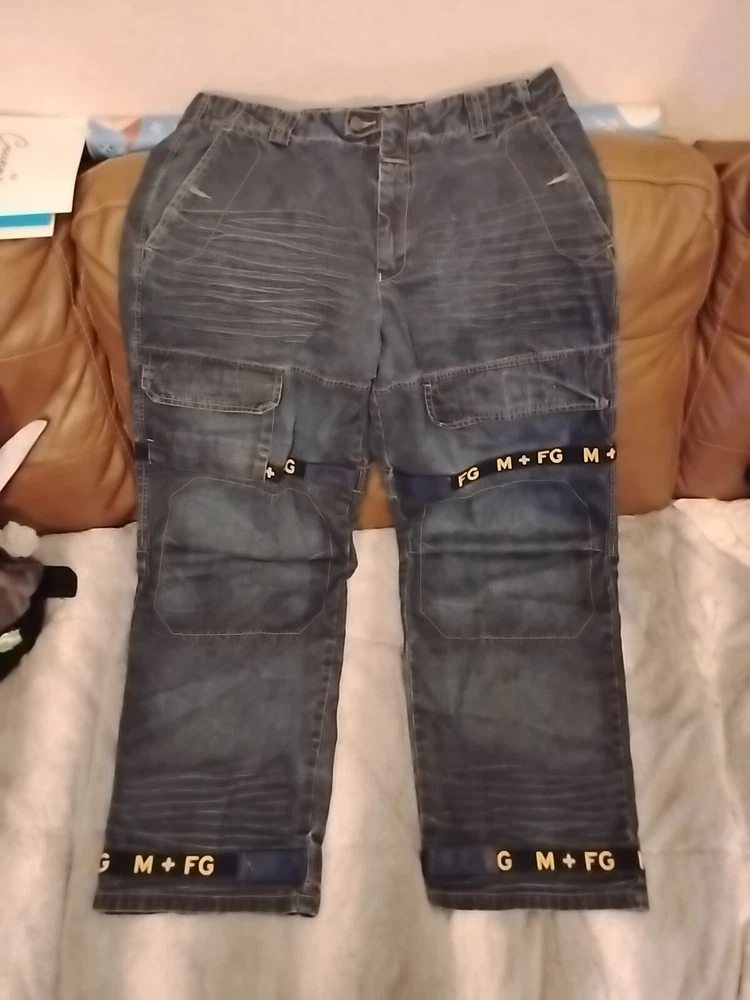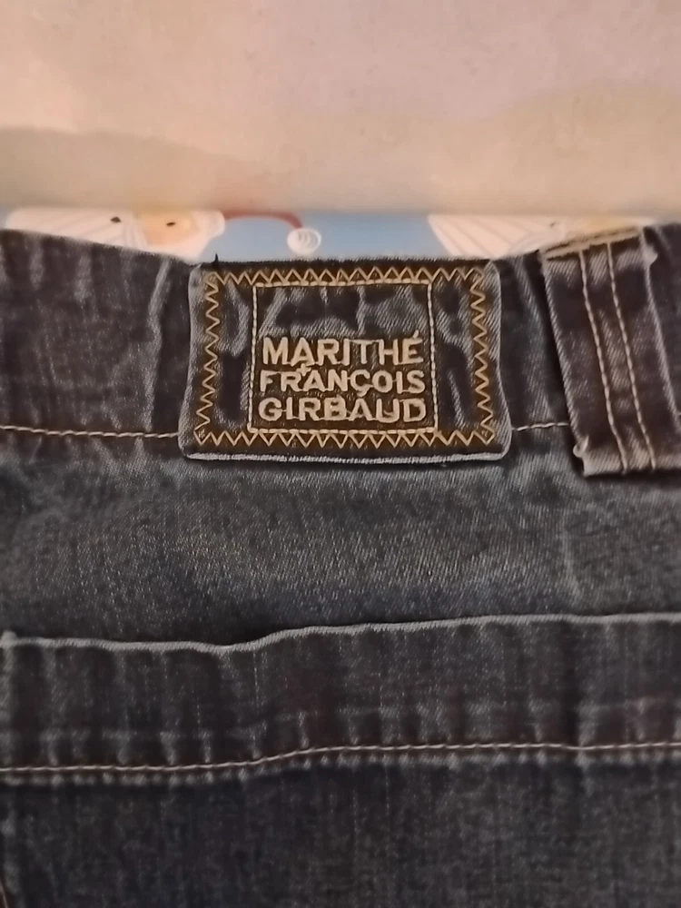 Elevate your vintage wardrobe with these Marithe Francois Girbaud denim jeans. With a solid blue and gold color, these wide-leg jeans feature a relaxed fit and 6-pocket denim design. The closure is a zip, and it has accents such as buttons, straps, zipper, and logo. These Y2K Girbaud jeans are perfect for the grunge and 90s theme. Made of denim and cotton material, these jeans are easy to care for and offer comfort and pockets as features. The inseam is 34 inches, and the waist size is 38 inches, making it ideal for big and tall men. These jeans are machine washable in cold water only and should not be dried. Jeans have minor issues to write back leg refer to pictures for details, however these girbaud jeans are in excellent condition and a great addition to any fan of girbaud and the 1990s grunge style of America. These are shipped from us to us. Thank you for your interest.