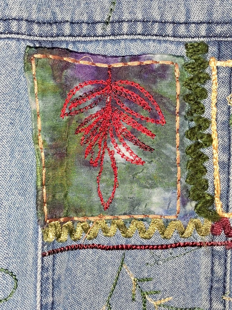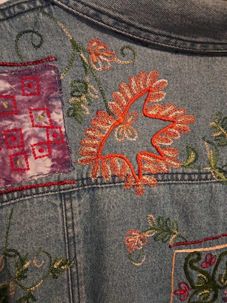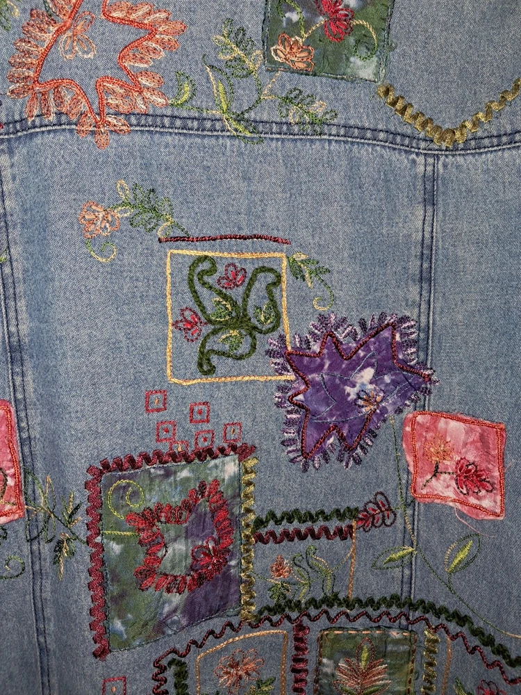 This vintage Coldwater Creek jacket is a unique piece that features a patchwork of floral embroidered denim. The jacket has a short length with long sleeves and a collared neckline. It is made of cotton outer shell material with a polyester lining and insulation material. The jacket is decorated with button closure and decorative buttons that add a bohemian touch to the overall look. The jacket is a regular fit and is available in petite size. This item is a must-have for any vintage clothing enthusiast.