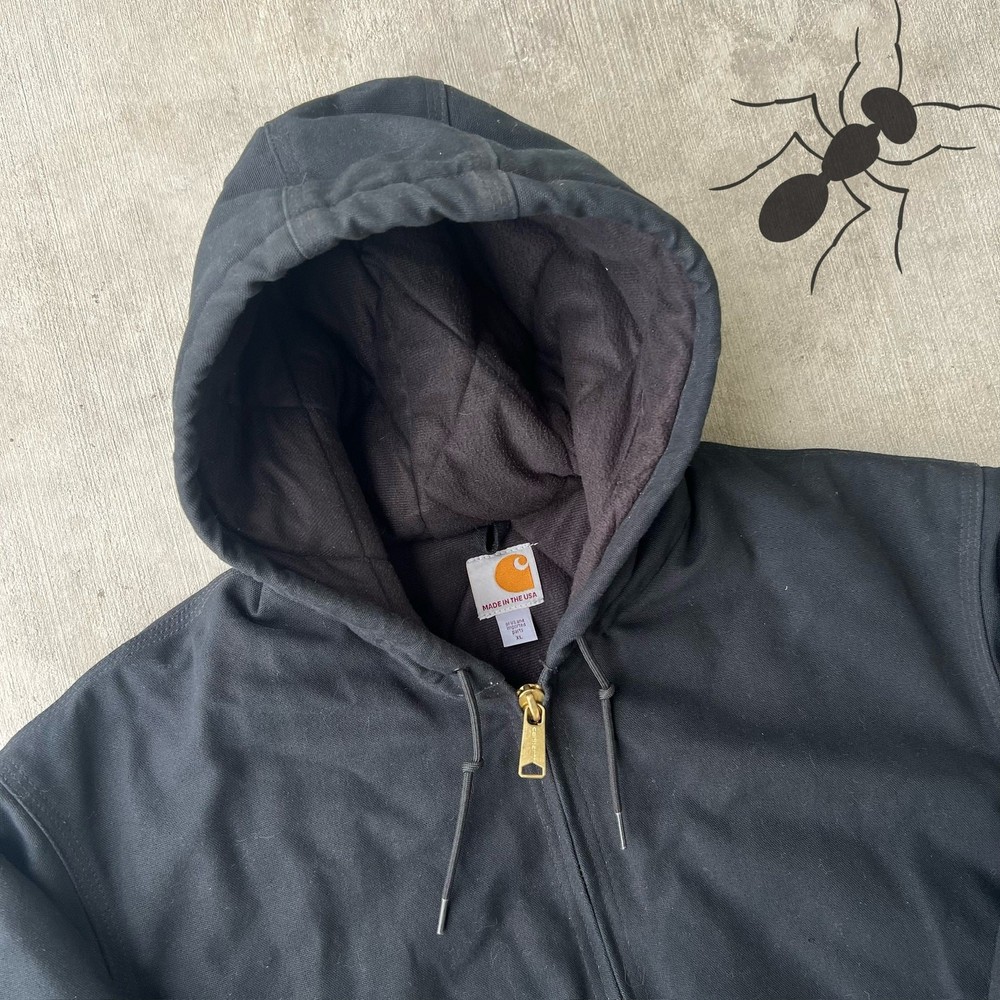 Vintage Y2K black Carhartt hooded quilted work wear jacket. Great one! Measures 29x29.5. Please check measurements before purchasing. I do my best to show any flaws in pictures. Quick shipping! Bundles encouraged! @ants_haul on Instagram.