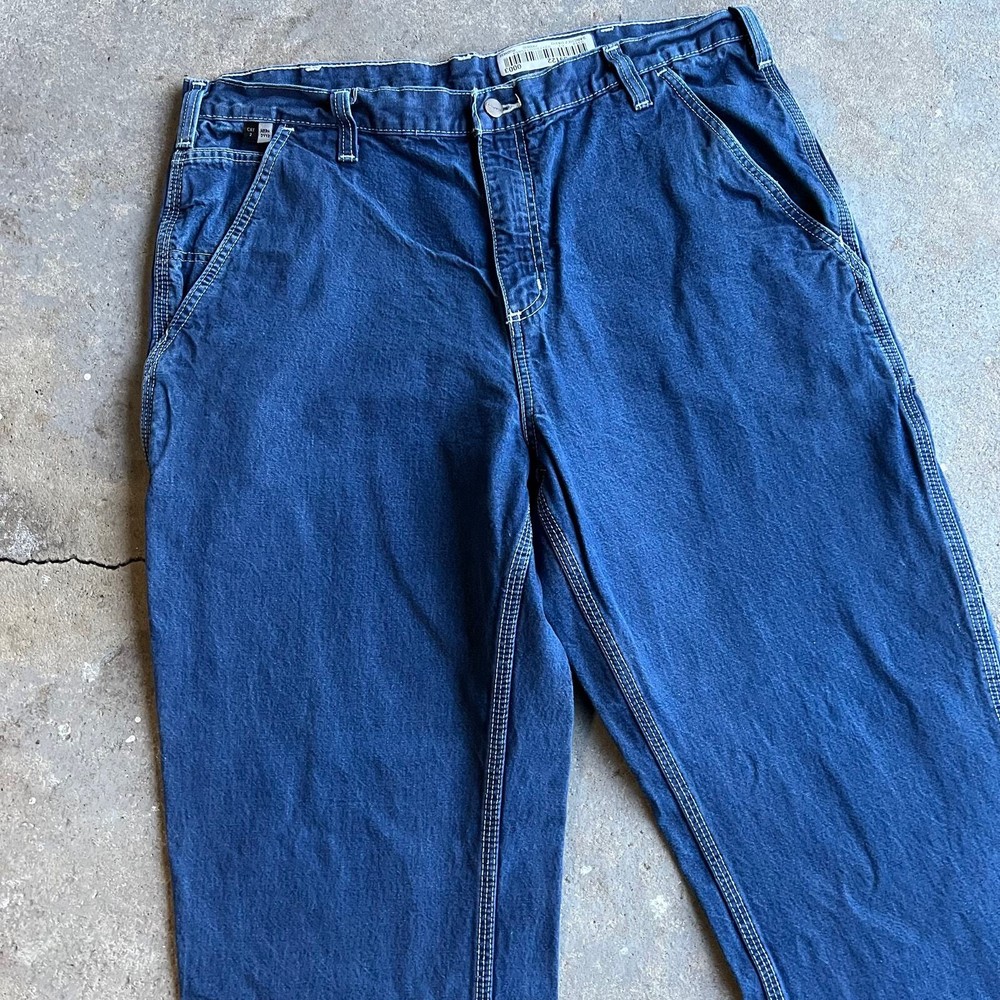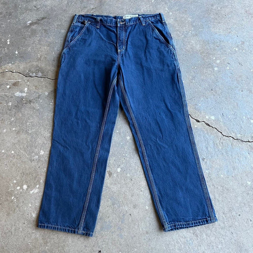 Vintage Y2K blue denim jeans Carhartt work wear carpenter pants. Great pair. Good color. Measure 38x30.5 and a 9.5 leg opening. Please check measurements before purchasing. I do my best to show any flaws in pictures. Quick shipping! Bundles encouraged! @ants_haul on Instagram. 449!!!