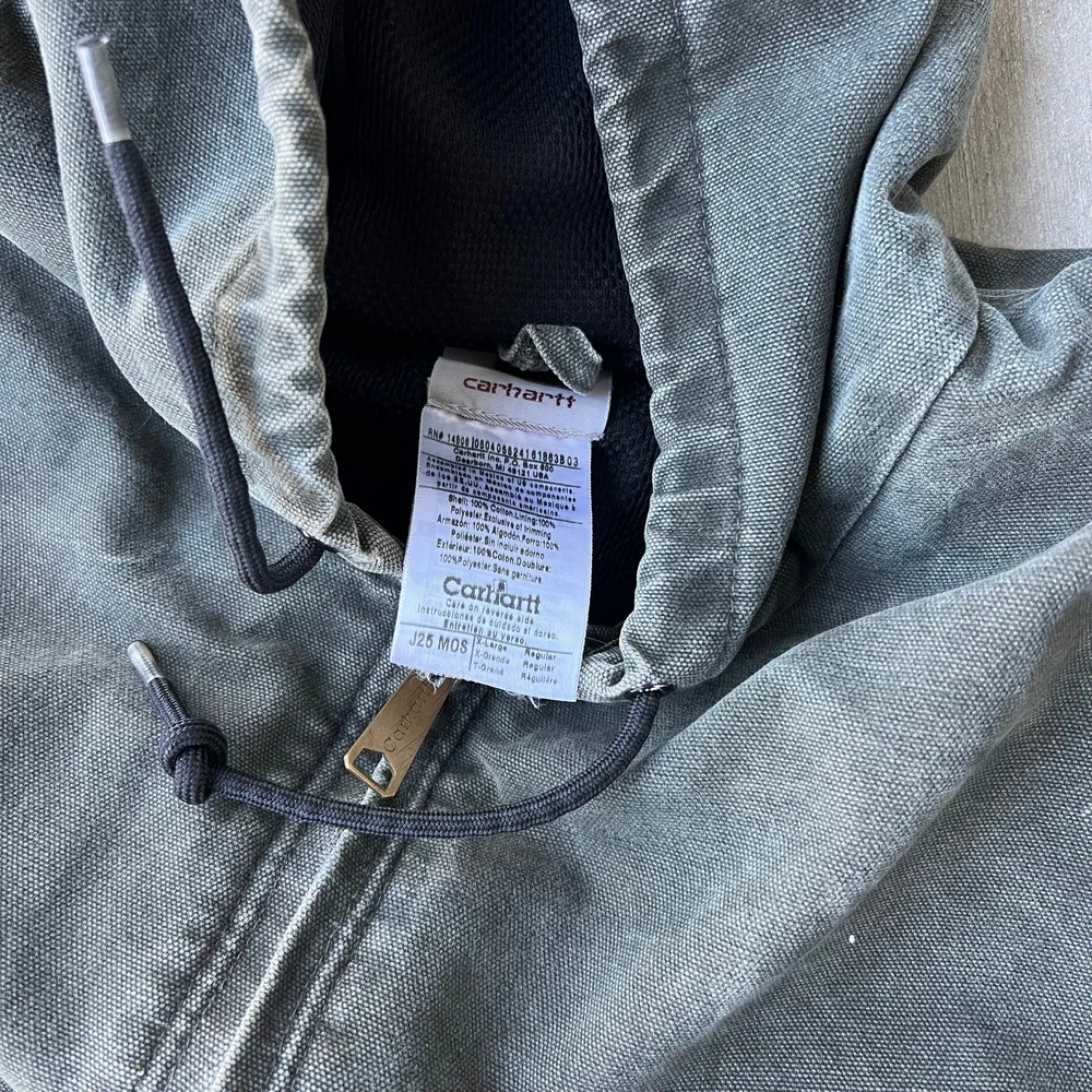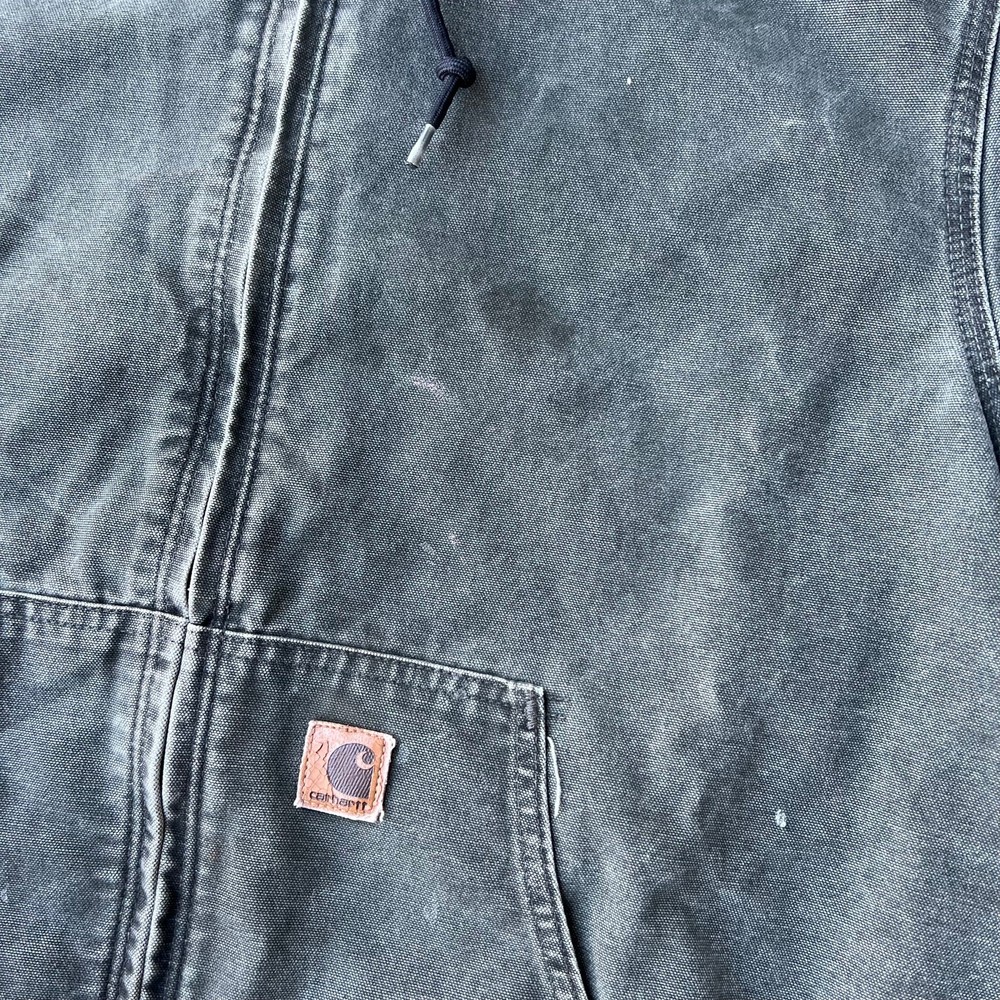 Vintage y2k active green mos carhartt hooded work wear jacket. Really nice jacket! Has some staining but nothing overly crucial. Light lining. Measures 27.5x28. Please check measurements before purchasing. I do my best to show any flaws in pictures. Quick shipping! Bundles encouraged! @ants_haul on Instagram.