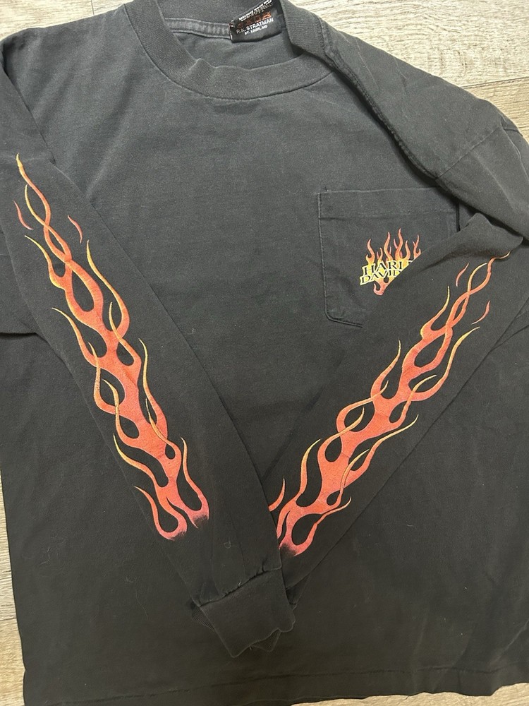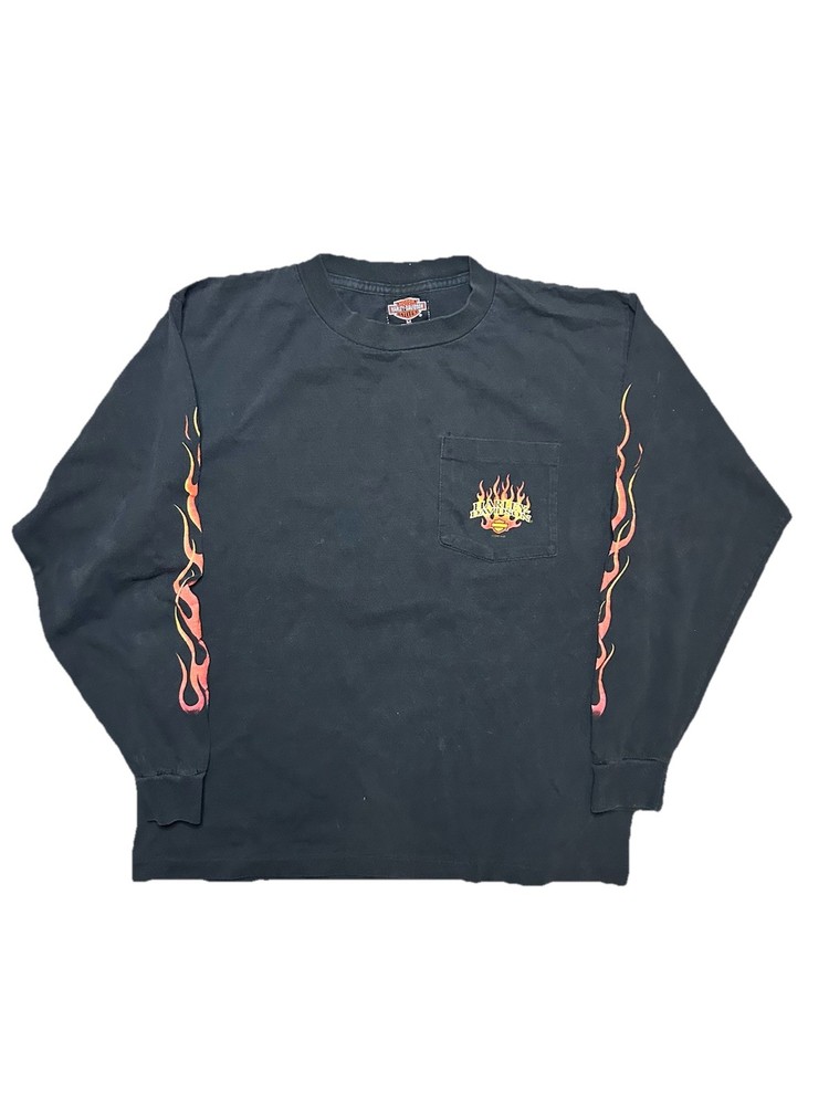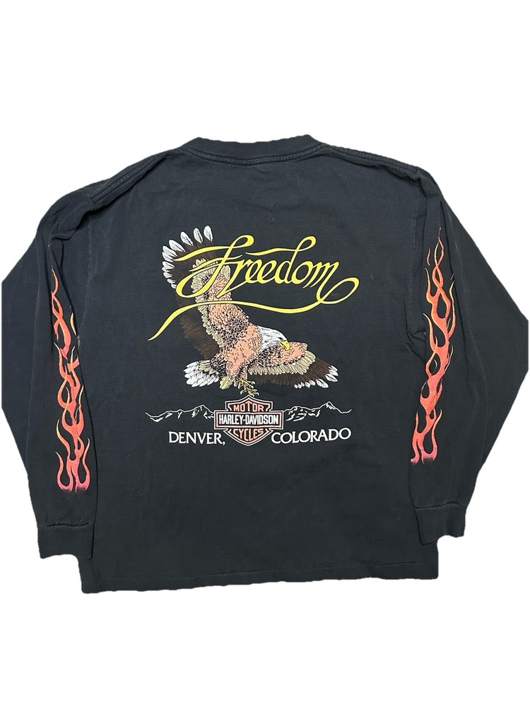 Vintage Y2k 2000 Single Stitch Harley Davidson Denver Colorado Flying eagle Flame long sleeve t-shirt. No flaws. Great piece sick iconic front, back and sleeve graphics. Dm me any questions or concerns! Will ship fast! Tagged size Medium Measurements 20in Pit to pit 25.5in Top to bottom 21.5in Sleeve Length