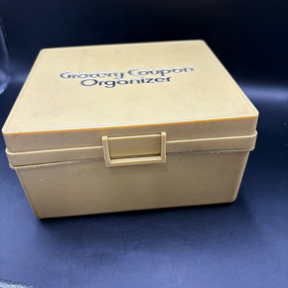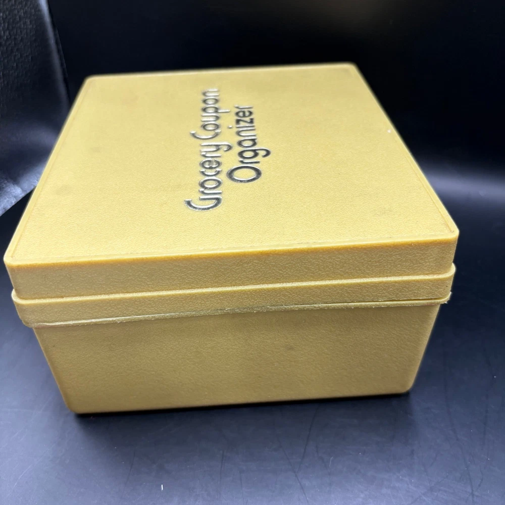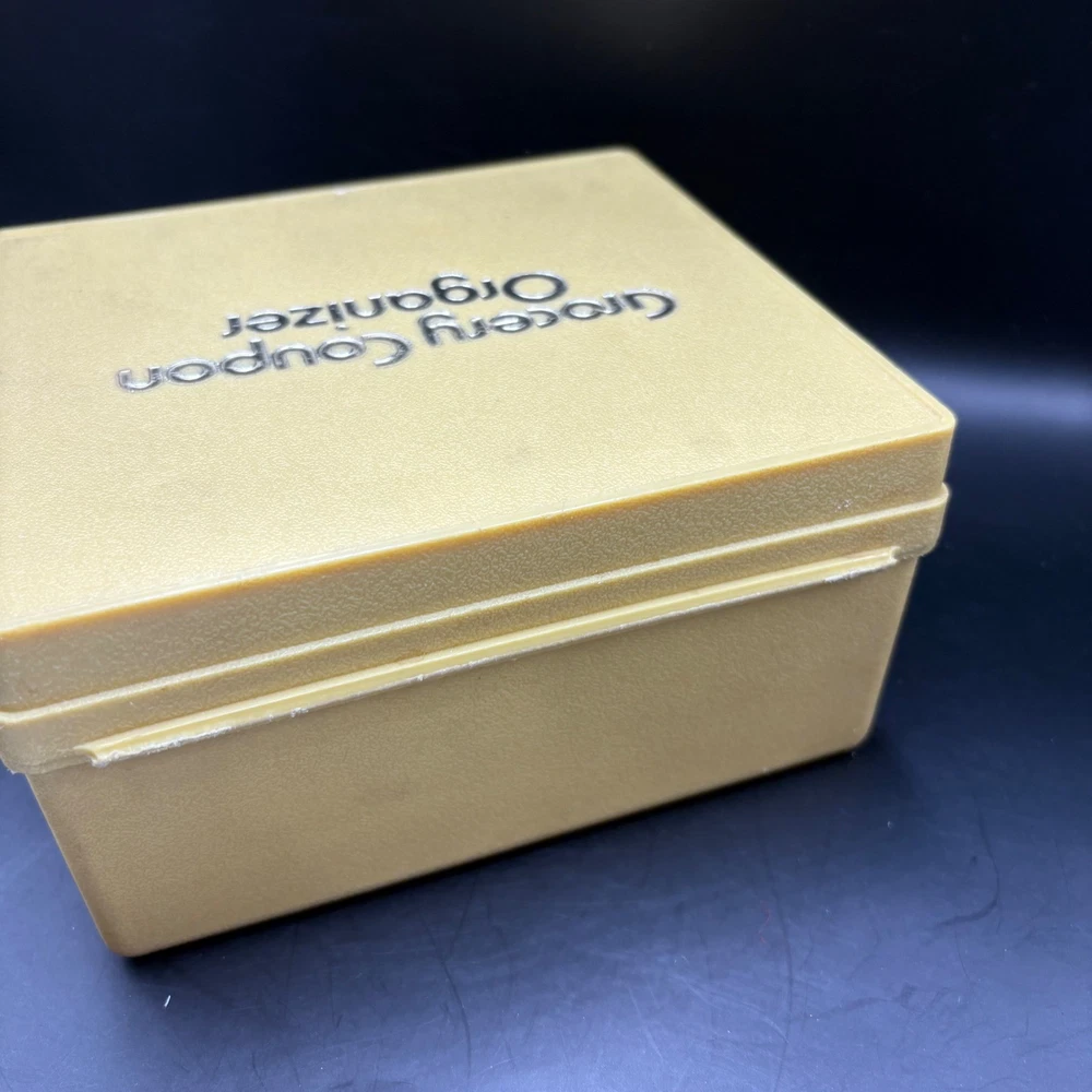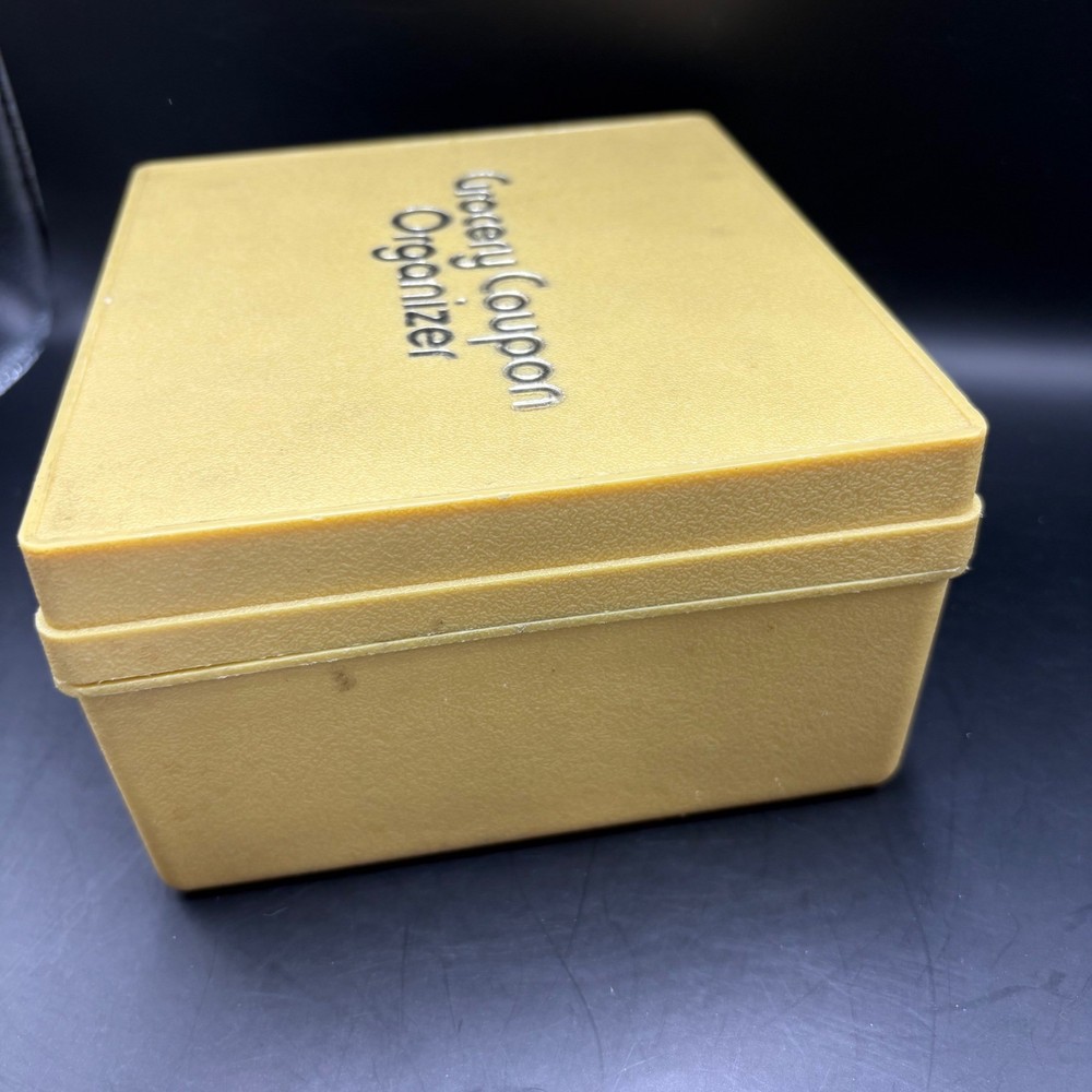A vintage grocery coupon organizer, designed to keep your savings in order. This box-style container features a hinged lid and a secure latch closure, ensuring your coupons stay neatly stored and easily accessible. The organizer is labeled with "Grocery Coupon Organizer" on the top, making it easy to identify. A practical and nostalgic piece for any home. Keywords: coupon organizer, grocery coupon box, vintage coupon holder, coupon storage, coupon container, retro kitchen, vintage storage, yellow organizer, plastic coupon box, coupon keeper, coupon collection, home organization, kitchen storage