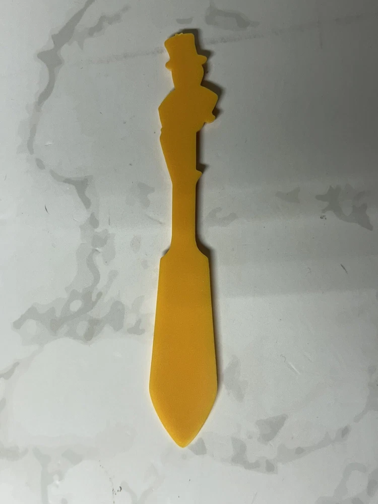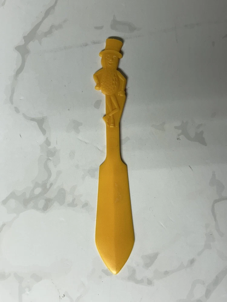 This vintage letter opener/spreader is a must-have for any fan of Planters Nuts. The bright yellow color and classic design make it a perfect addition to any collection. The item features the iconic Mr. Peanut character and is made of durable plastic, ensuring it will last for years to come. Perfect for display or use, this rare piece of advertising memorabilia is a great find for collectors or anyone who loves candy and nuts. Don't miss your chance to own this unique piece of history.