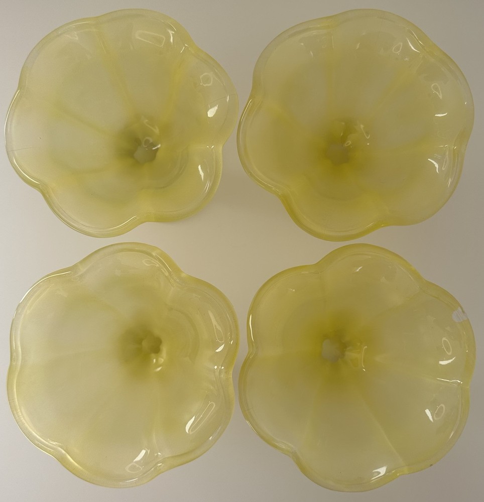 The Vintage Ice Cream Sundae Frosted Yellow Tulip Glass Dessert Cup from Italy exudes Mid-Century Modern charm with its yellow hue and matte finish. This set of 4 sundae cups, crafted in the 1950s, adds a touch of elegance to any table setting. Perfect for serving up delicious ice cream treats, these vintage cups are a timeless piece of Italian glassware that brings a touch of retro flair to your home decor. *one of the cups is slightly chipped, as shown on the last two pictures***