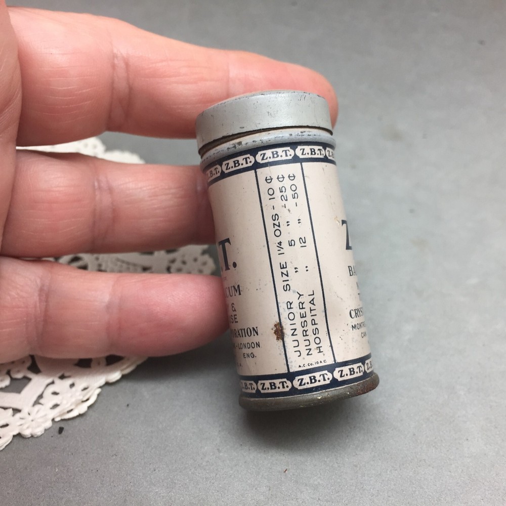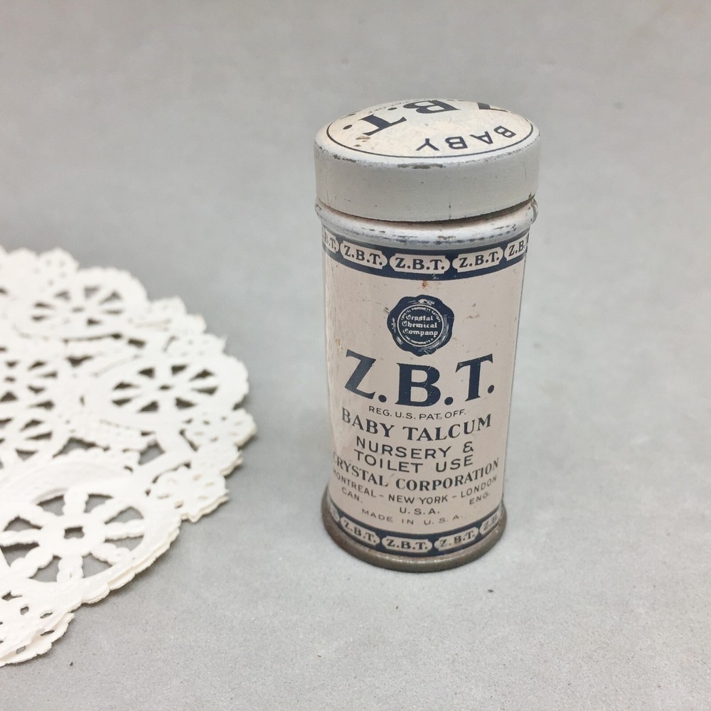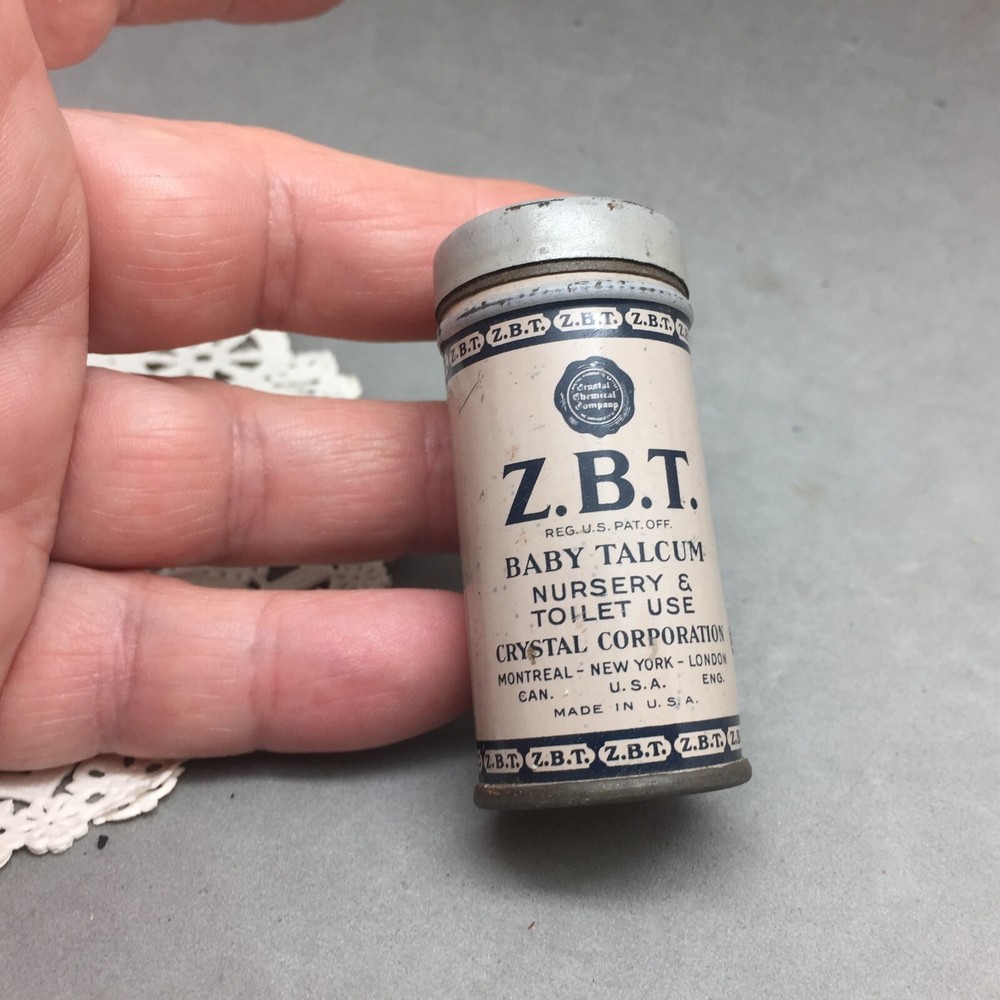 Vintage Z.B.T Baby Talcum Powder Tin Crystal Corporation 2 1/8" Mini Sample Can This is a vintage Z.B.T Baby Talcum Powder mini sample can with product but it is old so I am selling as a collectible and not for use. The can measures 2 1/8" tall x 1" diameter. The maker is "Crystal Corporation, Montreal, New York, London". This is an old item...check the price list on the side of the can! The can has everyday wear, scratches, scuffs and a small dent. My photos are of the actual item you are getting. See our store for other interesting advertising tins. PAYMENT DETAILS: Buyer must furnish seller with "ship to " address that matches the address registered on ebay. Payment is expected within 3 days after close of auction. SHIPPING DETAILS: If package is less than 13oz it will be sent First Class. If package is over 13oz to 5 lbs it will be sent Priority Mail. If package is over 5 lbs it will be sent Priority Mail or Retail Ground. Book packages less than 5oz will be sent First Class. Book packages over 5oz will be sent Media Mail. We usually ship within 24 hours of payment (weekend & holidays excluded). Please contact us if you prefer another method of shipping. We are happy to combine multiple items to save shipping costs (if items can be put together). RETURNS: Buy with confidence. We provide a money back guarantee if you are not satisfied (minus shipping cost). Prompt return of item insures prompt refund. Items must be sent back within 5 days after return request. Returns must be shipped by an insured carrier. INTERNATIONAL BUYERS: You may qualify for a cheaper rate. We accept only PayPal. If you need more details contact us. Thank you for looking.