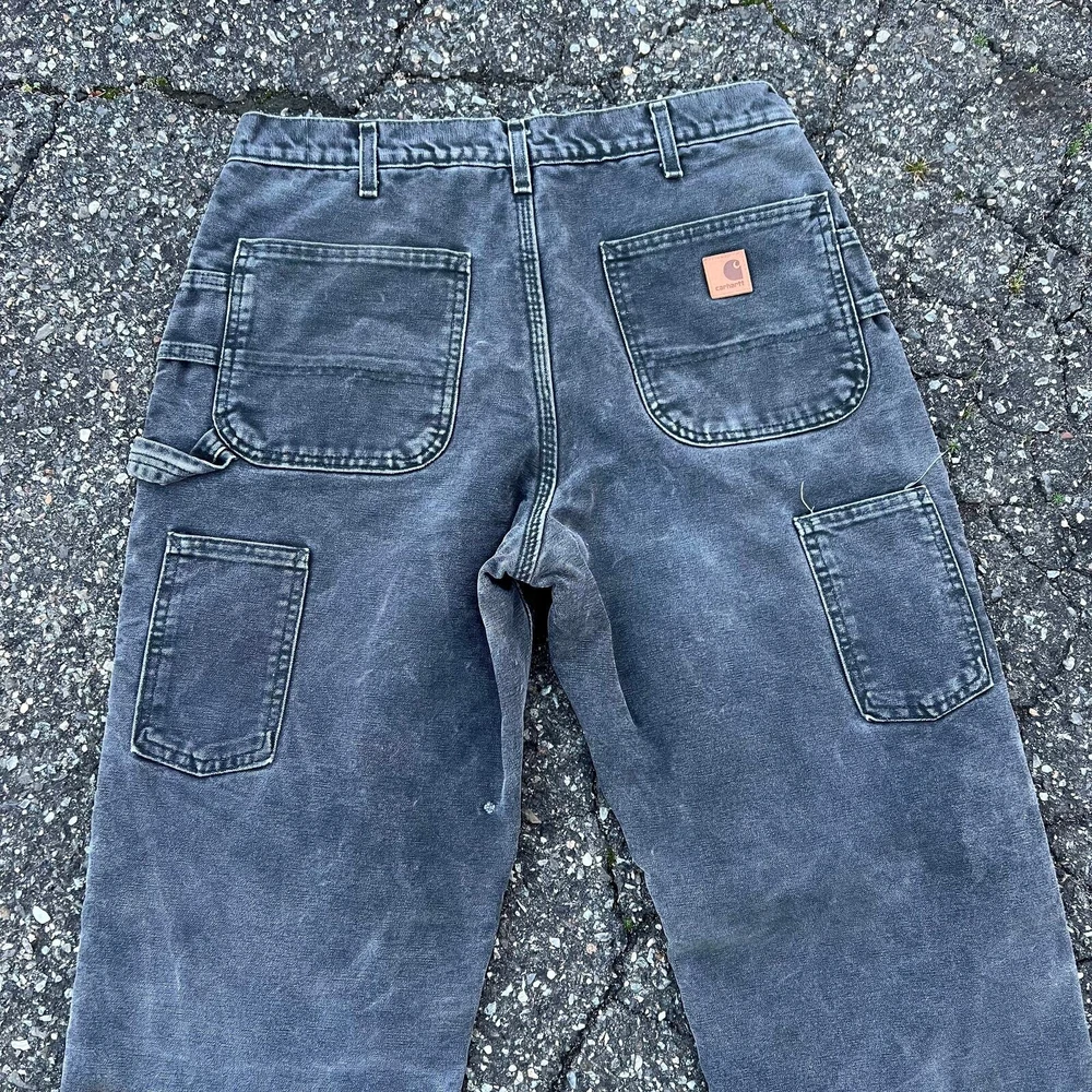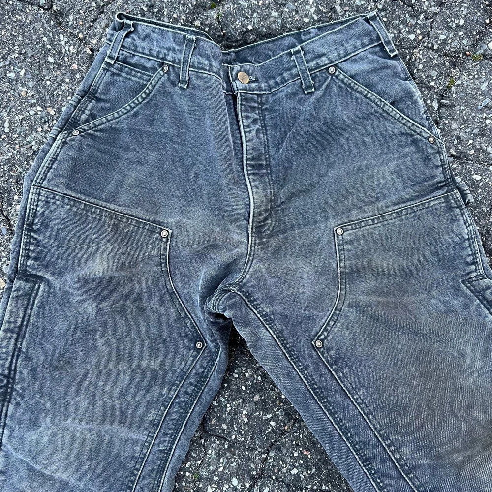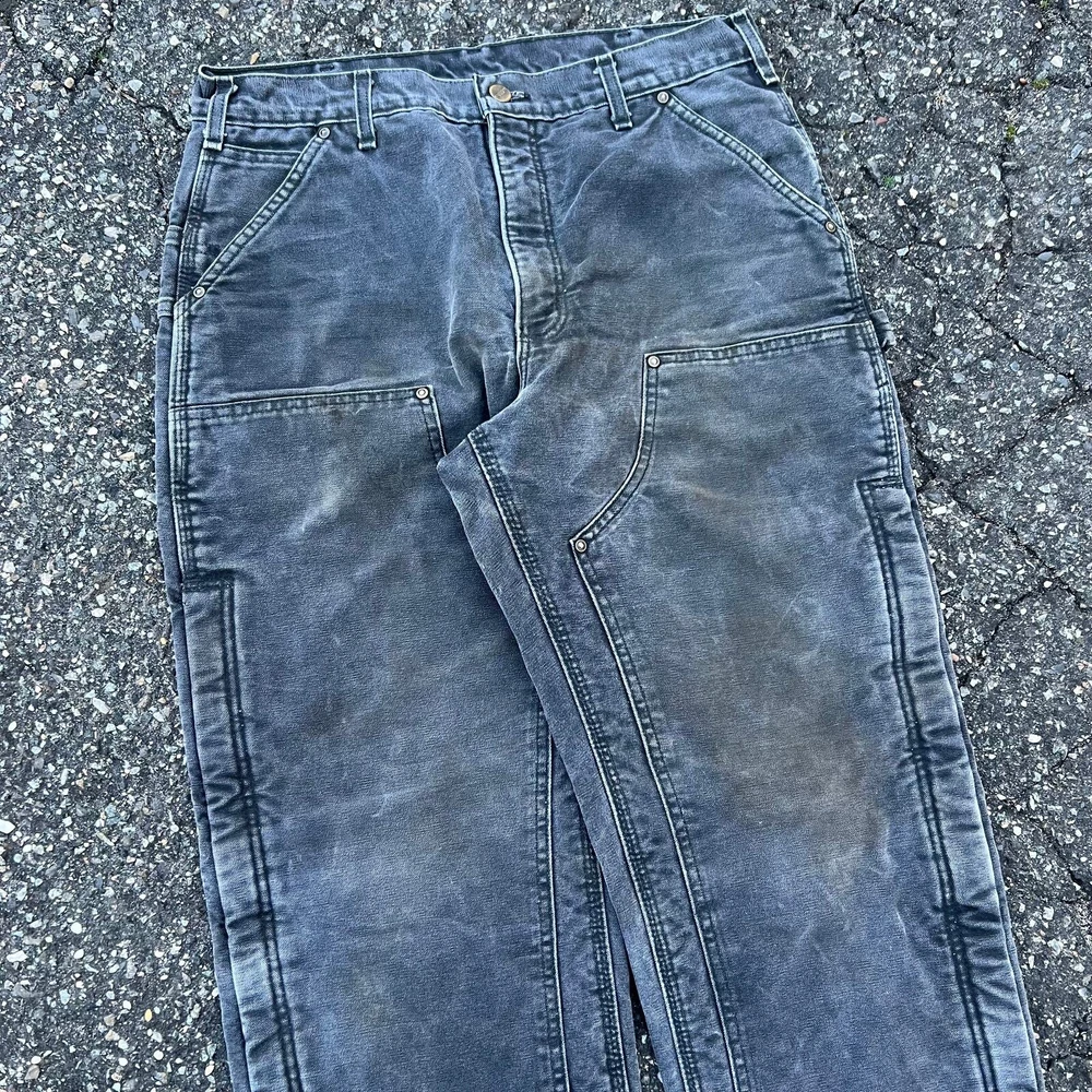 Vintage carhartt faded black lined double knee work wear carpenter pants. Great pair. Measure 33x33 and a 9.25 leg opening. Please check measurements before purchasing. I do my best to show any flaws in pictures. Quick shipping! Bundles encouraged! @ants_haul on Instagram. 349!!!