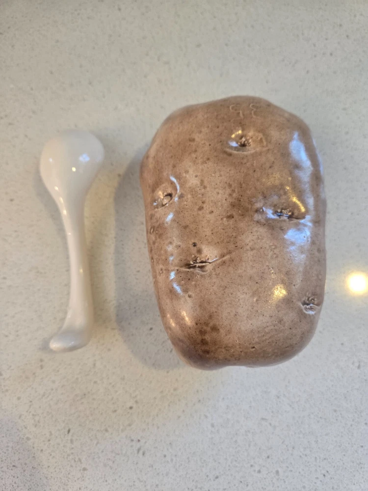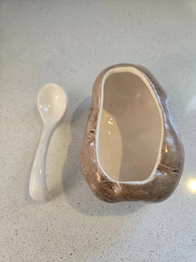 Vintage and super kitschy ceramic baked potato bowl with spoon. Use it for gravy, sour cream or any other baked potato condiment. Cute for a casual get together with a group of friends.