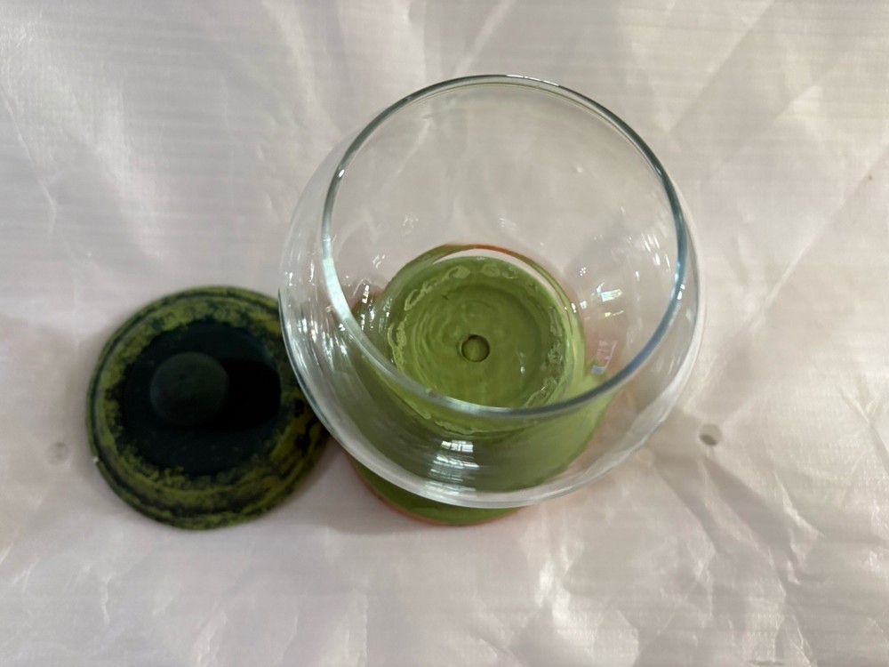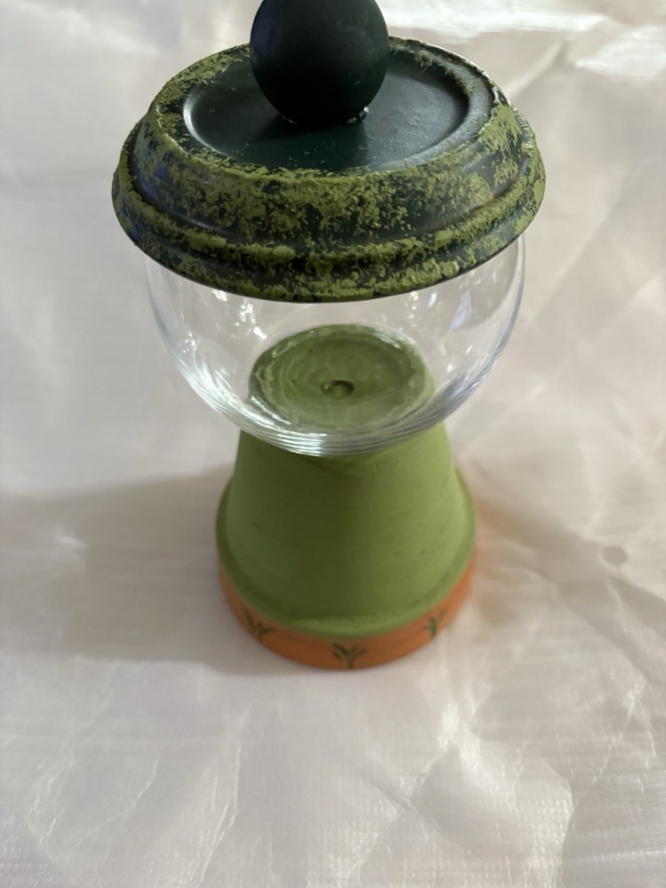 This product is a beautiful green clay pot and glass display container with a floral pattern, perfect for storing cotton balls, Q-tips, or other small items. The clay pot design adds a unique touch to the piece, while the lid ensures everything stays organized. With dimensions of 9.5" in height and 4.5" in width, this candy dish or display is both functional and decorative, making it a lovely addition to any collection or decor setting.