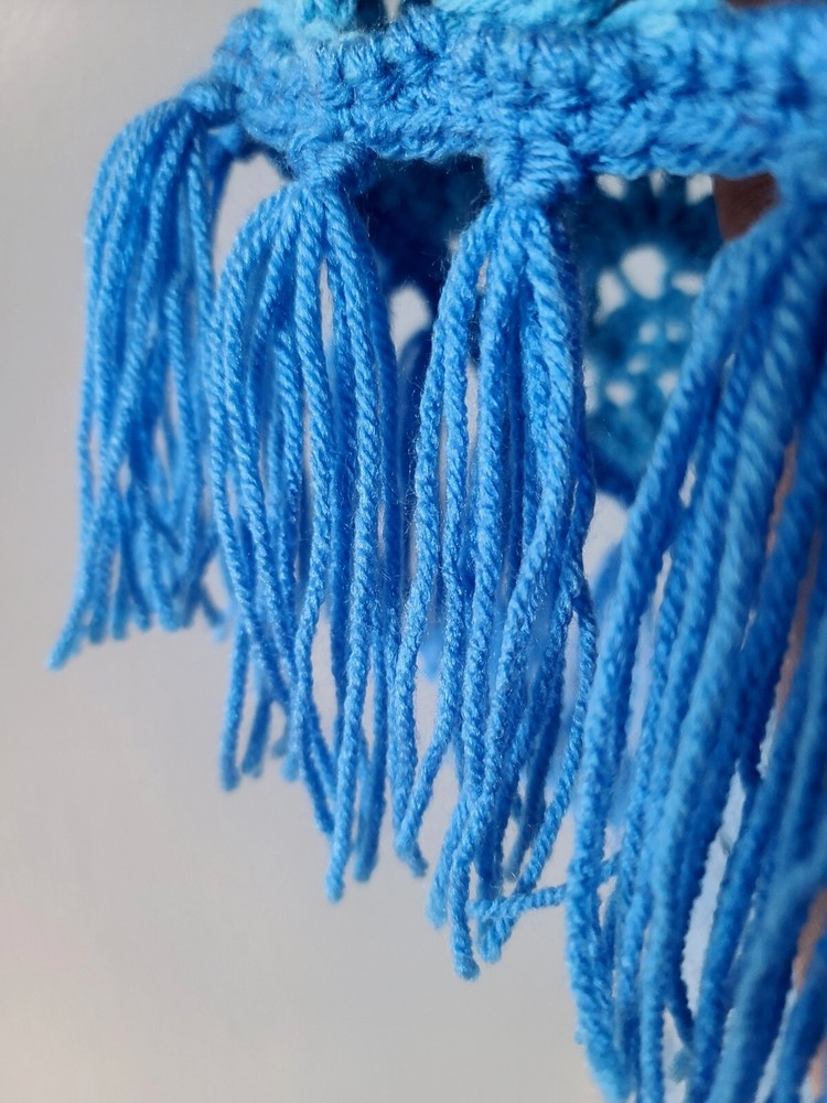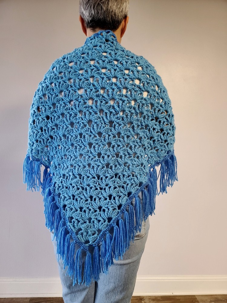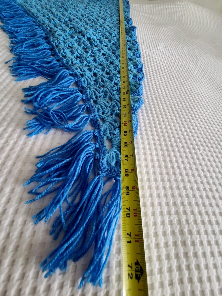 HANDMADE!! NEW!! Vintage blue handmade boho poncho with fringe, triangle shawl. Large blue shawl made of medium-weight acrylic yarn. The shawl is crocheted. Machine washable, but hand washing is recommended for yarn items. If you insist on machine washing, at least place the item in a laundry bag to avoid excessive stretching and snagging.