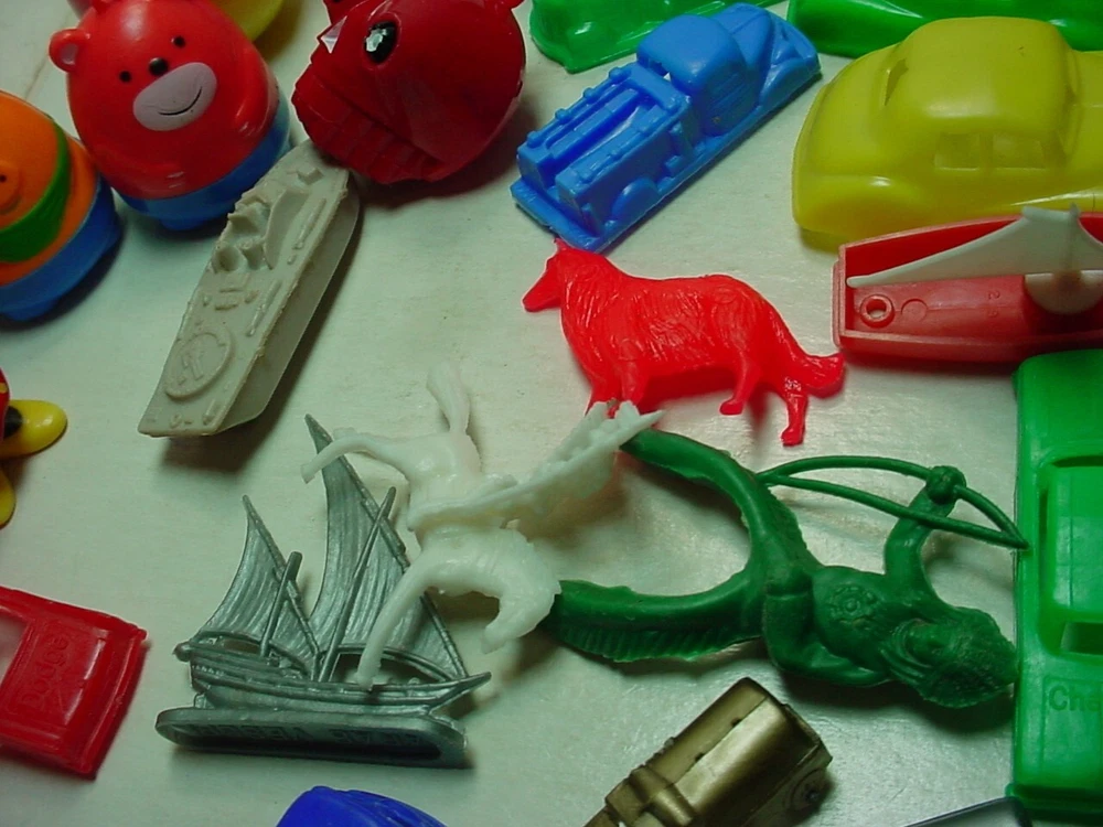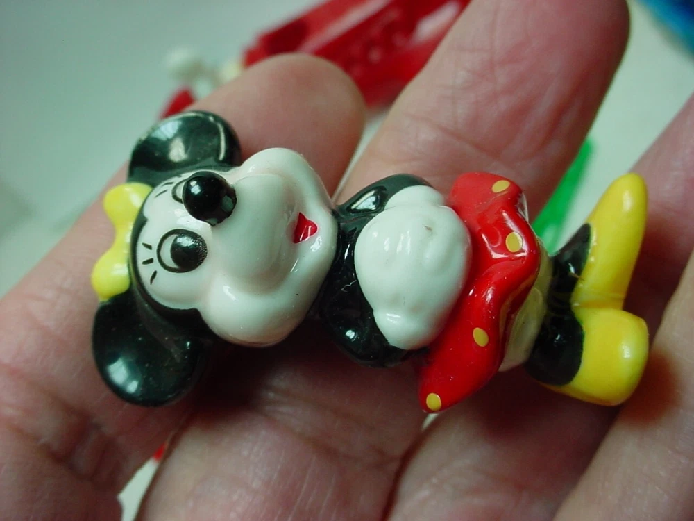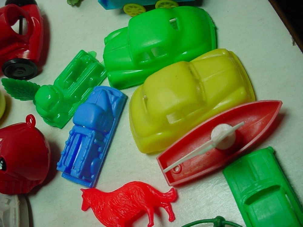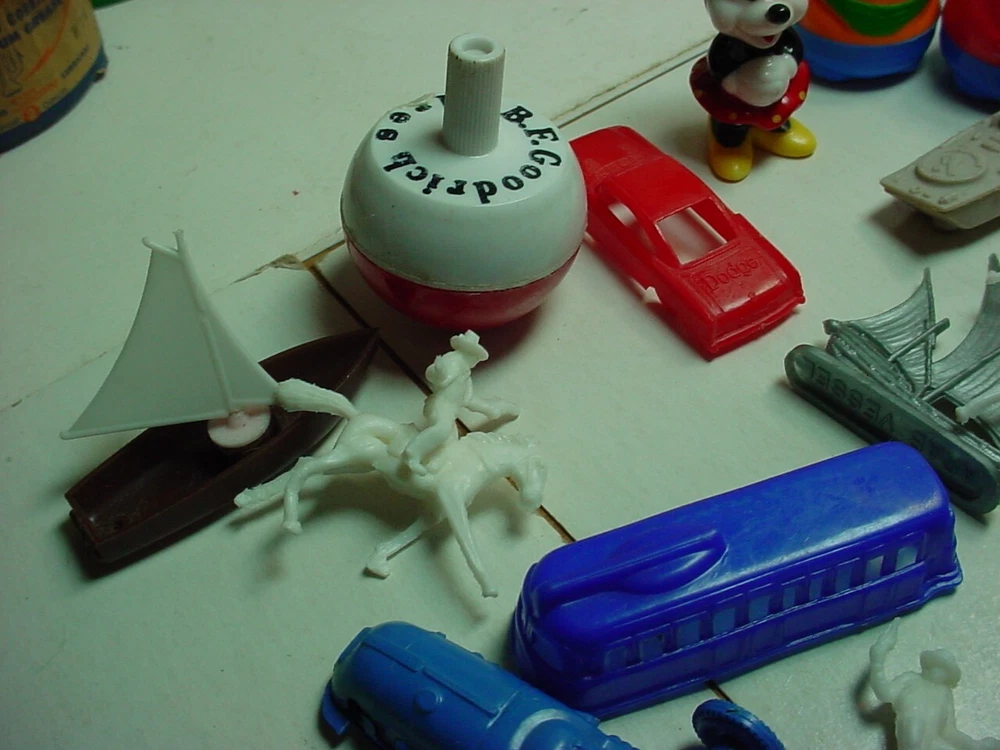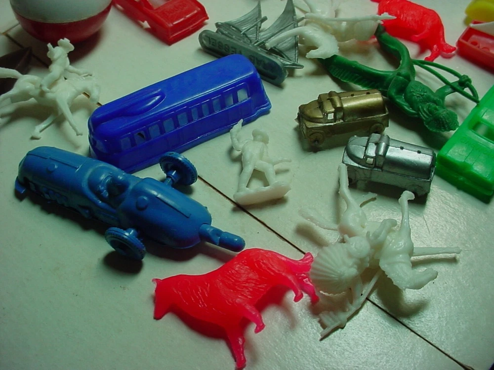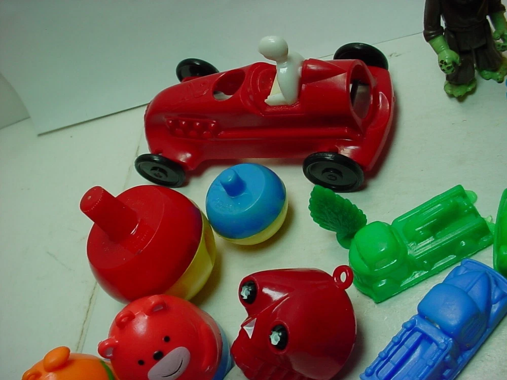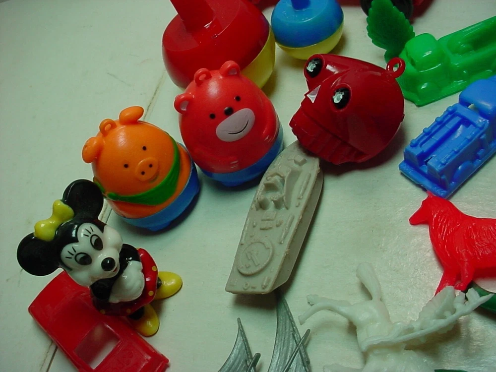 Here is a lot of little toys. Some might be from cereal boxes or gum ball machines, I'm not sure. Most are plastic. The red head's eyes and tongue pop out when you move his jaw. The one top is a pencil sharpener. Some have damage, missing parts or need cleaning.