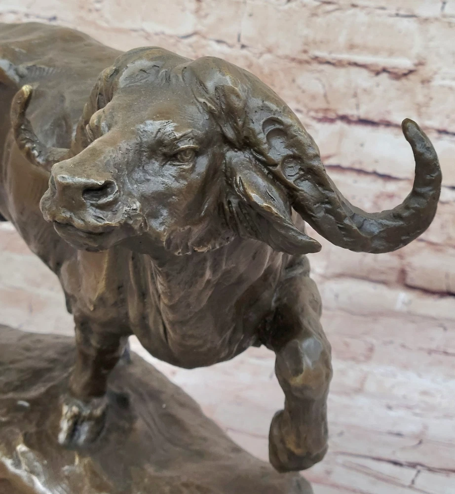 Condition : This sculpture is in perfect condition. Bronze Dimensions with Marble Base:11" X 17" Marble Dimensions: Diameter 13.5" Height without base:10" Weight:27 LBS Inventory:2497K08442 Capturing the raw power and unpredictable temperament of a charging bison, this sculpture vividly depicts the intensity of the moment. Bison, typically known for their peaceful and lazy demeanor, can transform into formidable forces, capable of charging at speeds up to thirty-five miles per hour. The sculpture portrays the bison in mid-charge, showcasing its massive skull and distinctive horns, emphasizing the potential danger inherent in its sudden and unpredictable behavior. The intricate detailing, including the large curled horns, brings the sculpture to life, conveying the strength and ferocity of this iconic North American mammal. The bison's natural weapons, from its horns to its massive head, are skillfully portrayed in this fully detailed sculpture. The artist highlights the potential for a bison to use its head as a battering ram, harnessing the momentum of its substantial weight at high speeds. The hind legs, capable of delivering devastating force, add to the sculpture's dynamic representation of the bison's power. The brown patina, enhanced with subtle gold touches, adds depth and realism to the artwork, capturing the essence of this majestic creature in a moment of intense action. Crafted with precision and artistry, this sculpture is a product of the "Lost Wax Method," a technique that allows for intricate details and lifelike representations. Mounted on a round black marble base, the sculpture gains a sense of grounding, emphasizing its significance as a work of art. Signed by the artist Milo, this piece not only pays homage to the strength and vitality of the bison but also serves as a testament to the artist's skill in capturing the essence of wildlife in bronze. RUNNING BISON CHARGES BRONZE MARBLE SCULPTURE MILO HOT CAST MARBLE BASE FIGURINE Video will open in a new window Using the eBay App? Paste link into a browser window: [isdntekvideo]