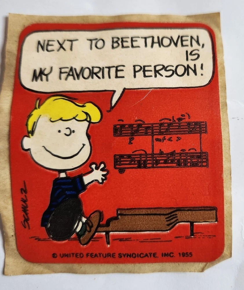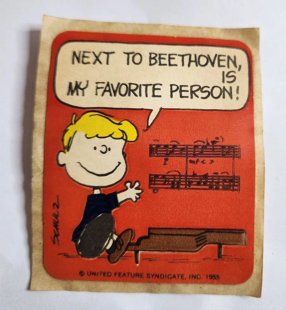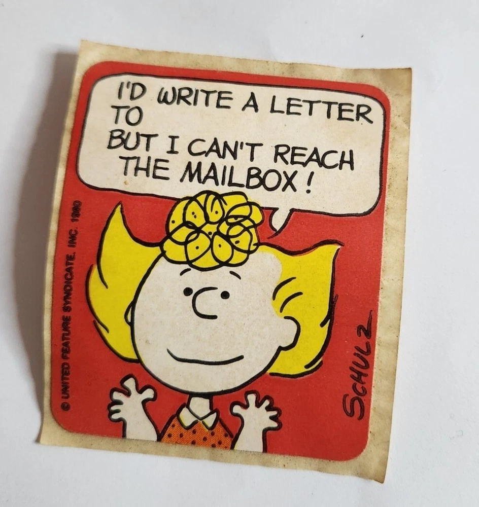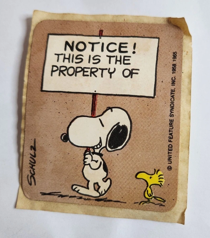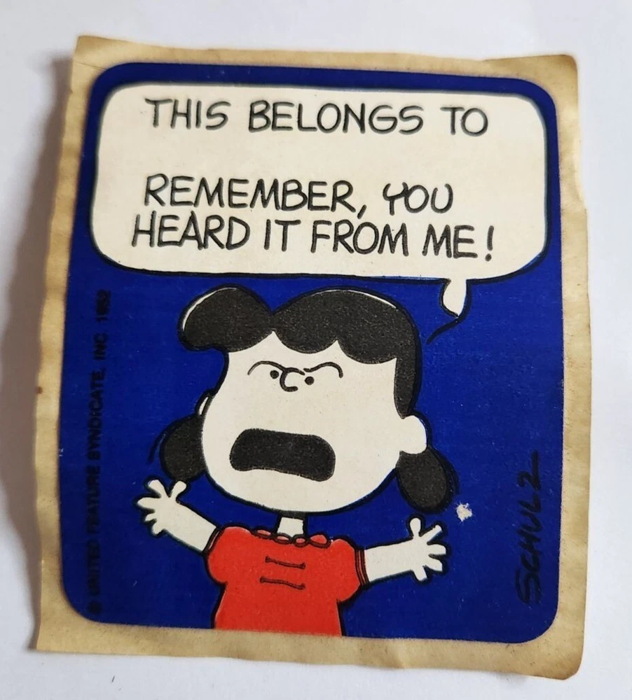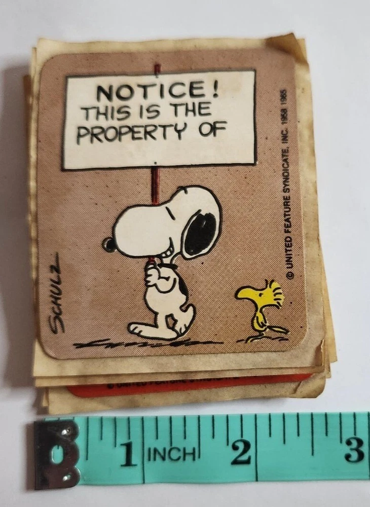 Vintage lot of 7 Peanuts bookplate stickers including two of snoopy, 2 of Lucy, one of sally, and two of the same sticker with Schroeder. They are about 3 inches in size. There is some discoloration from age.