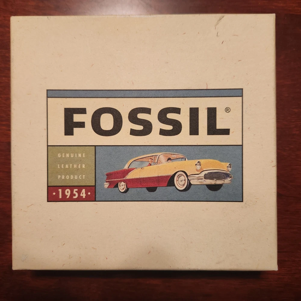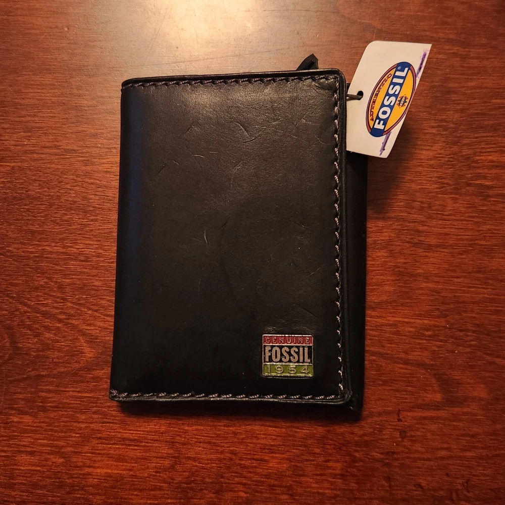 Vintage mens fossil leather trifold wallet (New - original box 1954 ) This is a vintage men's Fossil leather trifold wallet in black. The wallet features a classic design with a focus on holding money and credit cards. It is made of high-quality leather and exudes a timeless style. The brand is Fossil, known for its durable and stylish accessories.
