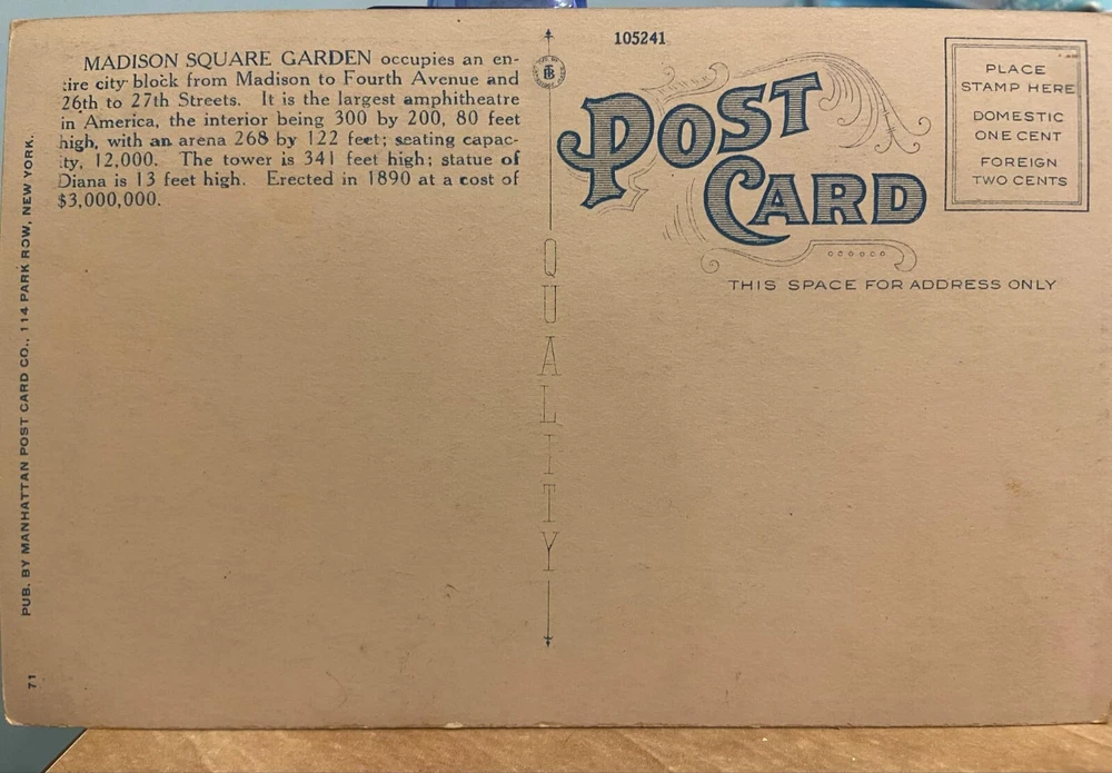Dive into history with this vintage postcard of New York City's famous Madison Square Garden. A captivating testament to the city's roadside attractions, this collectible comes from the United States and more specifically the city of Madison. With its 3000 years, it transports history buffs and collectors into the glorious past of one of America's most iconic arenas. A must-have to enrich your collection of memorabilia from a bygone era.