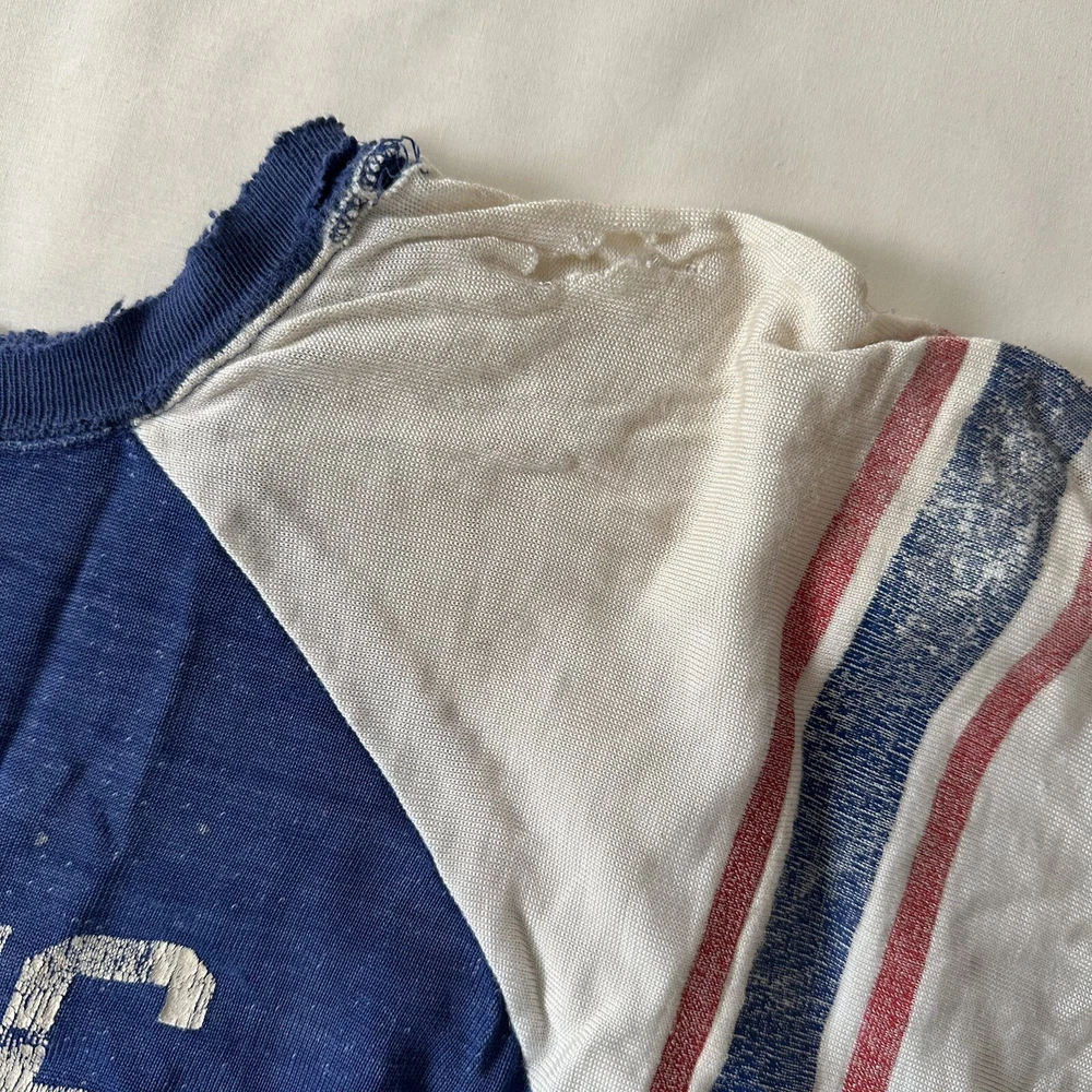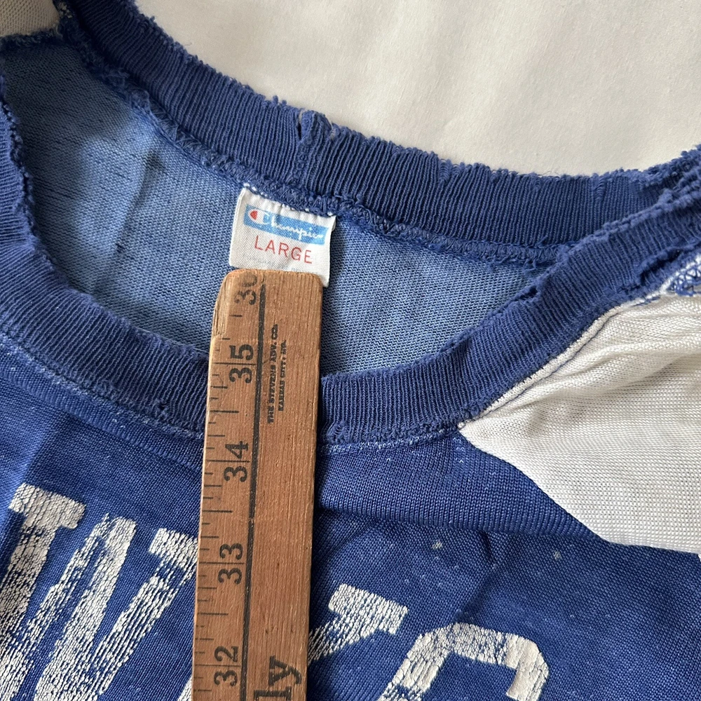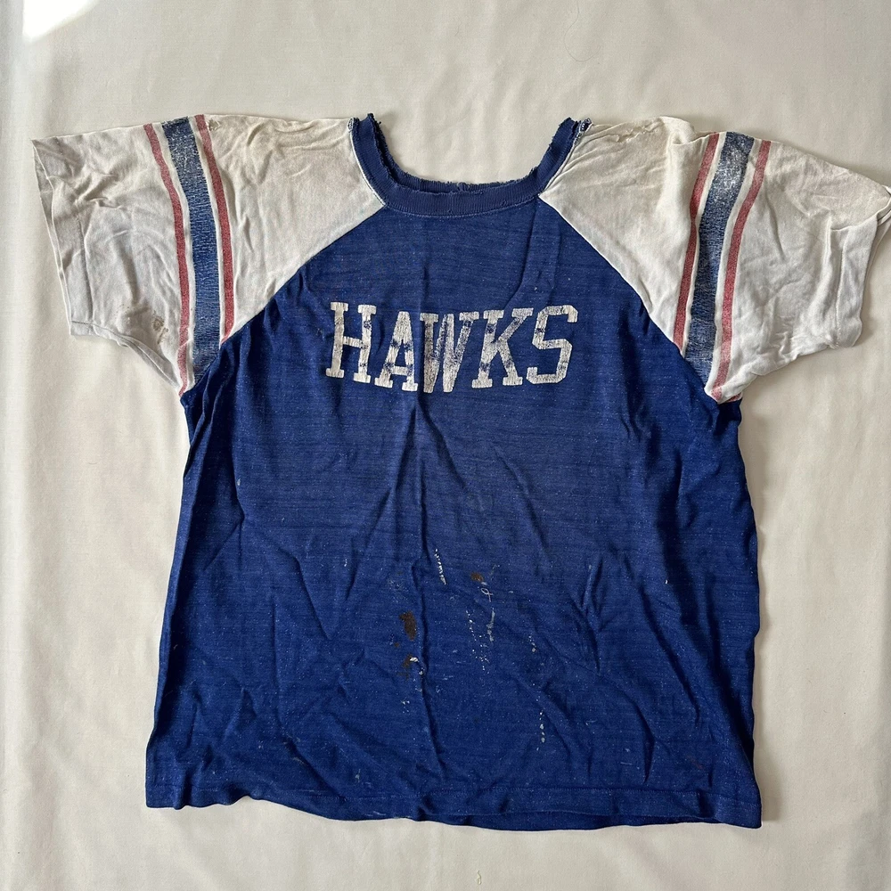 This vintage Hawks blue jersey is perfectly worn and thrashed making it such a cool piece. This is an original piece from the 1970s and perfect for anyone looking to add a touch of retro style and vintage cred to their wardrobe. The short-sleeved jersey features a regular fit and is probably a men's size L—see measurements. The vintage look of this jersey is perfect for those who want to stand out from the crowd. With its unique design and originality, this piece is sure to turn heads. Whether you're looking to add to your collection or simply want to make a statement, this thrashed jersey is the perfect choice. Originally a Rockhurst Hawks jersey from Kansas City, Missouri, this works beyond its original purpose