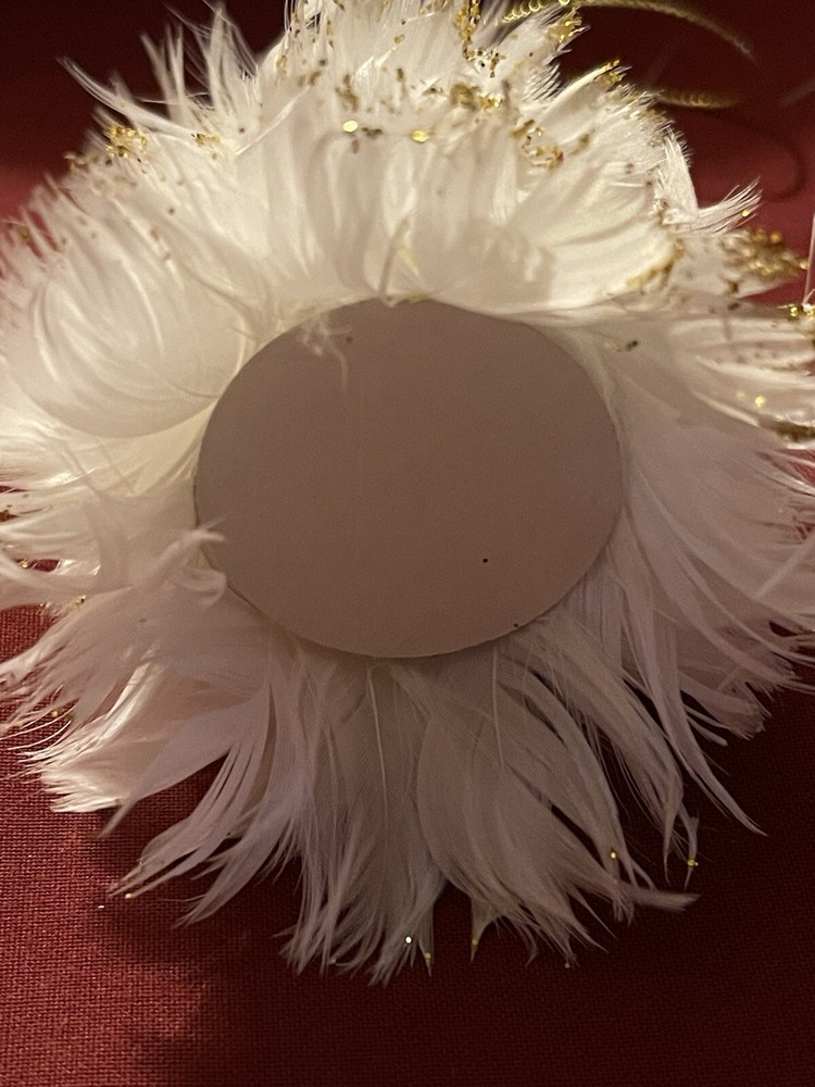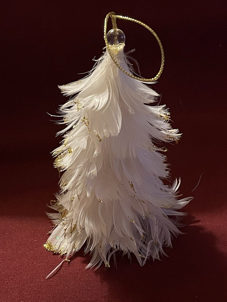 Unique vintage feathered Christmas tree ornament with gold on the edges. Possibly from the 1950s. Good condition. Please see photos for complete description.