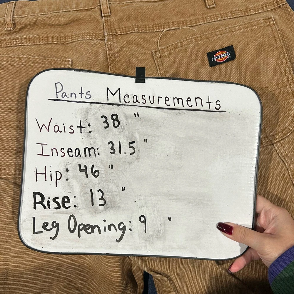 Vintage y2k men's khaki tan Dickies canvas carpenter cargo utility workwear pants Waist: 38" Inseam: 31.5" Hip: 46" Rise: 13" Leg Opening: 9" Tag Size: 38 x 32 Item is in good used condition. Look at photos to see the condition. All, if any, flaws have been pictured. See the last photo for measurements. The waist and hip measurements are measured flat and then multiplied by 2 to get the full measurement around. Please know which measurements fit you prior to purchasing, and don’t just rely on the size tag. Feel free to ask any questions! ***Item is cross posted on several platforms***