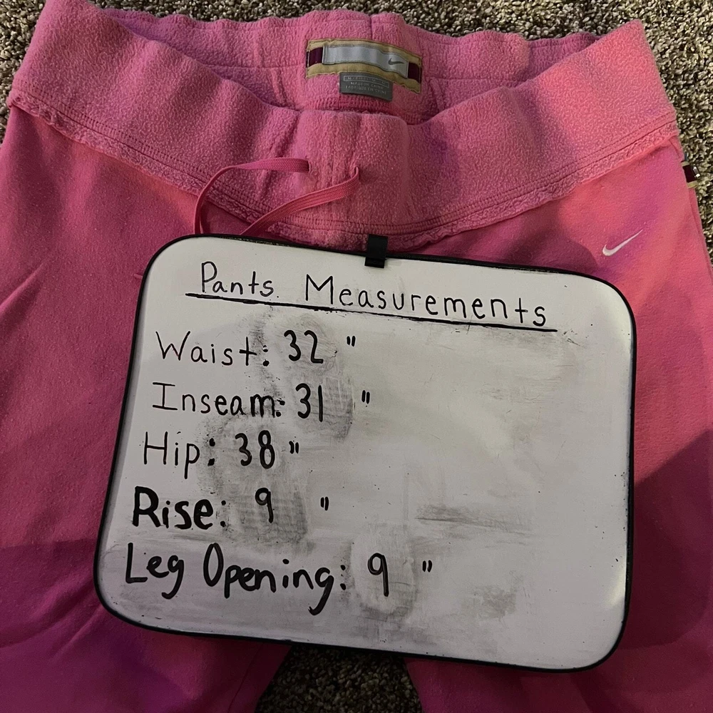 Vintage y2k women's pink Nike Low Rise baggy wide leg sweatpants leggings -juicy couture style, mean girls, regina george, lindsey lohan, velour, bling, trashy y2k, punk, emo, foldover, button snap back pockets Waist: 32" Inseam: 31" Hip: 38" Rise: 9" Leg Opening: 9" Tag Size: M *couple small stains on the front, please see photos Item is in good used condition. Look at photos to see the condition. All, if any, flaws have been pictured. See the last photo for measurements. The waist and hip measurements are measured flat and then multiplied by 2 to get the full measurement around. Please know which measurements fit you prior to purchasing, and don’t just rely on the size tag. Feel free to ask any questions! ***Item is cross posted on several platforms***