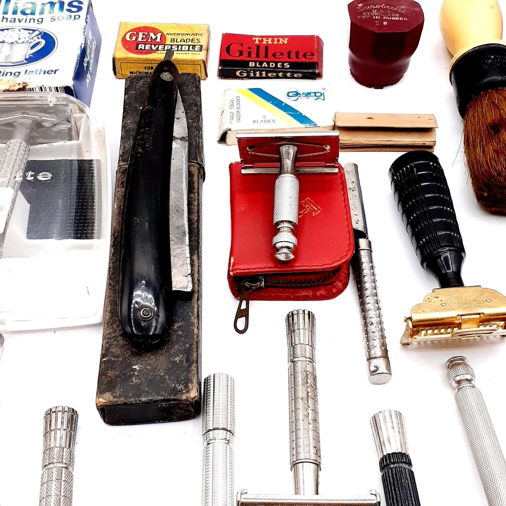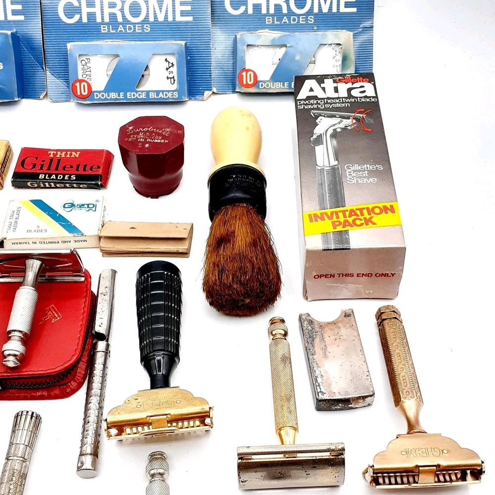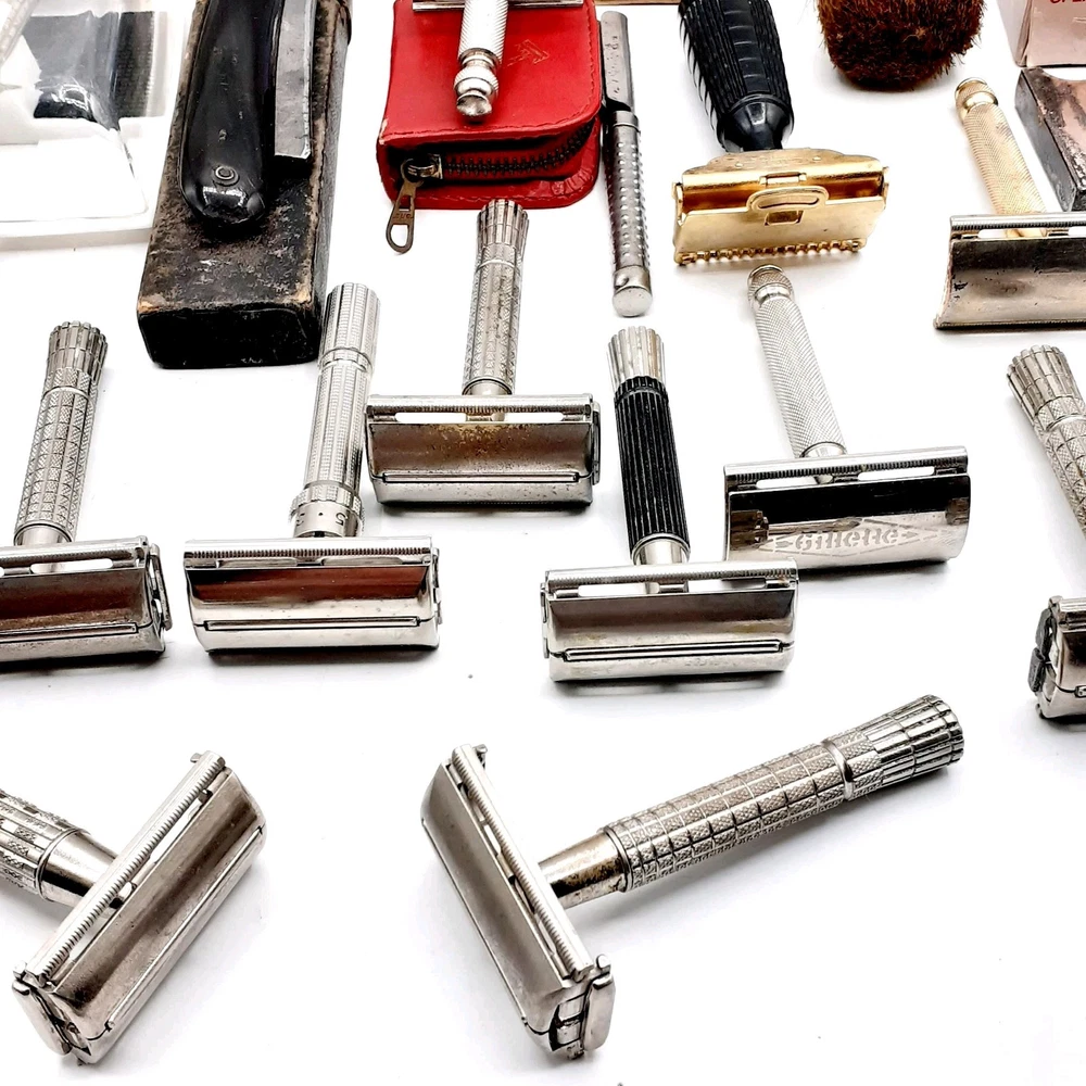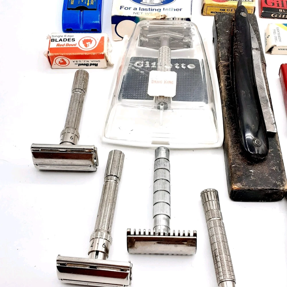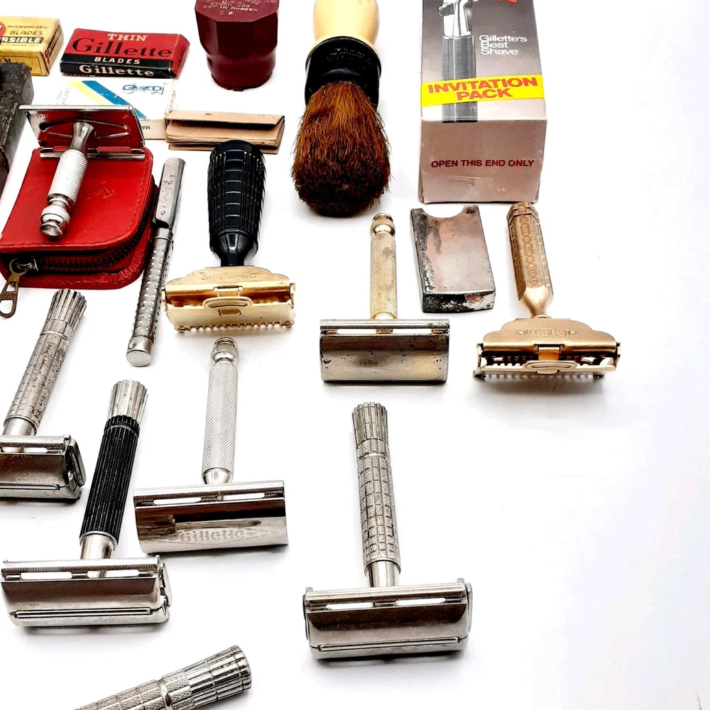 This lot Includes a 1954 Gillette TTO DE Safety razor, one 1955 gillette TTO DE Safety razor, two 1957 gillette TTO DE Safety razors, one 1956 gillette red tip TTO DE Safety razor, one 1962 gillette Adjustable TTO DE Safety razor, one 1964 gillette Adjustable safety razor, one 1964 gillette TTO de Safety razor, one 1965 gillette travel razor, one 1967 gillette Adjustable Safety razor, one 1974 black handle gillette TTO de Safety razor, three 2 piece gillette Safety razors , 2 circa 1912 gem Safety razors, one unknown 3 piece safety razor, one 1980's gillette atra safety razor, one alex Frazier Sheffield Straight razor, and one unmarked straight cut razor. 9 razor Blade packs , one brush, one soap, & more. There are a total of 14 gillette Safety Razors, 2 gem Safety razors, one unmarked safety razor, and 2 straight cut razors 19 total Plus the blades Etc. Please clean and sanitize before use. Please view the photos for the best condition description. I do combine shipping and thanks for visiting my store, I certainly appreciate ya!! 👽🦩🛸