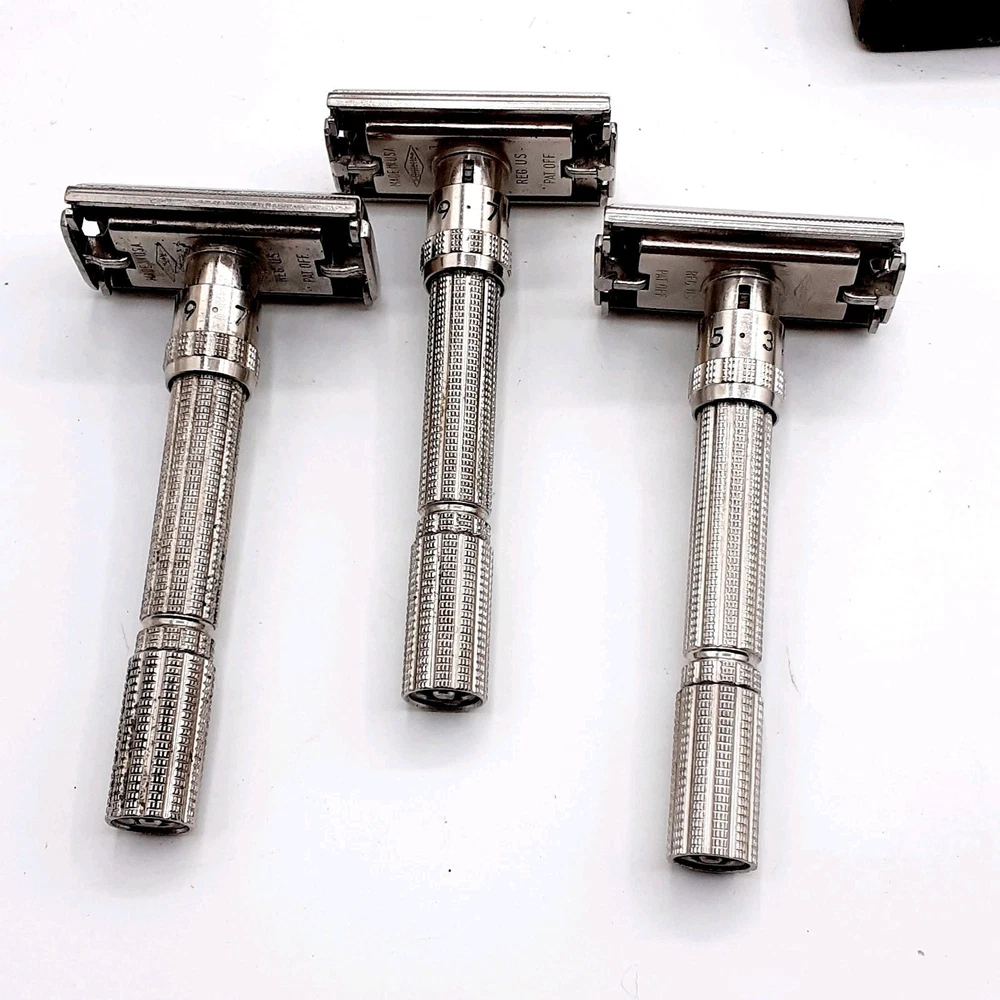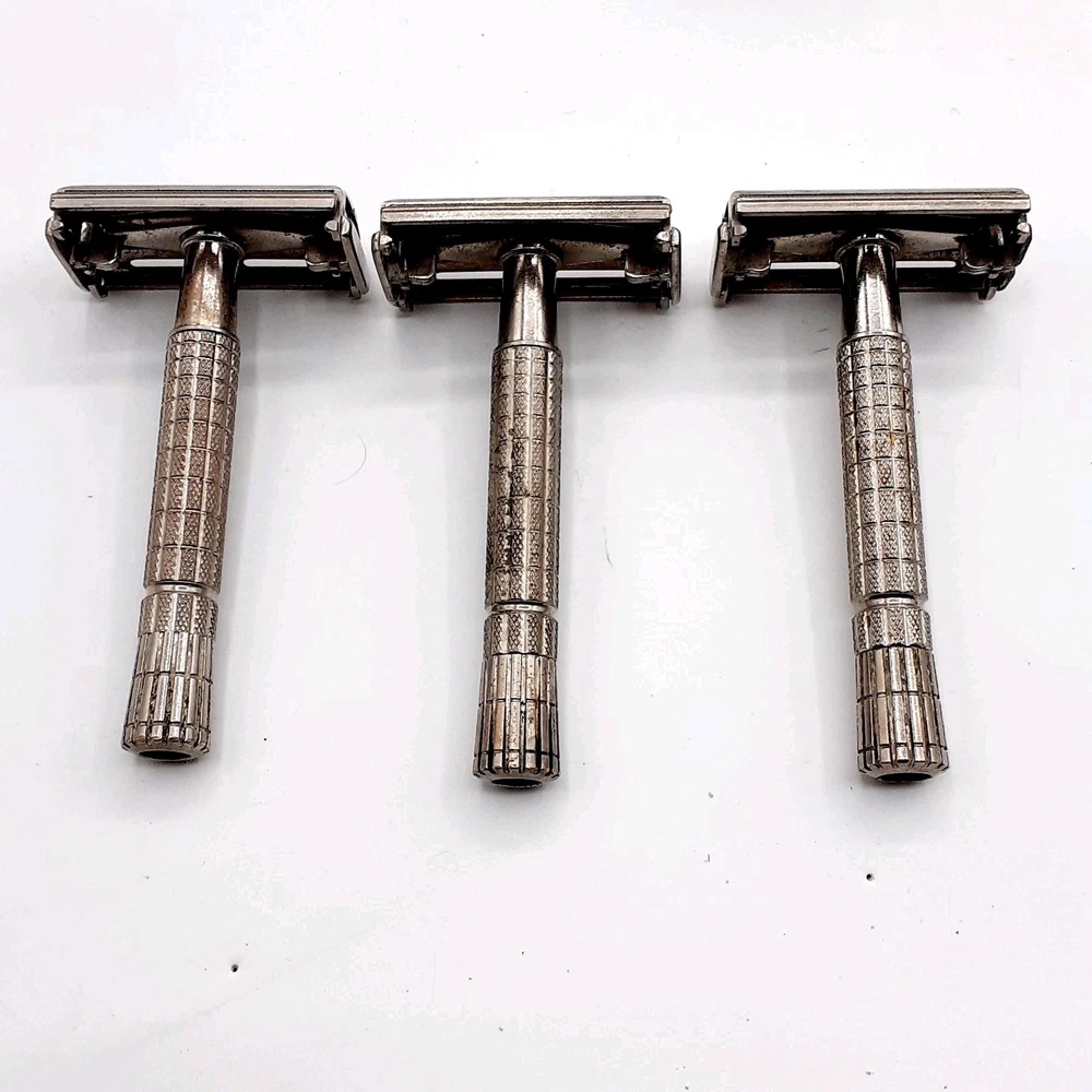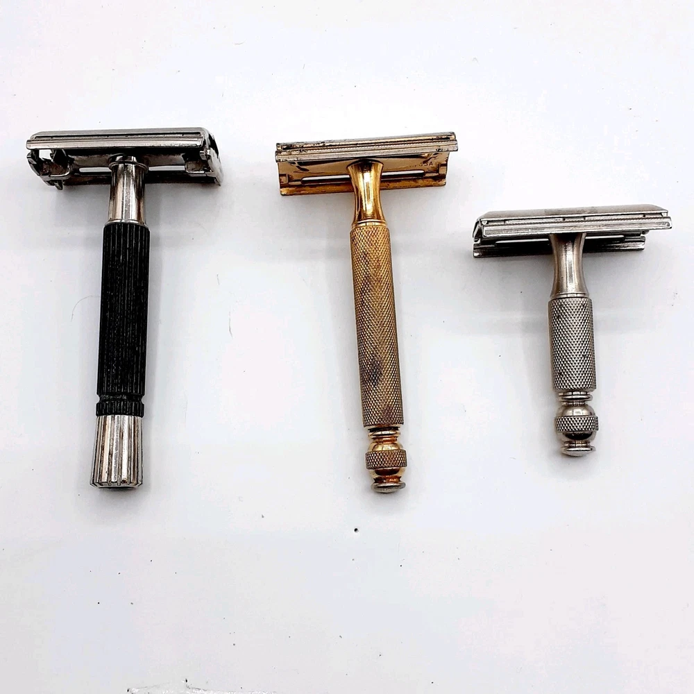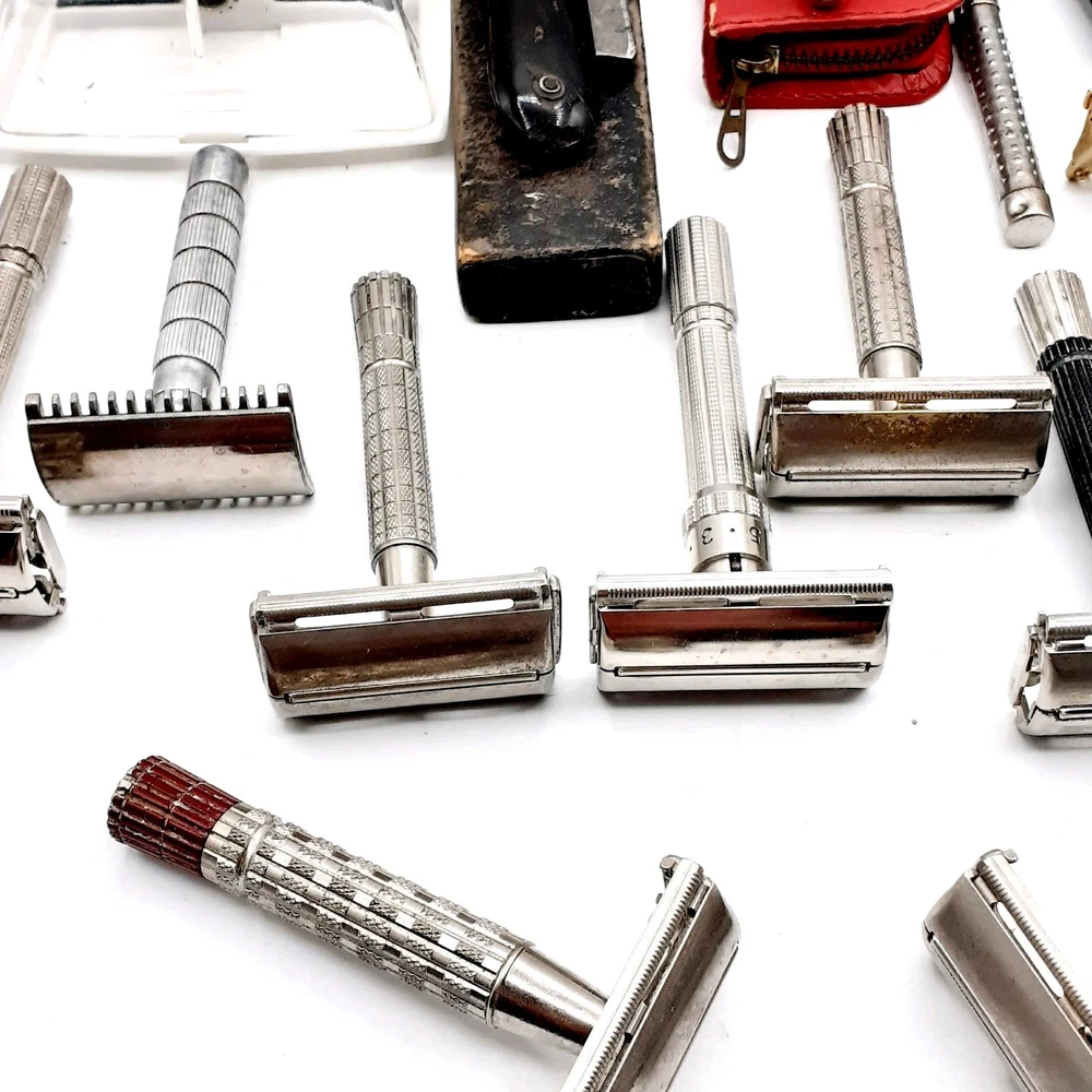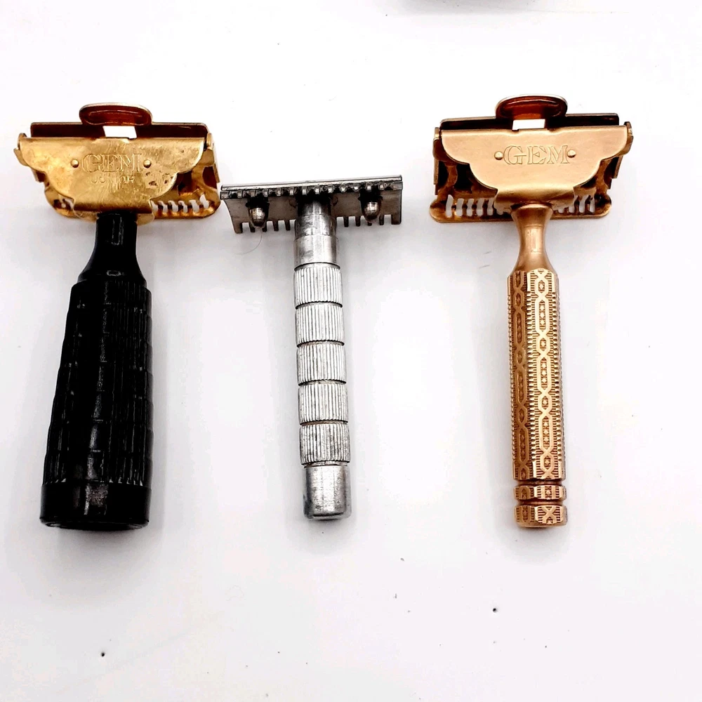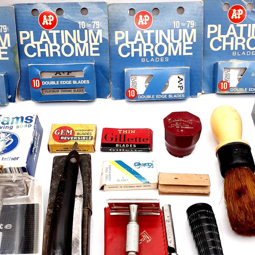 This lot Includes a 1954 Gillette TTO DE Safety razor, one 1955 gillette TTO DE Safety razor, two 1957 gillette TTO DE Safety razors, one 1956 gillette red tip TTO DE Safety razor, one 1962 gillette Adjustable TTO DE Safety razor, one 1964 gillette Adjustable safety razor, one 1964 gillette TTO de Safety razor, one 1965 gillette travel razor, one 1967 gillette Adjustable Safety razor, one 1974 black handle gillette TTO de Safety razor, three 2 piece gillette Safety razors , 2 circa 1912 gem Safety razors, one unknown 3 piece safety razor, one 1980's gillette atra safety razor, one alex Frazier Sheffield Straight razor, and one unmarked straight cut razor. 9 razor Blade packs , one brush, one soap, & more. There are a total of 14 gillette Safety Razors, 2 gem Safety razors, one unmarked safety razor, and 2 straight cut razors 19 total Plus the blades Etc. Please clean and sanitize before use. Please view the photos for the best condition description. I do combine shipping and thanks for visiting my store, I certainly appreciate ya!! 👽🦩🛸