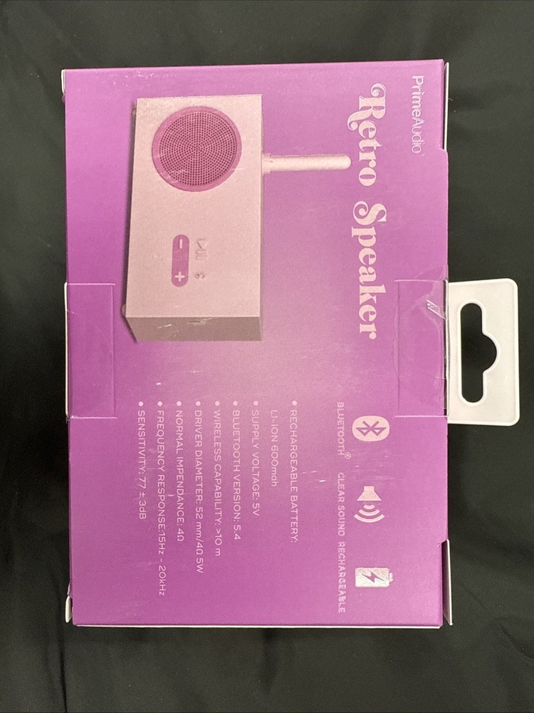 The Retro Bluetooth Speaker by Prime Audio is a rectangular-shaped speaker with a purple color and a plastic material construction. It is compatible with universal brands and models, and features Bluetooth connectivity for seamless audio streaming. The speaker also has smart home compatibility with Siri, along with audio inputs for AUX and USB. With a battery capacity of 1500 mAh and a charger included, this speaker offers a convenient and stylish way to enjoy your favorite music in 2025.