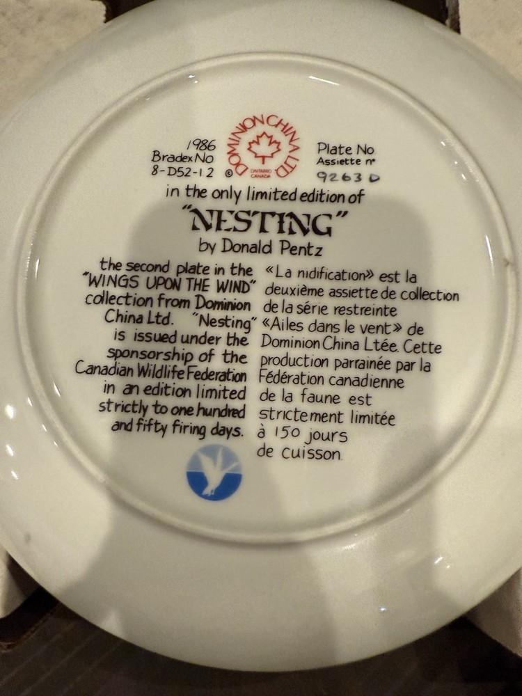 HomeVintage-“NESTING”-By Donald Pentz-COLLECTOR PLATE-1986 Limited Edition-With COA.