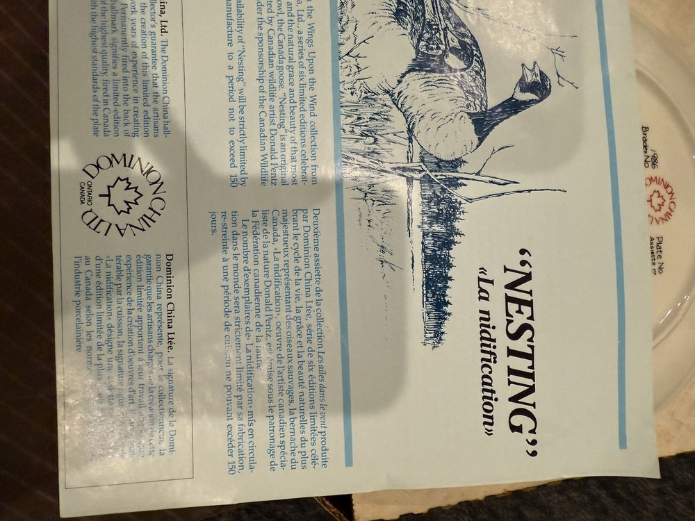 Occasion:All OccasionsType:Collector PlateShape:RoundCulture:CanadianMaterial:PorcelainStyle:DecorativeAntique:NoFeatures:Date-LinedTheme:NestingColor:MulticolorCountry of Origin:CanadaTime Period Manufactured:1980-1989Production Style:Art PotteryProduct Line:Dominion China Ltd.Brand:Dominion China Ltd.Item Diameter:8.5 inOrigin:OntarioHandmade:NoProduction Technique:PotteryEra:Late 20th Century (1970-1999)Vintage:YesPattern:Ducks