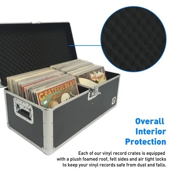 Product details Are you tired of the stacks of your vinyl records laying around unprotected? Forget the milk crate and wooden crates for storing your vinyl records! Classic Acts offers the perfect organizer storage product to protect your lps in between the time when you listen to the records. Made from strong aluminum, our storage crates boast heavy duty protection better than any wooden storage or milk crate for your vinyl records. Each vinyl record crate is equipped with a plush foamed roof, felt sides and air tight locks for protection against dust and any mishandling. Not only does each crate come with the best record storage, it also comes with a solid case handle sturdy enough for all heavy lifting and keeps each album safe and sound inside unlike faulty wood storage. Classic Acts boasts a large vinyl player storage amount that fits up to 75 doubles and up to 150 singles. Many record player companies’ offer a wooden table or wooden crate for storage but Classic Acts with its heavy duty aluminum and overall interior protection can give you and your vinyl records the best quality guaranteed. Heavy Duty Outer Case- Classic Acts boasts the best vinyl record album storage crate made of a strong aluminum outer case and air tight locks for heavy duty records storage. Overall Interior Protection- Each of our vinyl record crates is equipped with a plush foamed roof, felt sides and air tight locks to keep your vinyl records safe from dust and falls. Solid Case Handle - Forget the milk crate and wooden crates to keep your records safe, Classic Acts provides a sturdy handle for heavy lifting. Large Quantity Storage- While many record player storage organizer storage products can only store a certain limit, Classic Acts’ lps crate can fit up to 100 doubles and up to 150 singles.