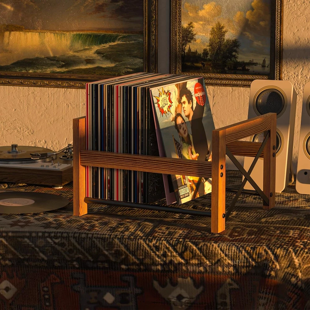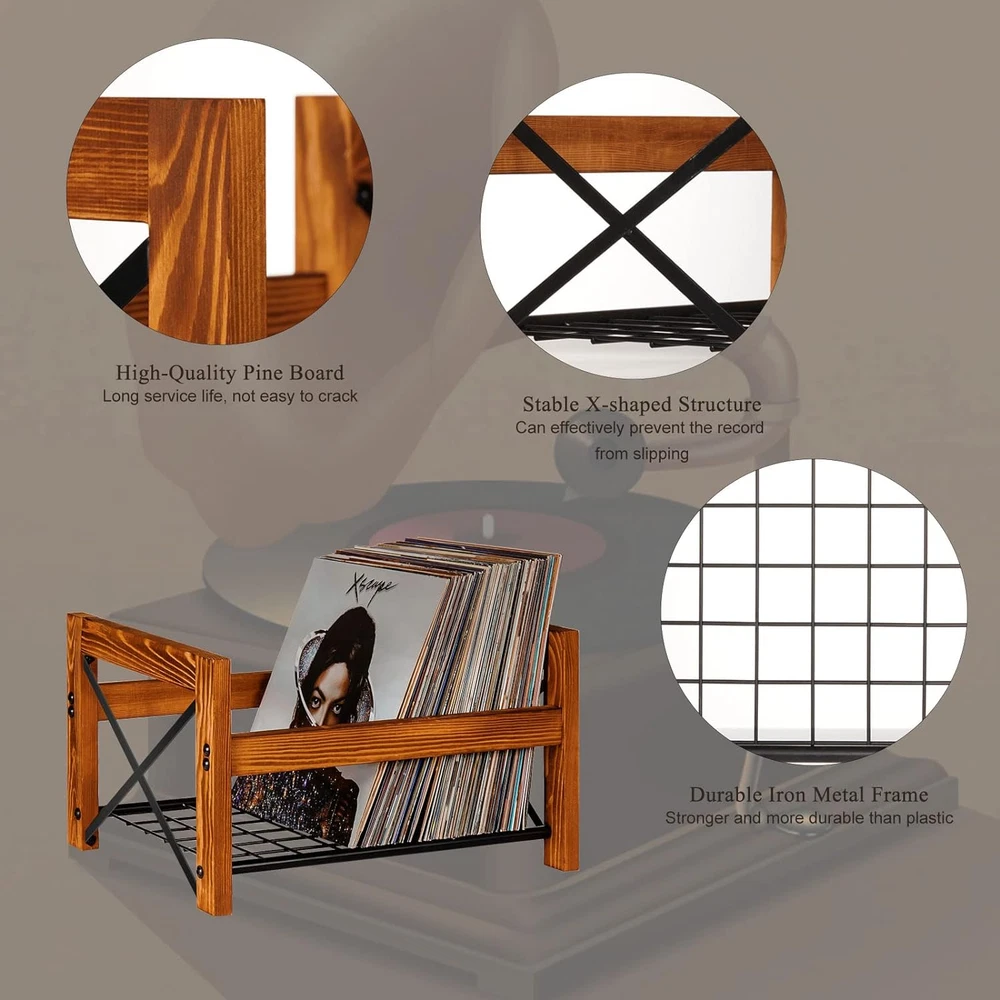 Have All Your Favorites Larg - Big Capacity disk storage box, that can store and organize up to 50-100 of your loved recorded or album covers. Suitable for 7", 10",12" records, and also suitable for DVD or CD. Your Exclusive Vinyl Record Holder - The unique design of matte black iron+pine wood, perfectly matches your favorite retro minimalist style, making your vinyl record frame unique. Protect Your Record Collection - The bottom iron mesh design and the side X-shaped structure can better keep the record upright and stable, durable, and not easy to break. Multi-Function - The album storage rack not only stores records and albums but also stores books, files, etc. It is very suitable for use in the living room or study room. Easy To Assemble - With just simple instructions and screw assembly, you can easily have a vinyl record storage holder. (*Vinyl records and record sleeves are not included.) Product Description Elevate Your Vinyl Collection with X-cosrack Vinyl Record Holder Are you a true vinyl enthusiast? Take your passion to the next level with the X-cosrack Vinyl Record Holder. This advanced storage solution not only keeps your beloved records organized but also adds a touch of modern elegance to your space. Scenario use Spacious Storage Capacity Designed with a large capacity, this disk storage box can neatly house up to 50-100 of your favorite records, album covers, DVDs, or CDs. Its versatility accommodates 7", 10", and 12" records, offering a comprehensive storage solution for various media. Exclusive Design Aesthetics Crafted with a unique blend of matte black iron and pine wood, the X-cosrack Vinyl Record Holder perfectly complements your retro minimalist style. Embrace the nostalgia of your vinyl collection while adding a distinct visual appeal to your space. Multi-Purpose Functionality While ideal for storing records and albums, this versatile storage rack goes beyond music. Utilize it to organize books, files, and more, making it an excellent addition to your living room or study. Protective and Stable Construction With its bottom iron mesh design and side X-shaped structure, this holder offers impeccable stability to keep your records upright and secure. Rest assured, your cherished vinyl collection remains safe and unharmed. Effortless Assembly Setting up your vinyl record holder is a breeze. With simple instructions and screw assembly, you can have your storage solution ready in no time. (Note: Vinyl records and record sleeves are not included. Detail Up to 50-100 of your favorite records Crafted with a blend of matte black iron and pine wood Bottom iron mesh design and side X-shaped structure Utilize it to organize books, files, and more