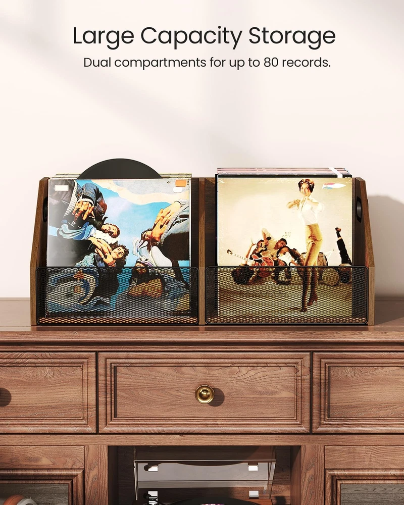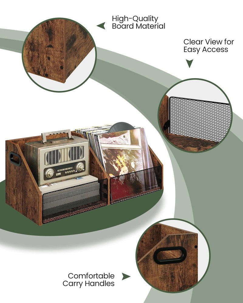 Vinyl Record Storage Double-Compartment 27.6" Record Holder with Metal Mesh F Capacious Storage Capacity: Our 2-compartment record storage, measuring 27.6"L x 11.8"W x 11"H, boasts ample room for 80+cherished records, meticulously crafting a neat, melodic sanctuary for your musical realm. Simplicity meets versatility in every inch Visible Metal Mesh: Featuring a unique metal-grid facade, this vinyl record holder delicately shelters your vinyls while revealing them in full view. Every disc stands out, inviting your favorite melodies with ease and grace Versatile Storage Solution: Beyond vinyls, this vinyl storage crate transforms into a home for albums, essential documents, playful knick-knacks, or daily essentials. Customize to your heart's desire, unlocking endless storage potential Retro Industrial Charm: Embracing a rustic brown finish, complemented by a distinct trapezoidal silhouette and intricate metal mesh, this vinyl record storage exudes industrial elegance. Enrich your living space with a unique blend of artistry and nostalgia Effortless Assembly: With a straightforward design of vinyl record storage, numbered components, and a step-by-step illustrated manual, assembling your classic and elegant vinyl storage box is a breeze. Follow the guide and create a masterpiece in minutes Vinyl Record Storage Crate Shipping We offer FREE shipping on all orders! We ship within Three business days of payment, usually sooner. We use a selection of shipping services such as UPS, FedEx, USPS etc. We only ship to the lower 48 states, no APO/FPO addresses or PO Boxes allowed. Local pickups and combined shipping options are not provided at this time. Return You can return a product for up to 30 days from the date you purchased it. Any product you return must be in the same condition you received it and in the original packaging. Please keep the receipt. Payment We accept payment by any of the following methods: PayPal Please pay as soon as possible after winning an auction, as that will allow us to post your item to you sooner! Feedback Customer satisfaction is very important to us. If you have any problem with your order, please contact us and we will do our best to make you satisfied. Contact Us If you have any queries, please contact us via ebay. We usually respond within 24 hours on weekdays. Please visit our eBay store to check out other items for sale! Thank you for shopping at our store.