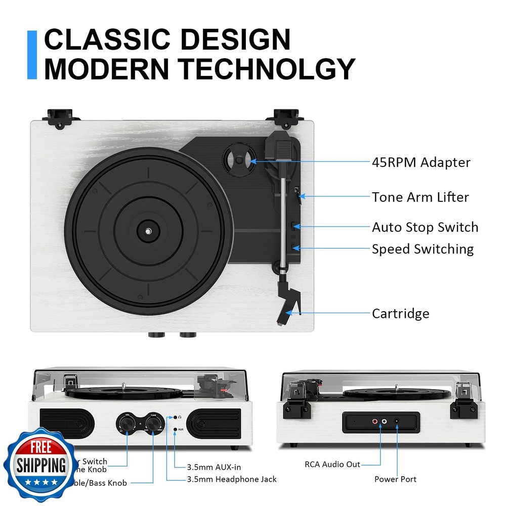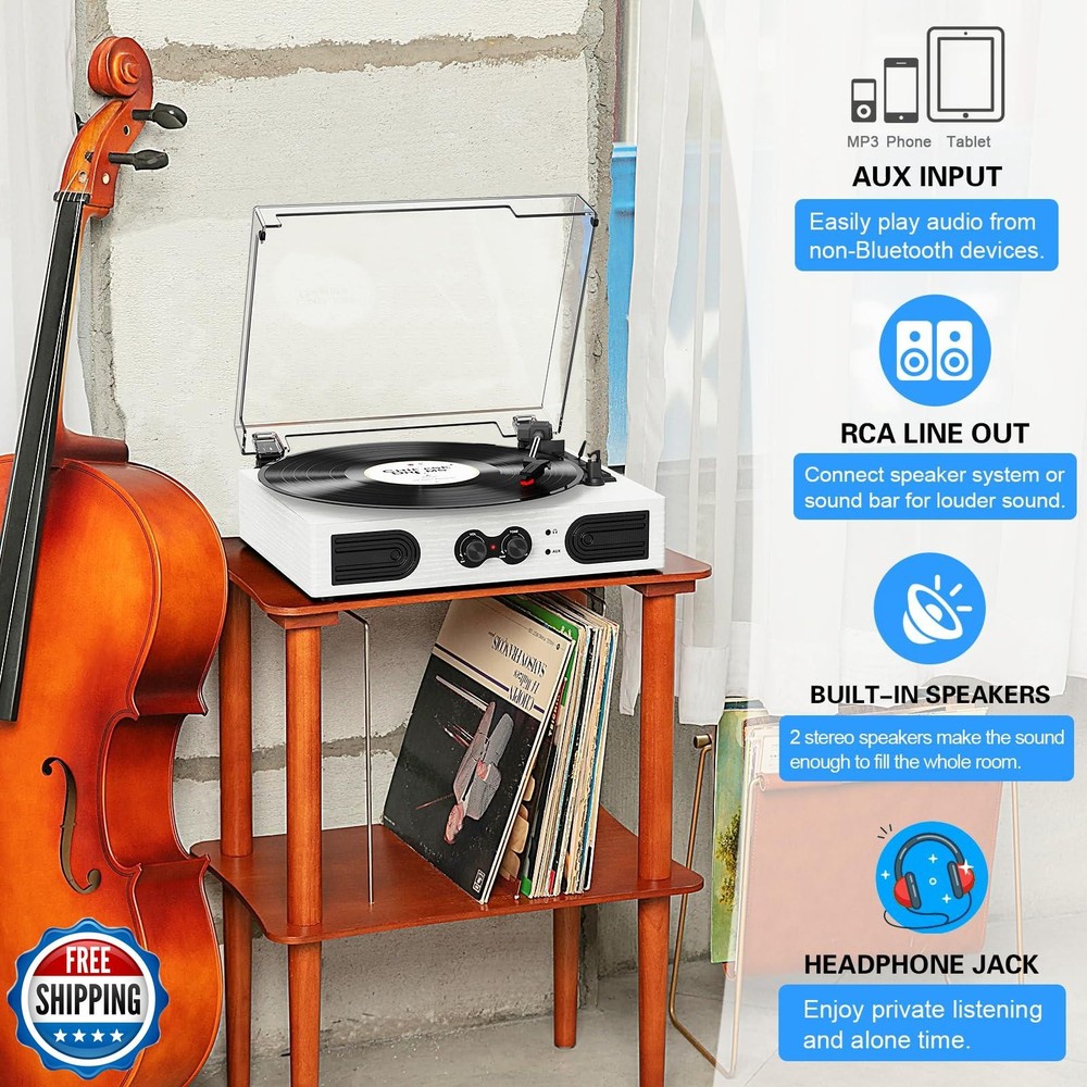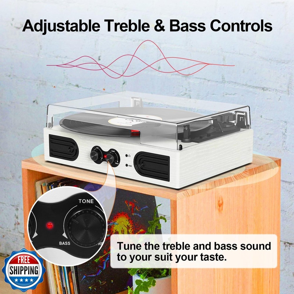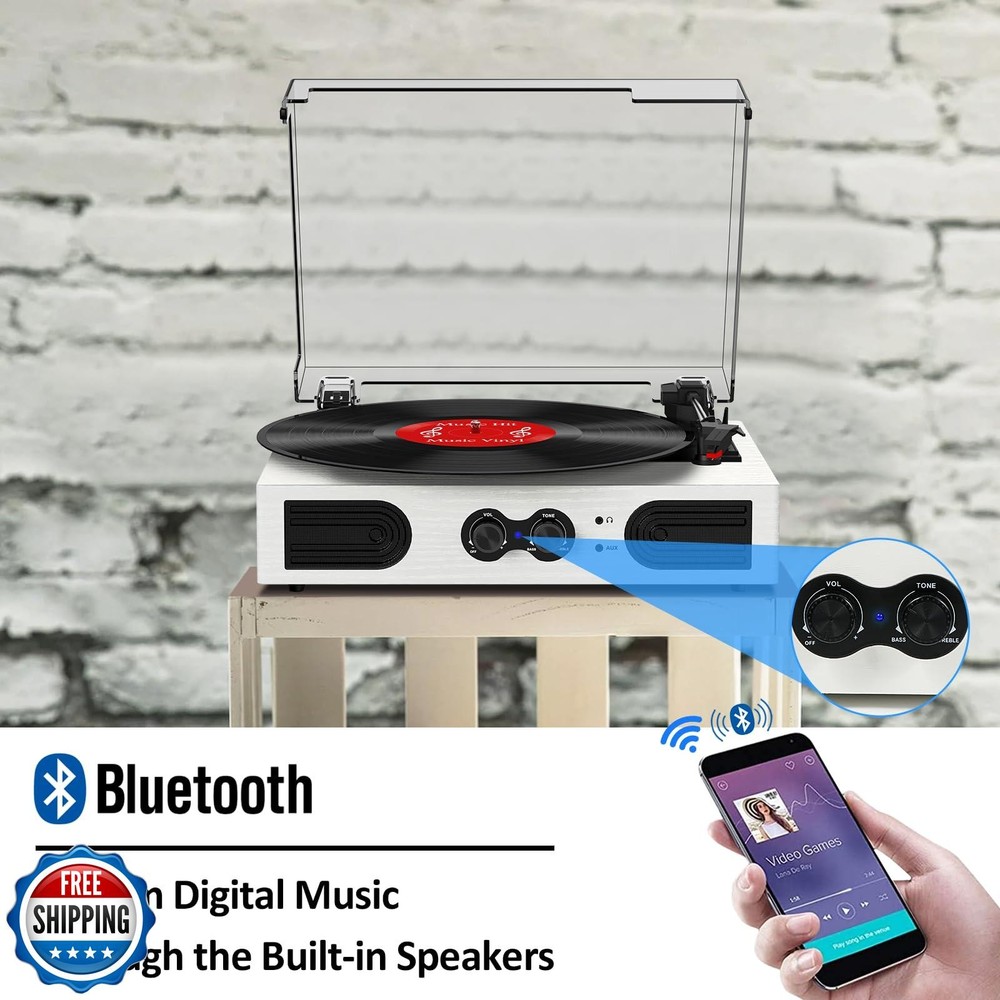 VinylsLink Vinyl Record Player with Built-in Stereo Speakers and Bass Adjust, Portable Vintage 3-Speed Belt-Driven, Bluetooth Input, RCA Line Out AUX in Headphone Jack, White Wood Features 3 Speeds 3 Sizes & Vintage Design: Combo of vintage styling and original record player design, this vinyl record player will take you back in time, it not only plays all your 3-speed records (33/45/78 RPM) from a retro 1950s turntable. Get ready to create your own musical memories Expanded Connection Options: Music streaming digital audio via turntable built-in Bluetooth speakers. Hook up external speakers through RCA output or Aux-in line for non-Bluetooth devices like MP3. You can use your headphones to get private listening. Just seize the day with music Bluetooth Connection & Bass Control: Built-in Bluetooth streaming technology lets you wirelessly stream your favorite tunes from your Bluetooth-enabled devices to the turntable. Customize the sound to your liking with Bass Adjust knob Built-in Speakers & Upgraded Belt-Drive Design: The white record player has 2 stereo speakers built-in, an upgraded belt-drive base with spring suspension buffers, and four rubber feet to reduce motor vibration and improve sound quality Vintage Vinyl Record Player Design: There is a removable cover on the top to protect vinyl and turntable plat. You can shut the cover shields and keep the dust out. And the beautiful textured exterior are a perfect fit for any environment Ideal Gift Choice: An excellent choice for anyone - be it your son, daughter, father, or mother. This record player makes a fantastic gift for special occasions like Thanksgiving, Christmas, Mother's Day, Father's Day, and birthdays Shipping Free & Fast Shipping: We offer free shipping to most of the USA with a normal delivery time of 3-7 days. However, due to the current situation, additional delivery time (up to 3 weeks) may be required for some items. Alternative Carriers: We may use alternative carriers (e.g., USPS, FedEx, UPS) to ensure your package arrives safely and on time. Due to the use of multiple carriers, we are unable to provide a tracking number automatically. Handling Time: Orders are processed and shipped within 1-2 business days of receiving cleared payment. Shipping Restrictions: Shipping to Alaska, Hawaii, Puerto Rico, Guam, and other US territories may incur shipping charges or delivery restrictions. Please contact us before ordering, or your order can be refunded/cancelled. State Restrictions: Certain items may not be shipped to California due to state regulations. Contact for Tracking Updates: If you require tracking updates or have any concerns about the delivery of your order, please feel free to contact us, and we will be happy to assist you. Return Policy 30-Day Hassle-Free Returns: If you are not completely satisfied with your purchase, you can return the item for free within 30 days of receiving it for a full refund or exchange. Easy Return Process: Contact us, and we will provide you with a prepaid return shipping label and detailed instructions. No Restocking Fee: There are no restocking fees for returns. However, the buyer is responsible for return shipping costs if the return is not due to a seller"s error. Refund Processing: Refunds will be processed within 1 business day of receiving the returned item in its original condition. Feedback Your feedback is extremely important to us. We strive to provide the best products and customer service possible. If you are satisfied with your purchase, please take a moment to leave us a positive review. If you have any concerns or issues with your order, please contact us before leaving negative feedback. We are committed to resolving any problems and ensuring your satisfaction. Contact Us If you have any questions or concerns, please feel free to reach out to our customer support team. You can contact us through the eBay messaging system. We are available Monday to Friday, 9:00 am to 5:00 pm EST, and we will do our best to respond to your inquiry within 24 hours. Thank you for supporting our small family business!