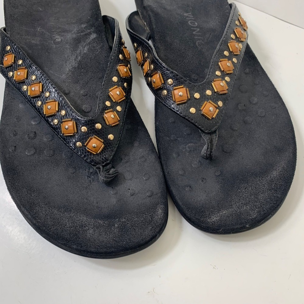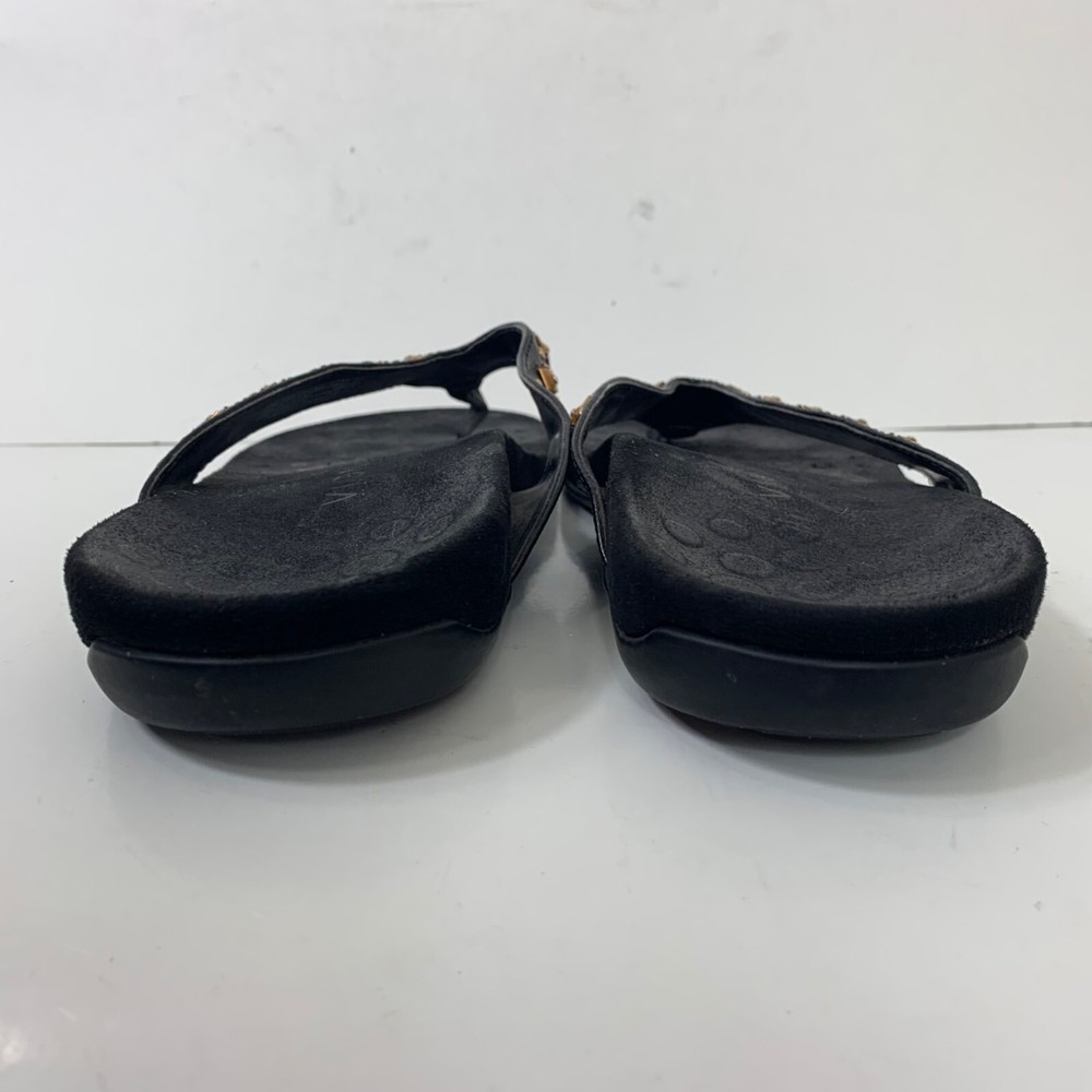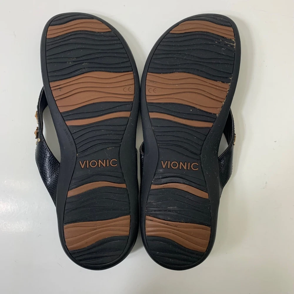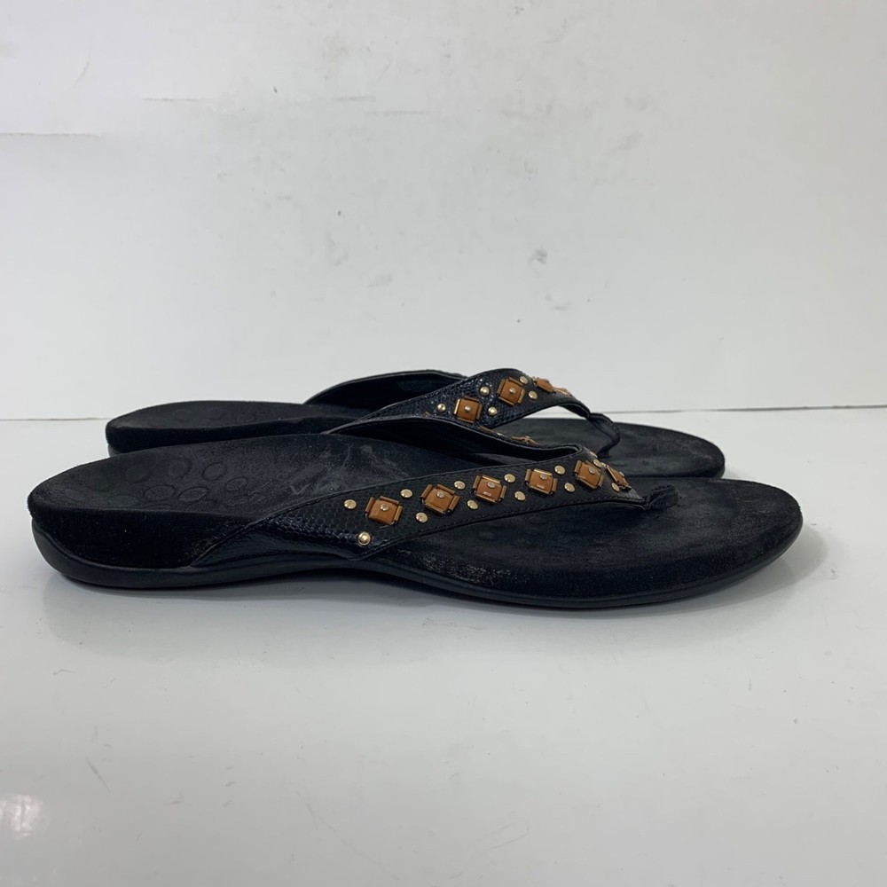 Closure: Slip On Color: Black Heel Style: Flat Brand: Vionic Theme: Bohemian Upper Material: Synthetic Model: Vionic Floriana Embellished US Shoe Size: 10 Seller Notes: “Great preowned condition!” Type: Sandal Department: Women Style: Flip Flop
