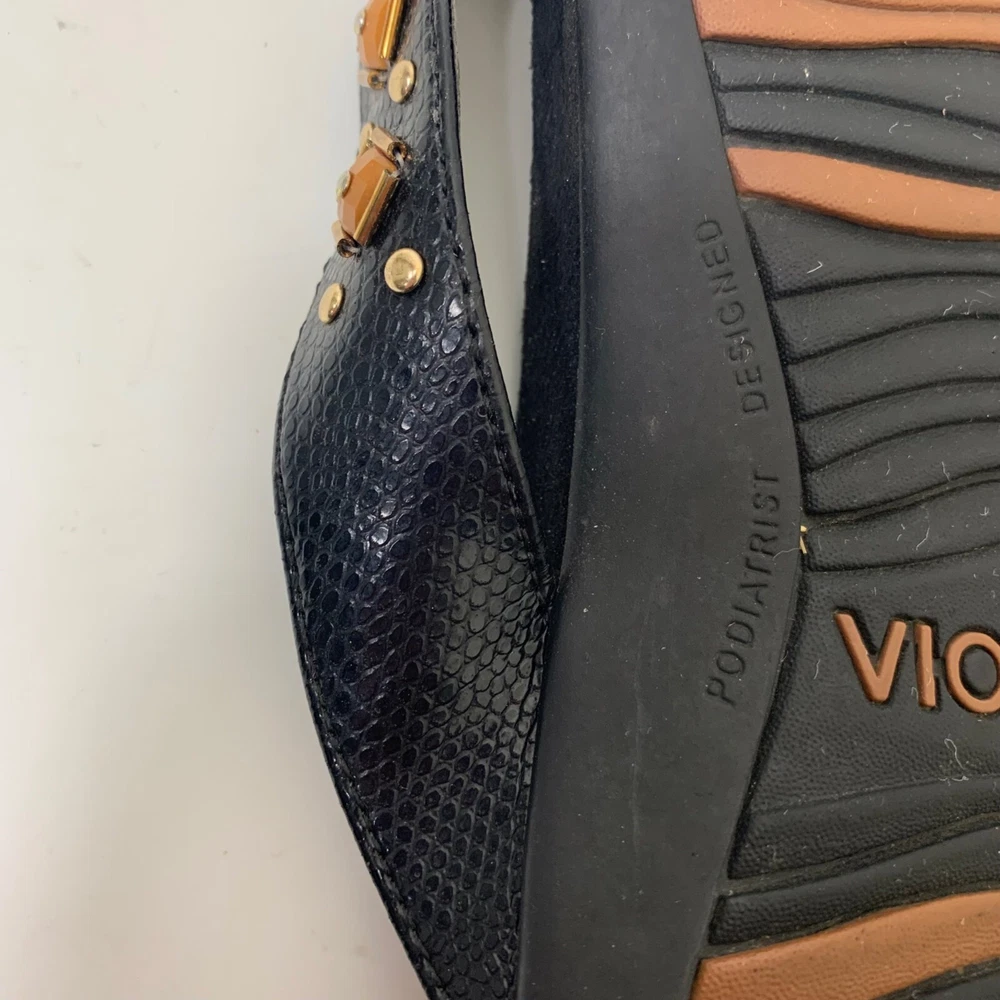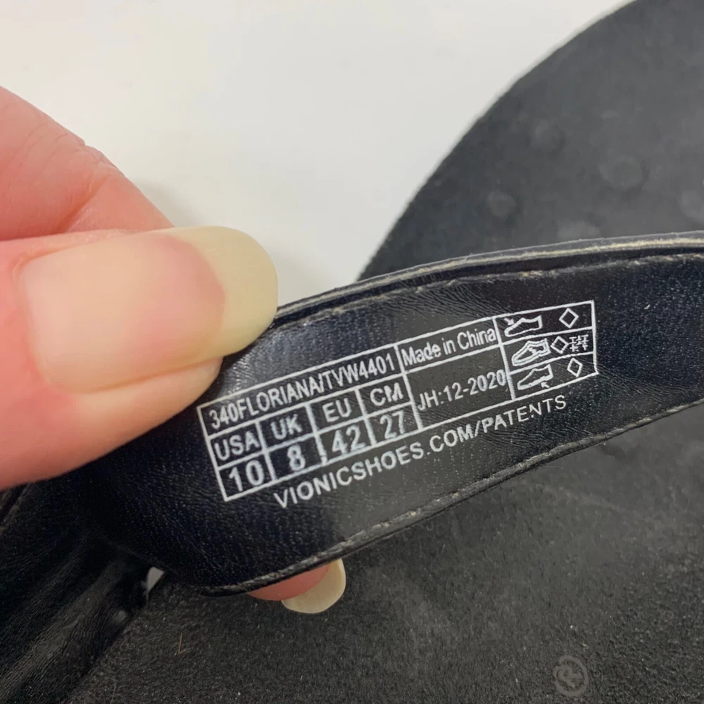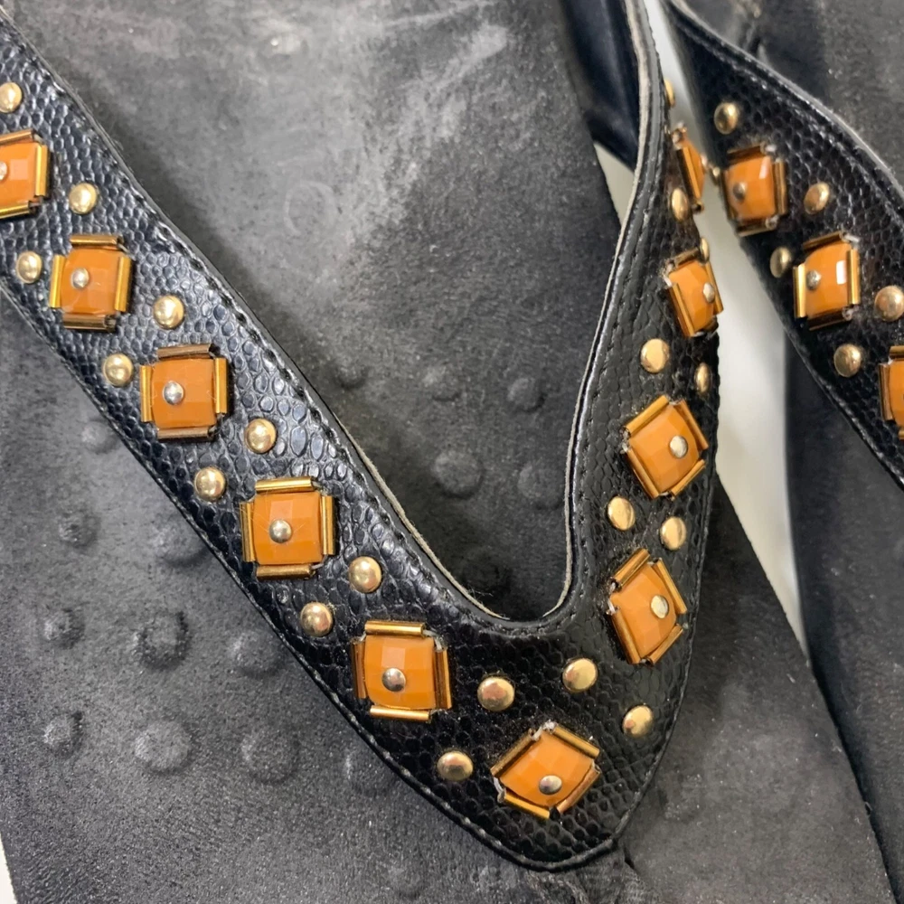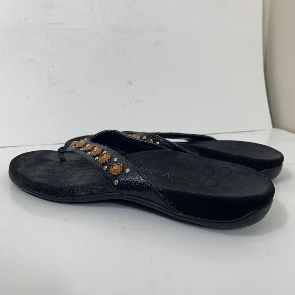 Closure: Slip On Color: Black Heel Style: Flat Brand: Vionic Theme: Bohemian Upper Material: Synthetic Model: Vionic Floriana Embellished US Shoe Size: 10 Seller Notes: “Great preowned condition!” Type: Sandal Department: Women Style: Flip Flop