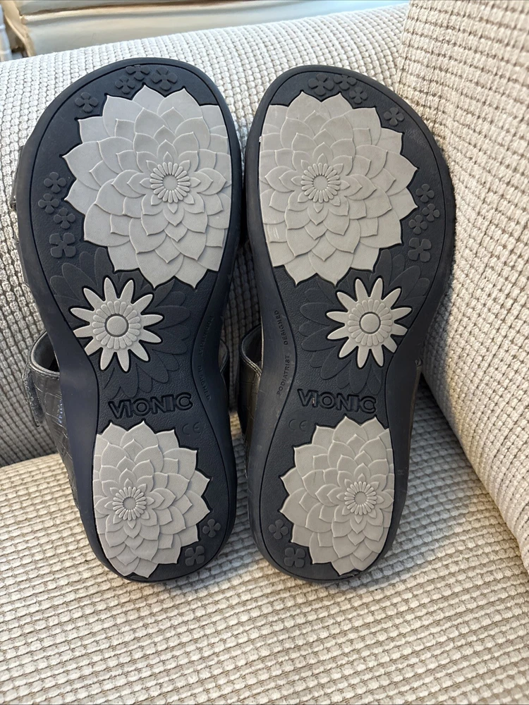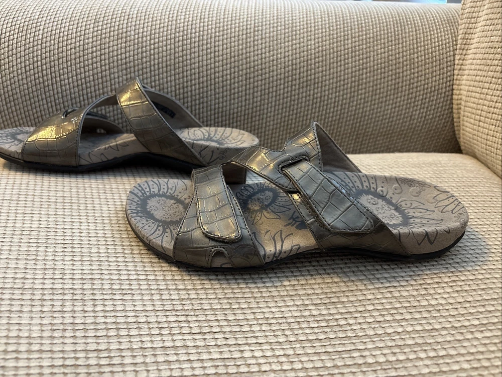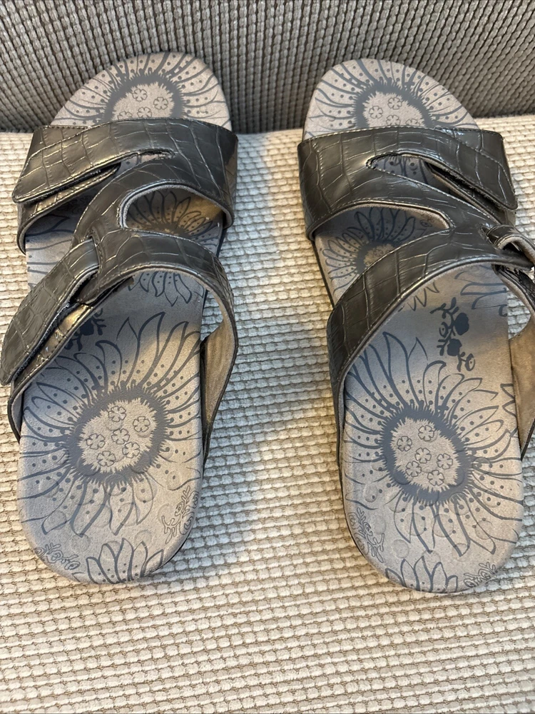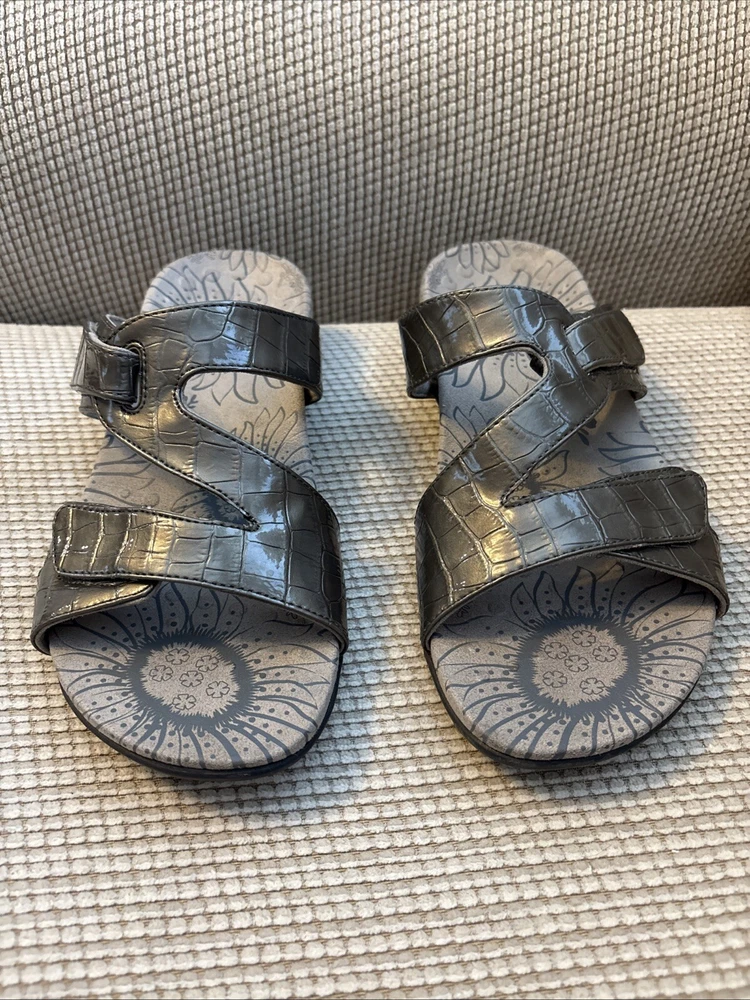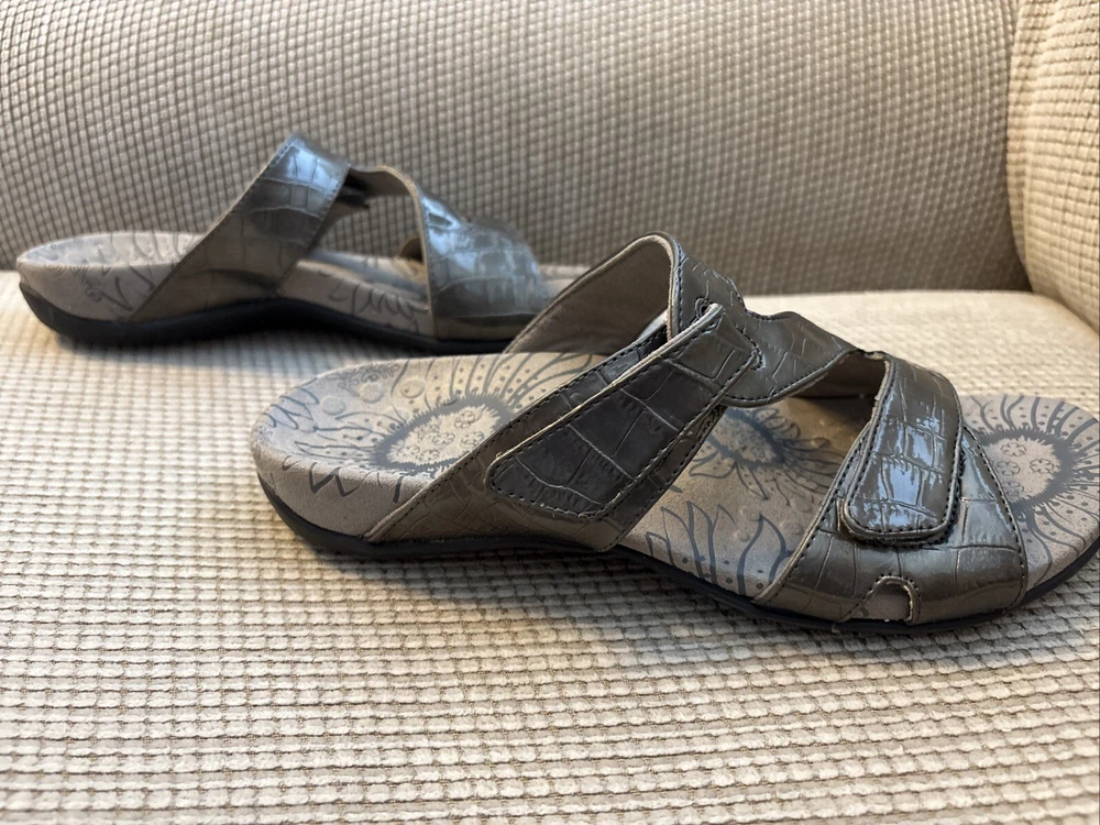 The Vionic Lauren Sandals are women's slip-on sandals in a stylish gray croc pattern with a shiny finish. These sandals are designed with a podiatrist-approved construction, featuring arch support and cushioning for maximum comfort. The adjustable strap allows for a customizable fit, while the breathable synthetic upper material and rubber outsole provide durability and support. Perfect for everyday wear, these sandals are a fashionable and practical choice for those looking for both style and foot support.