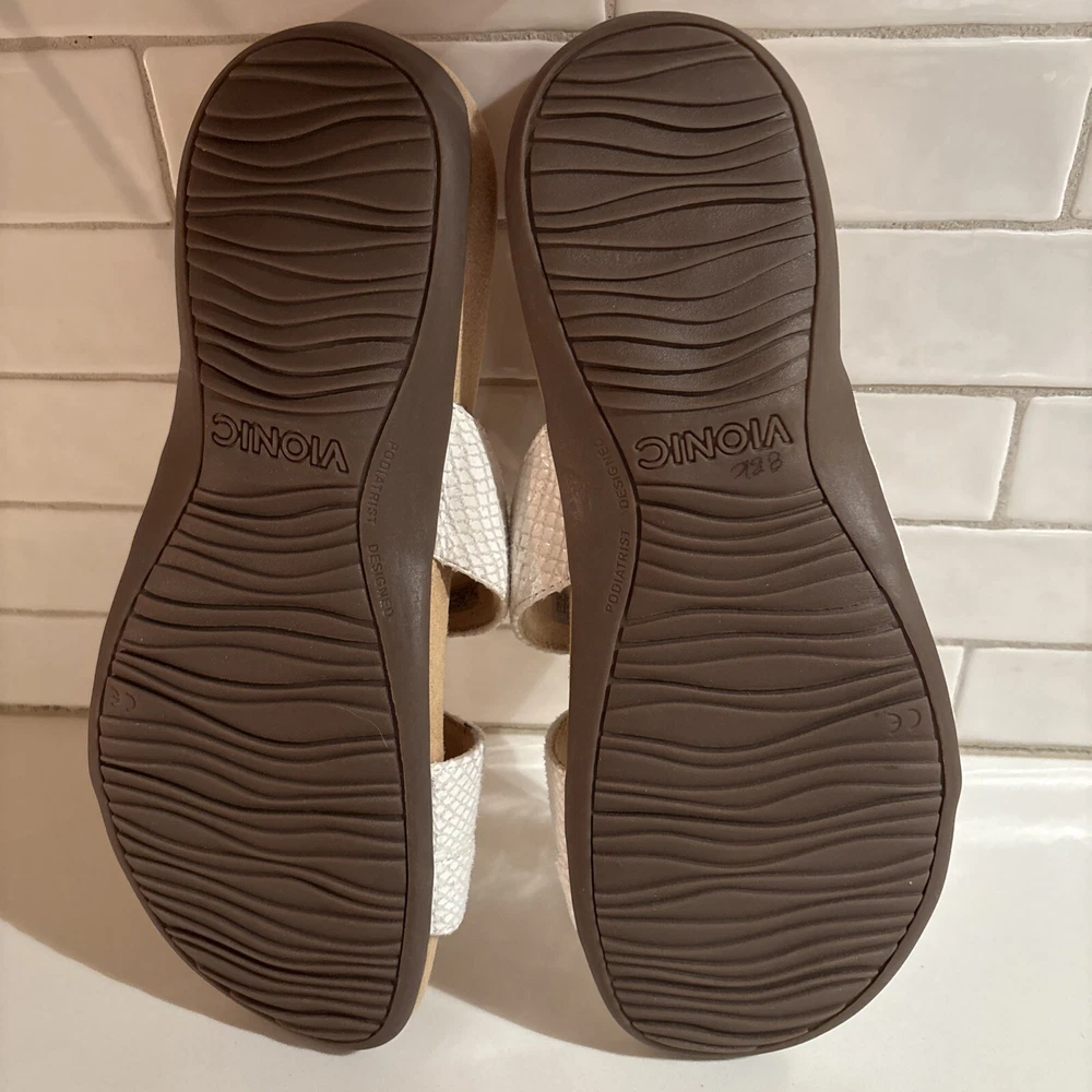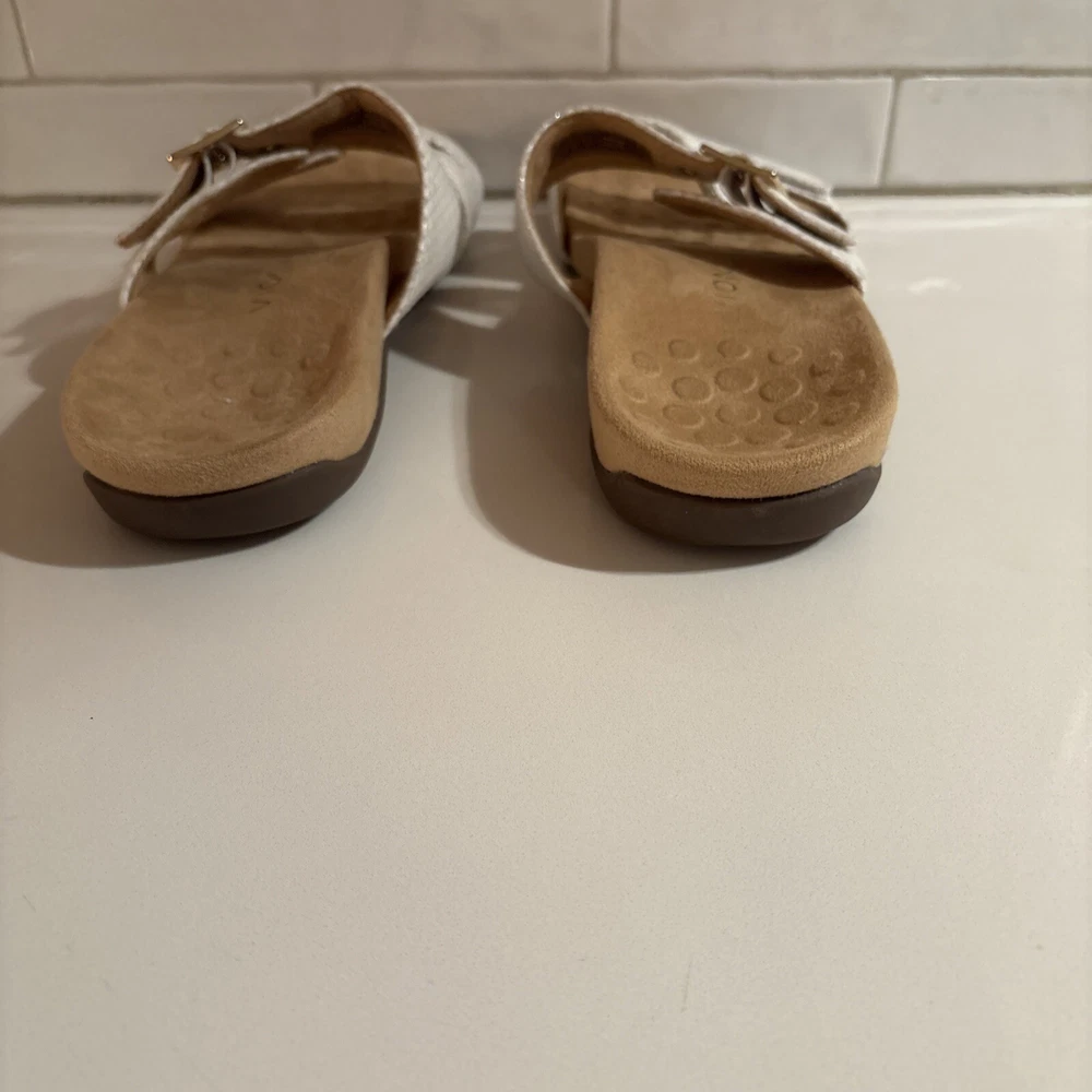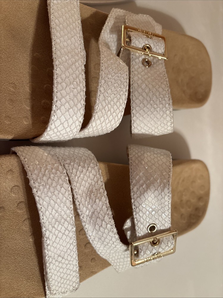 The Vionic Skylar leather sandals in size 11 for women feature a white color with gold buckle detailing. These slip-on sandals have a stylish design with straps and a cushioned insole for added comfort. The upper material is made of leather, giving the sandals a durable and high-quality feel. Perfect for a casual or dressy look, these Vionic sandals offer both style and support for all-day wear. Beautiful sandal with extreme comfort
