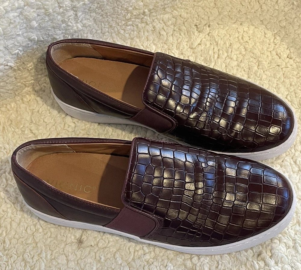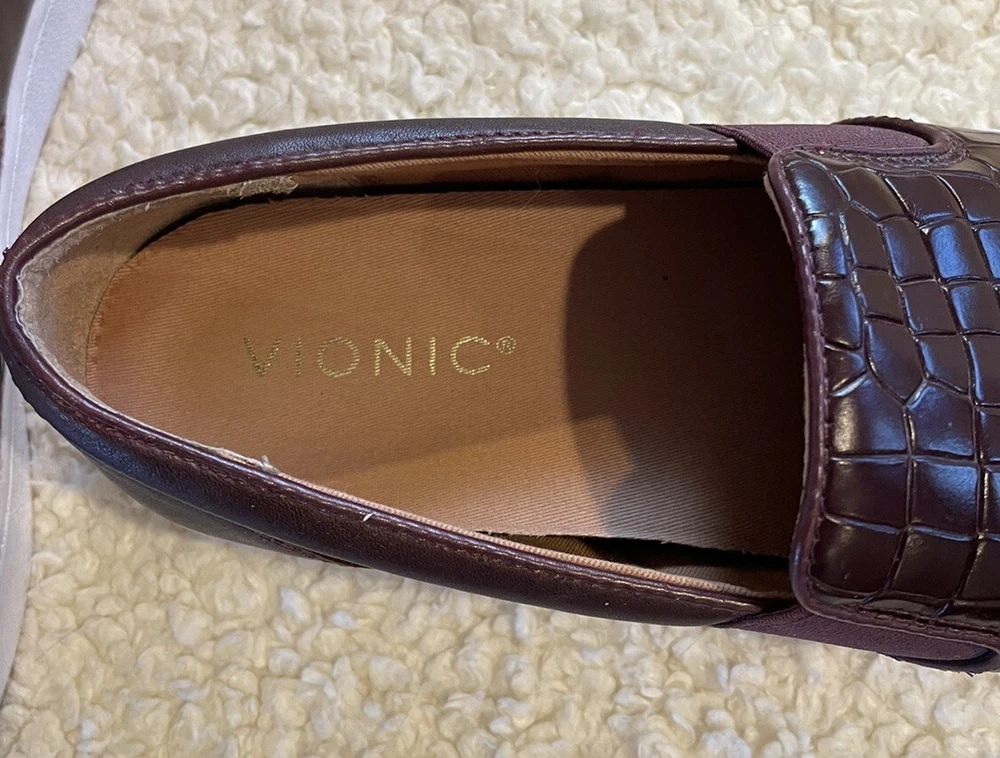 These Vionic Demetra slip-on shoes feature a stylish croc-embossed wine brown leather upper with a comfortable foam insole and soft leather lining. Designed for women in US size 8 (UK size 6, EU size 39), these casual loafers have a standard width and a durable rubber outsole. Perfect for everyday wear, these Vionic shoes combine fashion and function for a versatile addition to any wardrobe. From a smoke free home