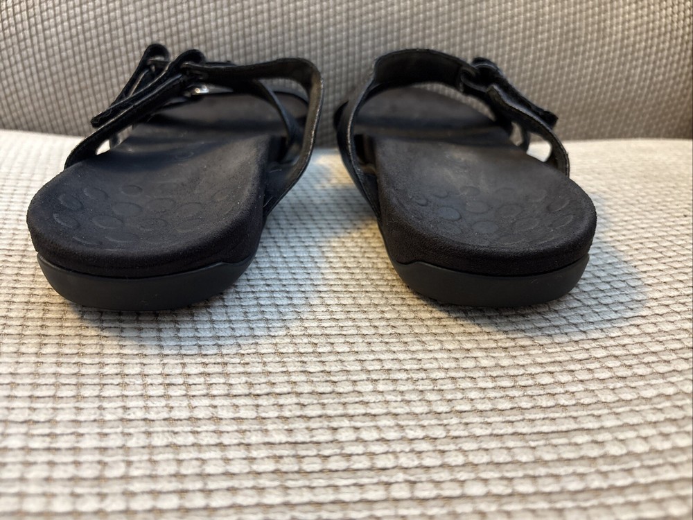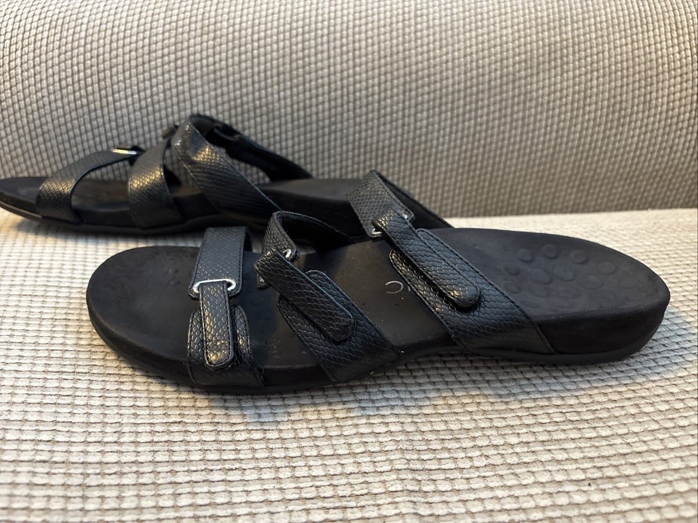These Vionic women's sandals in black feature a slip-on style with three adjustable straps for a secure and comfortable fit. With a flat heel and a snakeskin pattern accent, these sandals are perfect for casual occasions during the summer and spring seasons. The model, Aubry, is designed with a lightweight and comfortable construction, making them an ideal choice for everyday wear. The sandals are a size 10 in US, 8 in UK, and 42 in EU, with a medium width.