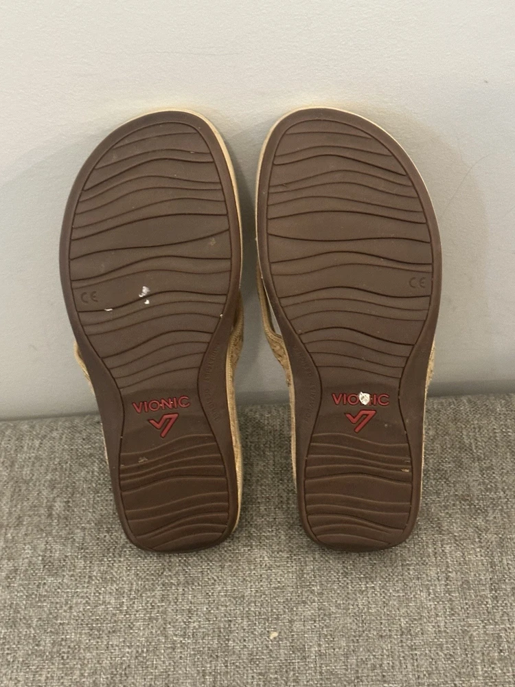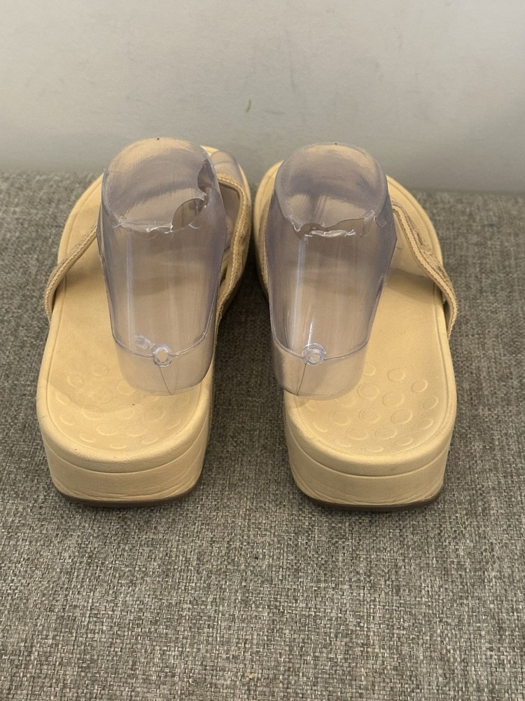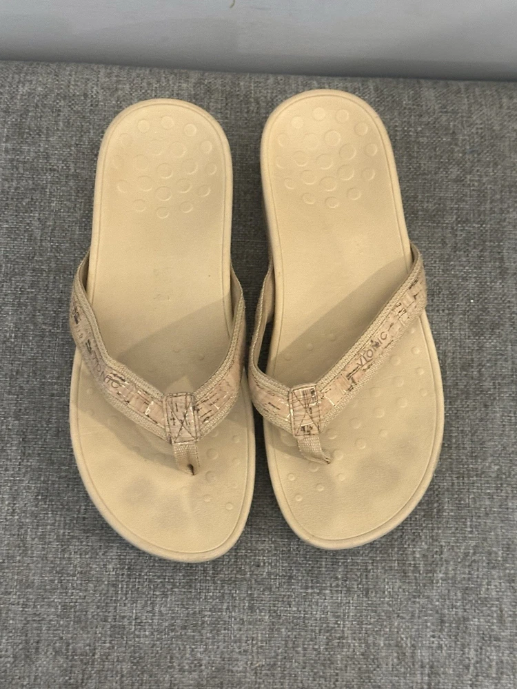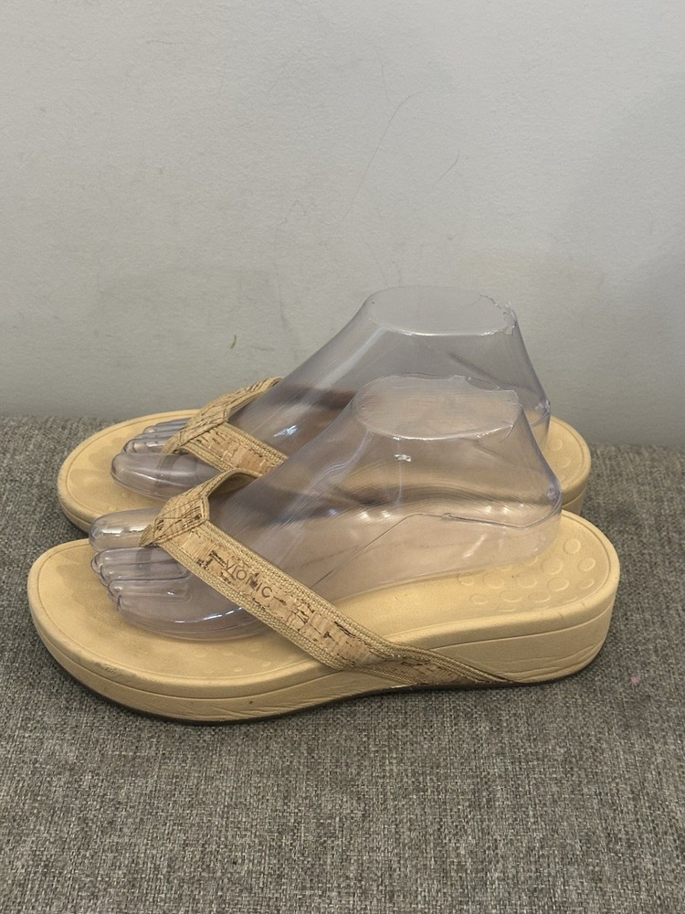 The Vionic Women's High Tide platform sandals in tan cork color size 10 are stylish and comfortable sandals for women. These slip-on sandals feature a mid-height wedge heel and a solid brown color with a thong style design. With arch support and orthopedic features, these sandals are designed for comfort and provide a trendy logo accent. The synthetic upper material and flop character make them a great choice for everyday wear, perfect for women who want both fashion and functionality in their footwear. Preowned Good Condition