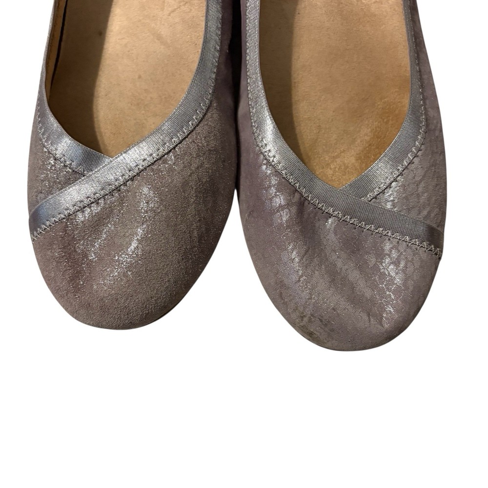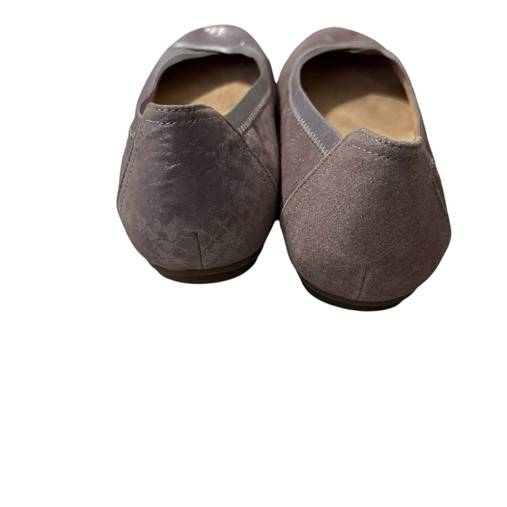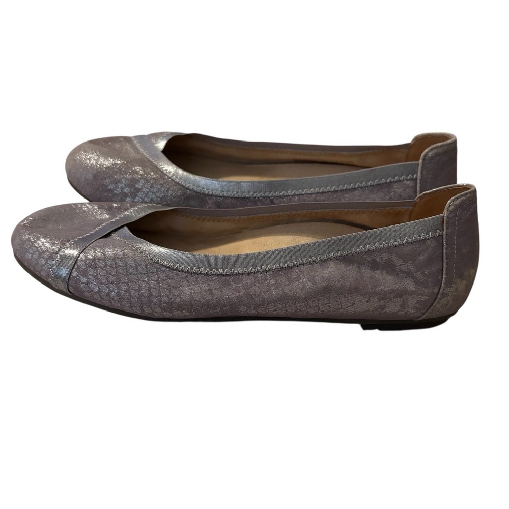 The Vionic Women’s Spark Caroll Pewter Leather Ballet Flats in size 7 are stylish and comfortable slip-on shoes perfect for everyday wear. With a solid silver color, round toe shape, and wide shoe width, these flats offer excellent arch support and cushioning, making them ideal for all-day comfort. The ballet style design with a city and preppy theme adds a touch of sophistication to any outfit, while the leather material ensures durability and quality. Perfect for the summer, fall, and spring seasons, these Vionic flats are a must-have for any fashion-forward woman's shoe collection.