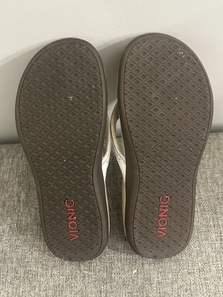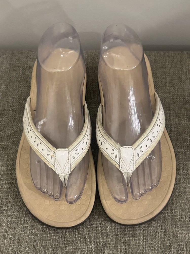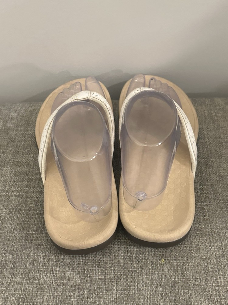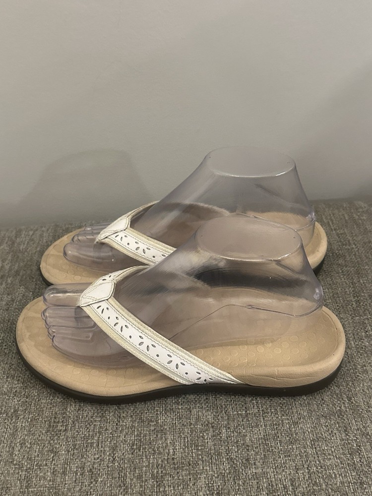 The Vionic Women's White Leather Slip On Thong Sandal in size 7 is a comfortable and stylish choice for women. With a low heel height and flat heel style, these sandals provide arch support for all-day wear. The slip-on design and thong style make them easy to wear and take off, while the solid white color and logo accents add a touch of chicness to any outfit. Made with leather upper material, these sandals are durable and perfect for everyday use. Preowned Good Condition